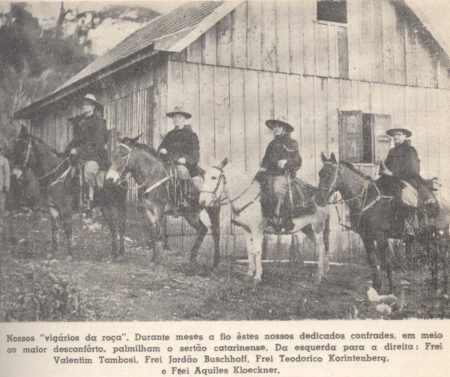 Mas, o que caracteriza e marca, também na atualidade, enquanto atuação e volume, são as atividades hoje reunidas sob a denominação de Frente das Paróquias e Santuários, principalmente sob o guarda-chuva “Paróquias”. Percorrendo depoimentos, relatos e crônicas publicados em Vita Franciscana (1923-1941) e Vida Franciscana (1942 até os dias atuais) – e tão-somente neste vículo de comunicação –, chega-se facilmente a esta evidência. Ademais, ao fazer este percurso, imagina-se que todas as pessoas, ou quase, se impressionam com a dedicação e o pioneirismo dos frades. Basta levar em conta, para início de conversa, as dimensões geográficas a transpor – dimensões mairores do que as da Bélgica, afirmava Dom Frei Carlos, incluindo a extensão territorial da Prelazia de Palmas, de onde os frades partem também para o Oeste catarinense.[7] Pode-se prosseguir, avaliando os meios de sobrevivência, de abrigo e locomoção por dias a fio, normalmente em lombo de mula ou burro (até cerca de 50-60 anos atrás), às vezes sem estradas, mesmo mal traçadas ou de chão batido.[8] Podem ser considerados os enfrentamentos com liberais-maçônicos, em Lages, o desafio representado pela catolicismo tradicional brasileiro, pelas diferenças de cultura e linguagem e pela Guerra do Contextado. Os frades são pioneiros ou co-pioneiros na presença da Igreja católica e no desennvolvimento civilizacional da região. Encontram-se nos inícios das atuais dioceses de Blumenau, de Porto União-União da Vitória, de Lages, de Joaçaba, de Palmas-Francisco Beltrão, da Arquidiocese de Chapecó.