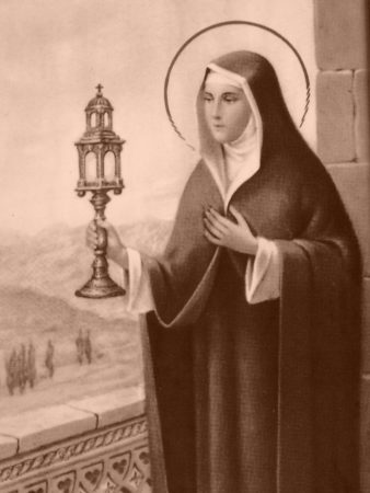 Conta-nos Frei José Carlos Pedroso no seu livro Santa Clara de Assis: “Por causa desse fato, até hoje as figuras mais comuns de Santa Clara mostram-na como uma freira segurando uma custódia. Custódia é aquela roda dourada, cheia de raios, que se usa nas adorações e nas procissões do Santíssimo Sacramento da Eucaristia. Mas as Irmãs que assistiram ao fato disseram que a Eucaristia foi levada em uma caixinha de marfim e prata, como era comum naquele tempo. As custódias ainda não estavam em uso”.