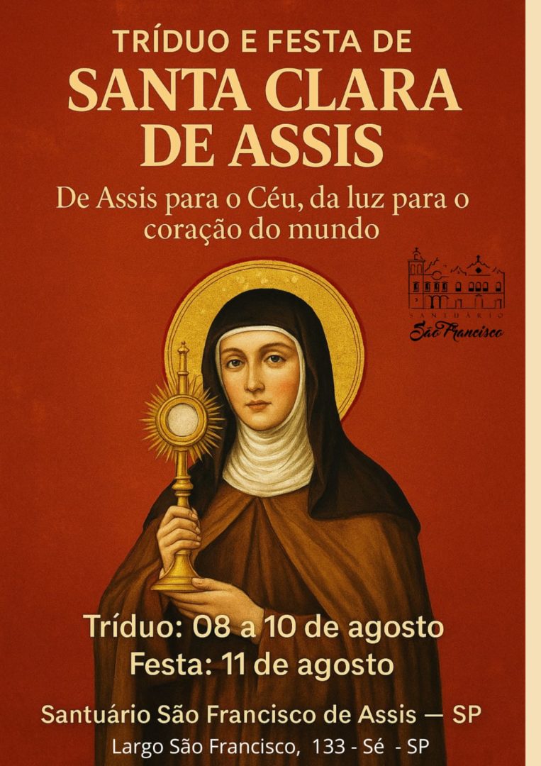 Santa Clara nasceu em Assis, em 1194.  Em 18 de março de 1212, saiu de casa e se consagrou a Deus na igrejinha de Nossa Senhora dos Anjos, a Porciúncula. De 1212 até a sua morte, aos 11 de agosto de 1253, viveu no silêncio e na contemplação em São Damião.