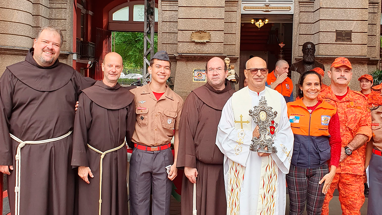 À tarde, foi a vez de visitar o Quartel General da PM. Ali, a acolhida foi liderada pelo Capelão Padre Renato Martins Gonçalves. Esteve presente no momento celebrativo, realizado no auditório do quartel, o Secretário de Estado de Polícia Militar e Comandante da Corporação, Coronel Marcelo Menezes. Na mensagem dirigida aos participantes, Frei Gustavo recordou que o lema da Polícia Militar do Rio de Janeiro, “Servir e Proteger”, é um programa de vida que deve ser assumido diariamente. Também agradeceu a todos pelo trabalho realizado, desejando bênção e proteção a todos os policiais e a seus familiares. Em todas as visitas, Frei Claudio Broca foi o responsável pela bênção e distribuição dos pães e também por pedir a bênção por intercessão de Santo Antônio utilizando o relicário que acompanha a peregrinação.
