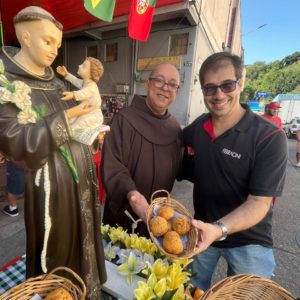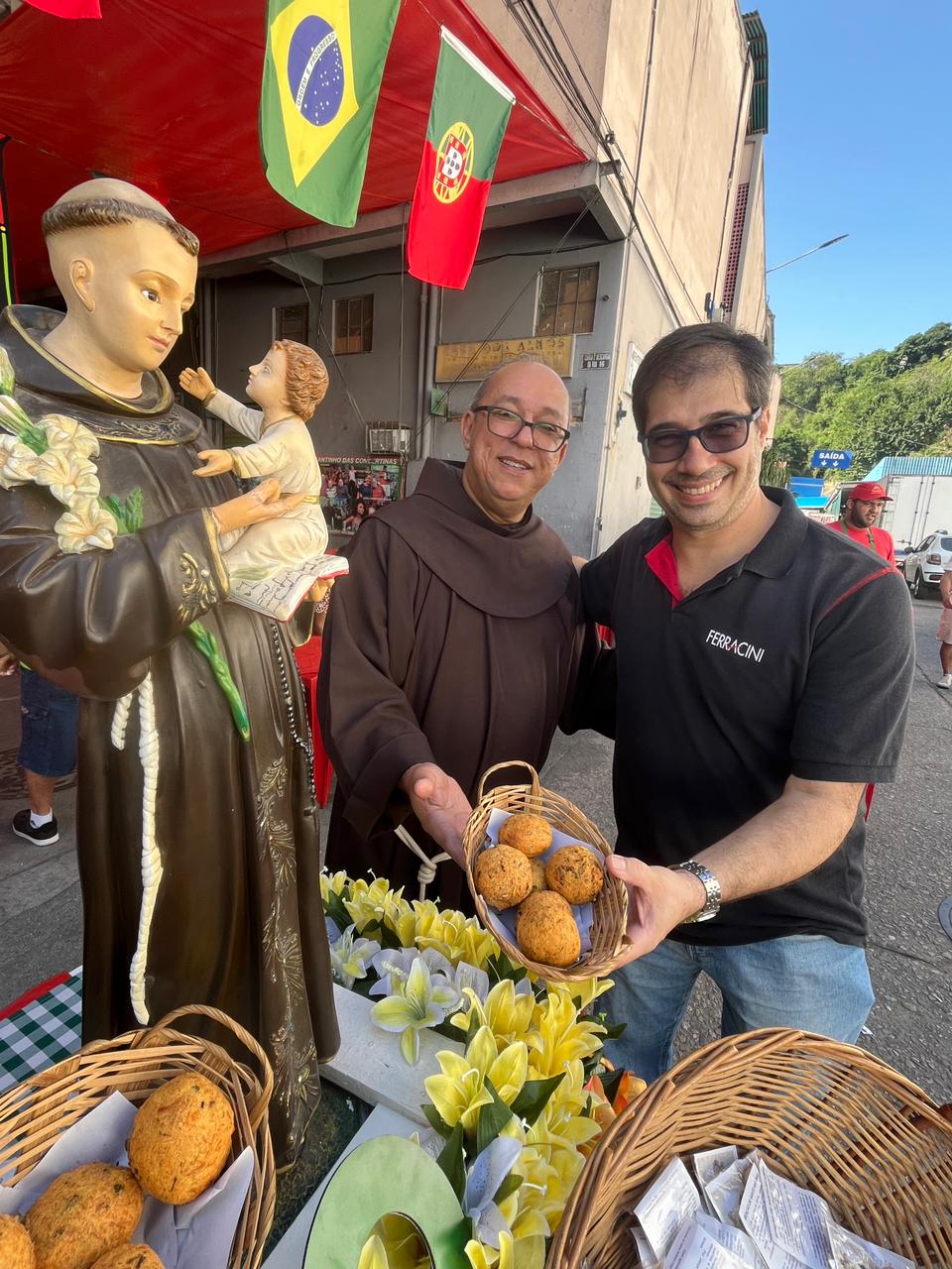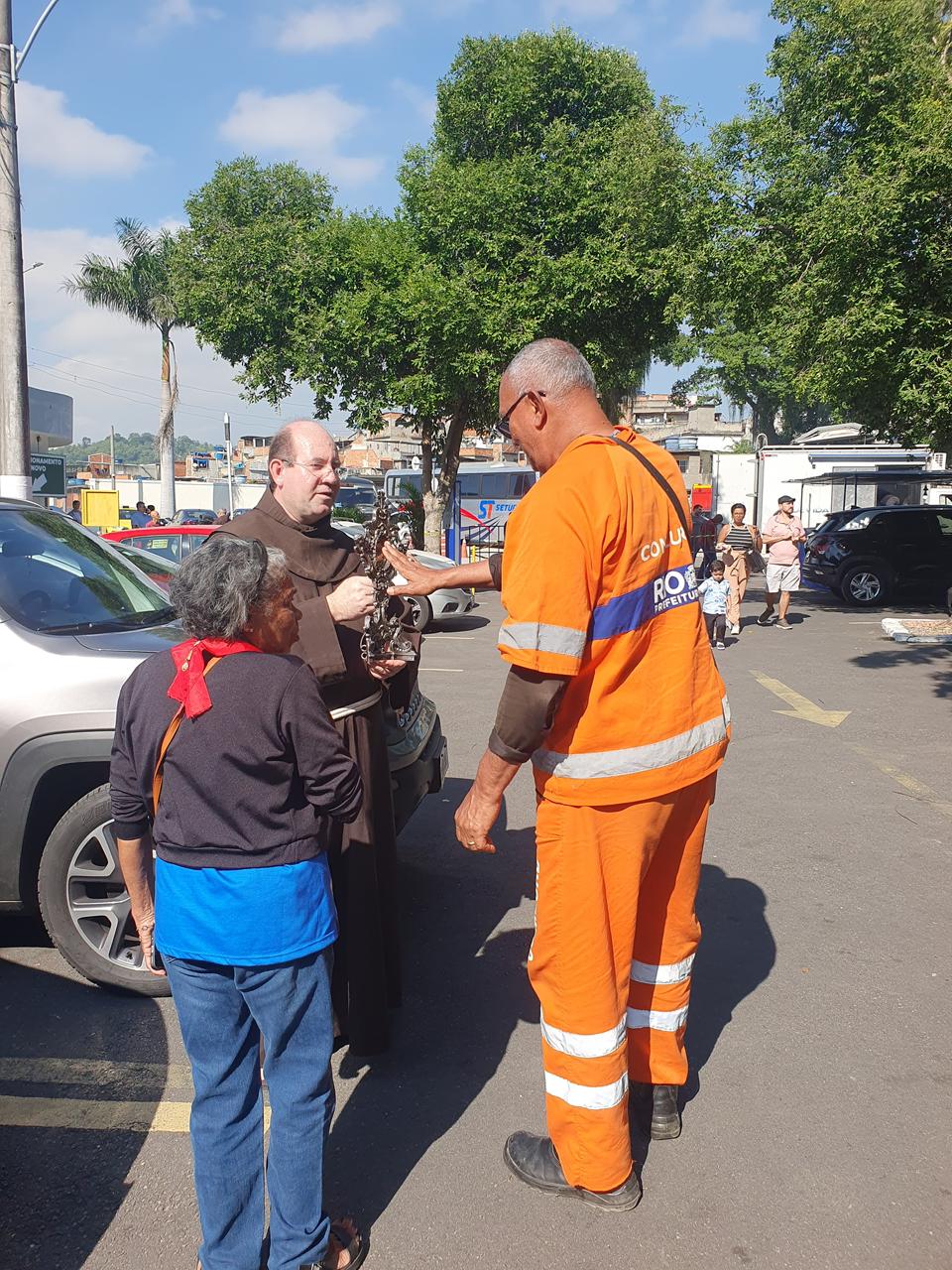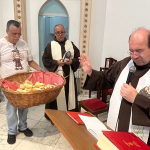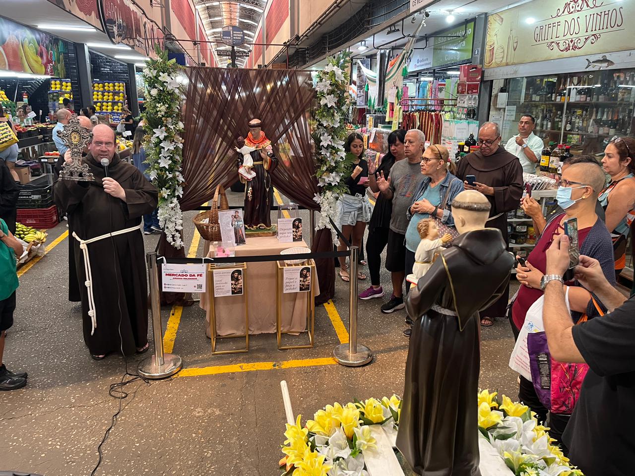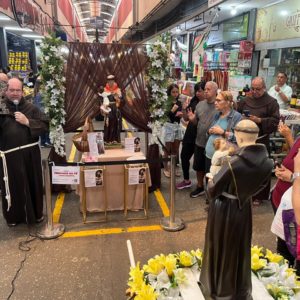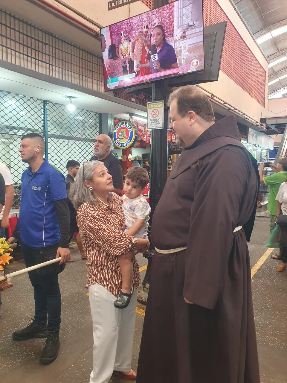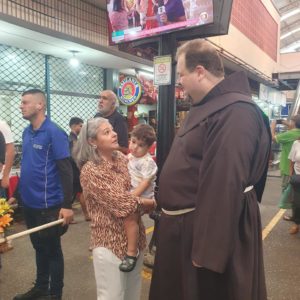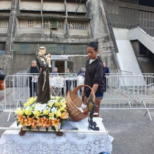 Logo após o envio, os frades seguiram com a imagem para o CADEG (Centro de Abastecimento do Estado da Guanabara), Mercado Municipal do Rio de Janeiro, no Bairro de Benfica, próximo à Penha. Acolhidos pelo Diretor Social, André Lobo, os frades fizeram uma pequena procissão com a imagem pela rua principal do mercado, parando junto à imagem de Santo Antônio que tradicionalmente é colocada no local durante o mês de junho. Ali, foi realizada uma bênção e a distribuição dos pãezinhos de Santo Antônio. Durante uma breve reflexão antes da bênção, Frei Gustavo destacou a importância do CADEG como lugar de cultivo das relações e da garantia de sustento para as famílias dos clientes e trabalhadores: “A bênção de Santo Antônio quer chegar a cada pessoa envolvida no dia a dia movimentado deste lugar tão importante para a nossa cidade”, reforçou.