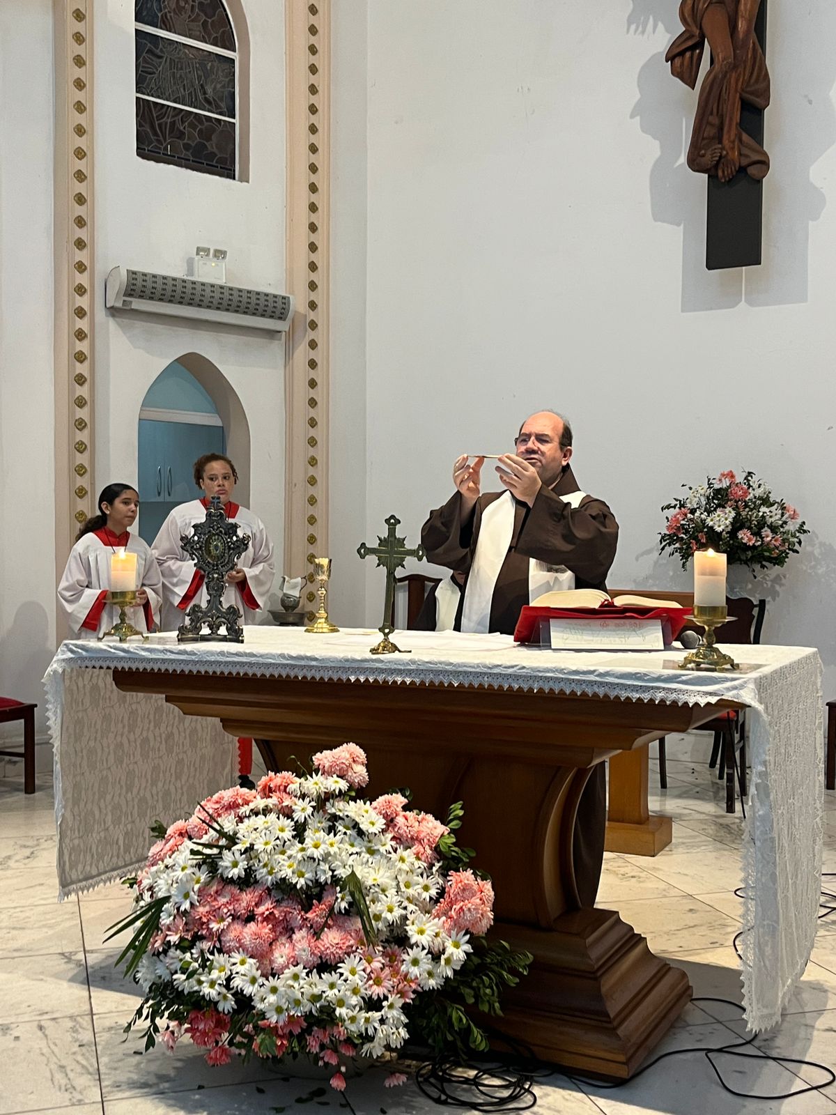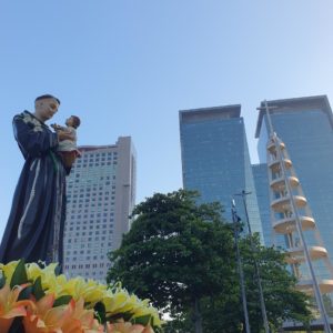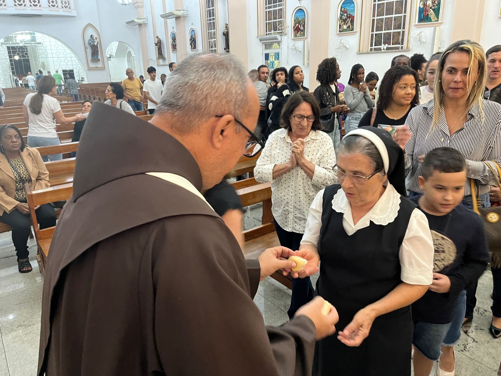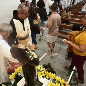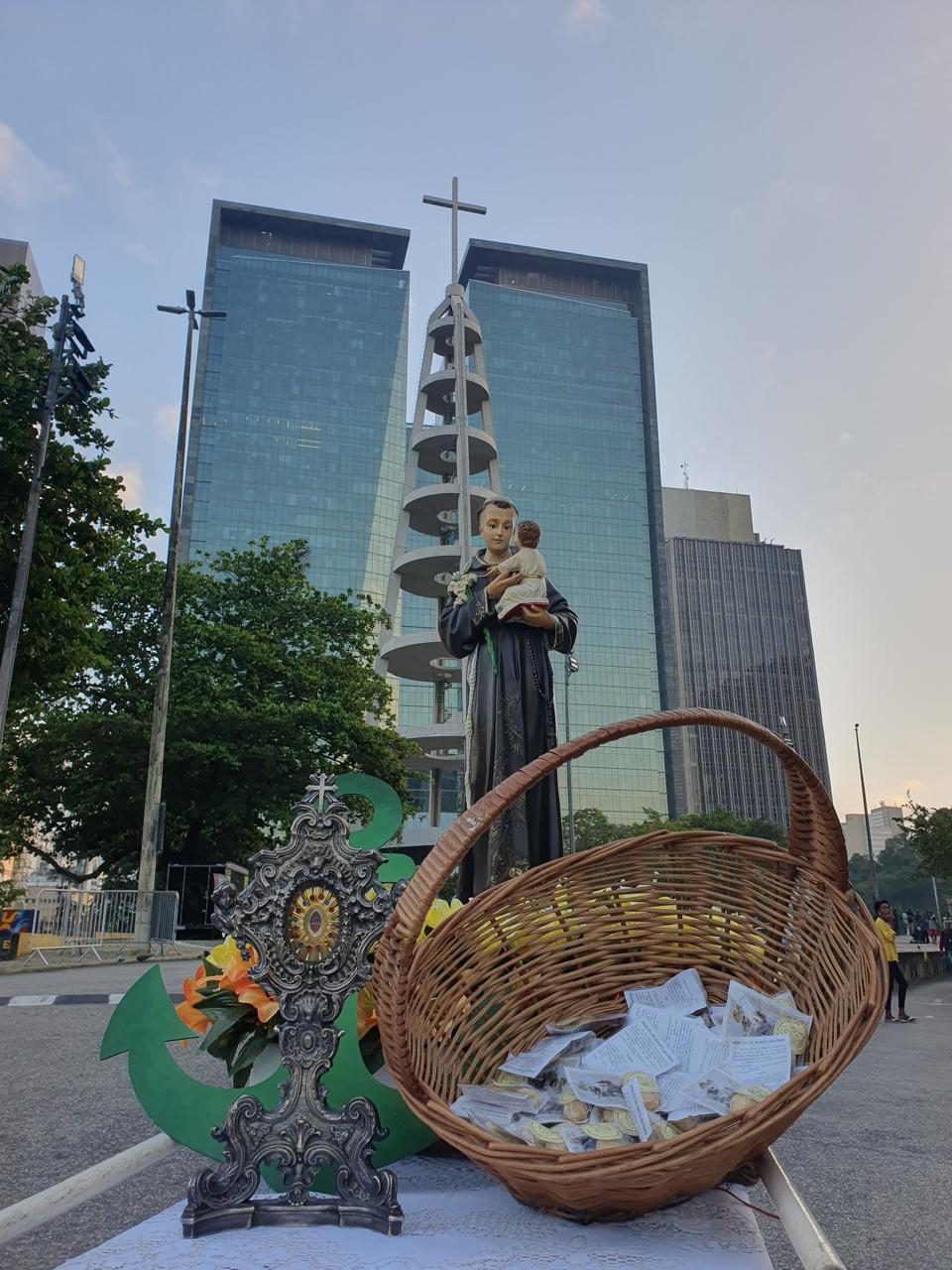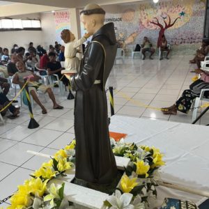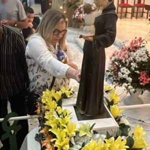 Para encerrar o segundo dia da Trezena e da Peregrinação, a imagem de Santo Antônio visitou a Paróquia São João Batista, em São João de Meriti. A presidência da celebração ficou por conta de Frei Claudio Broca, da Fraternidade do Convento. Logo após a saudação inicial e a acolhida do Pároco, Frei Jhones Lucas Martins, Frei José Francisco de Cássia dos Santos, também do Convento Santo Antônio, convidou os presentes a receberem a imagem peregrina de Santo Antônio: “Nós não viemos sozinhos, trouxemos conosco Santo Antônio, representado em sua imagem peregrina”, destacou. Além da imagem peregrina, durante a trezena os frades levam junto também a relíquia de Santo Antônio, um pequeno pedaço do osso do Santo, para a veneração dos fiéis. A relíquia do Convento Santo Antônio faz parte do acervo da casa há 101 anos, a serem completados no dia 13 de julho próximo. Nesta segunda-feira, a imagem peregrina visita de manhã o Gabinete do Prefeito do Rio, Eduardo Paes, e, na parte da tarde, o Hospital Municipal Souza Aguiar.