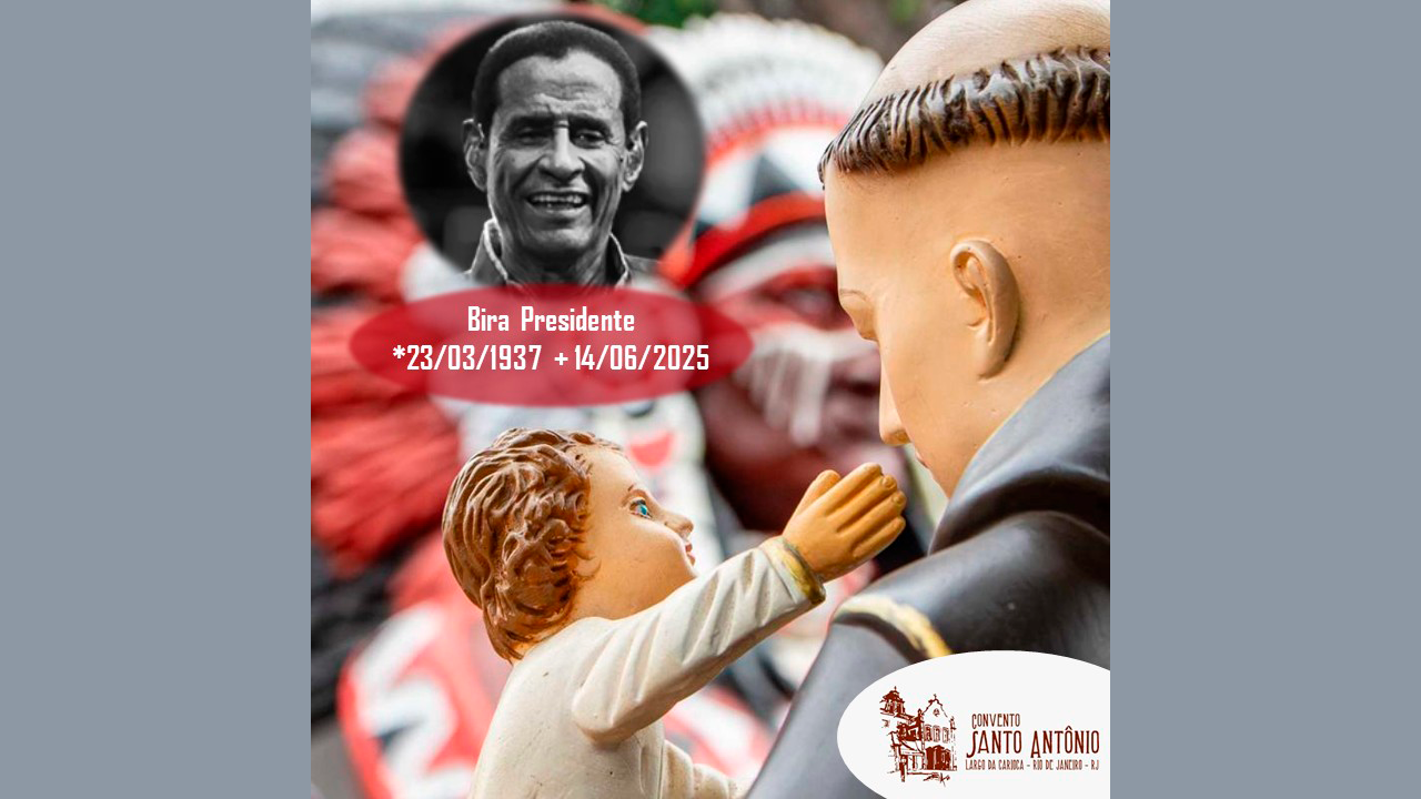 A Fraternidade do Convento Santo Antônio e os fiéis devotos se solidarizam com toda a família “Cacique de Ramos” por ocasião da partida do estimado Bira Presidente, baluarte da agremiação.