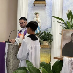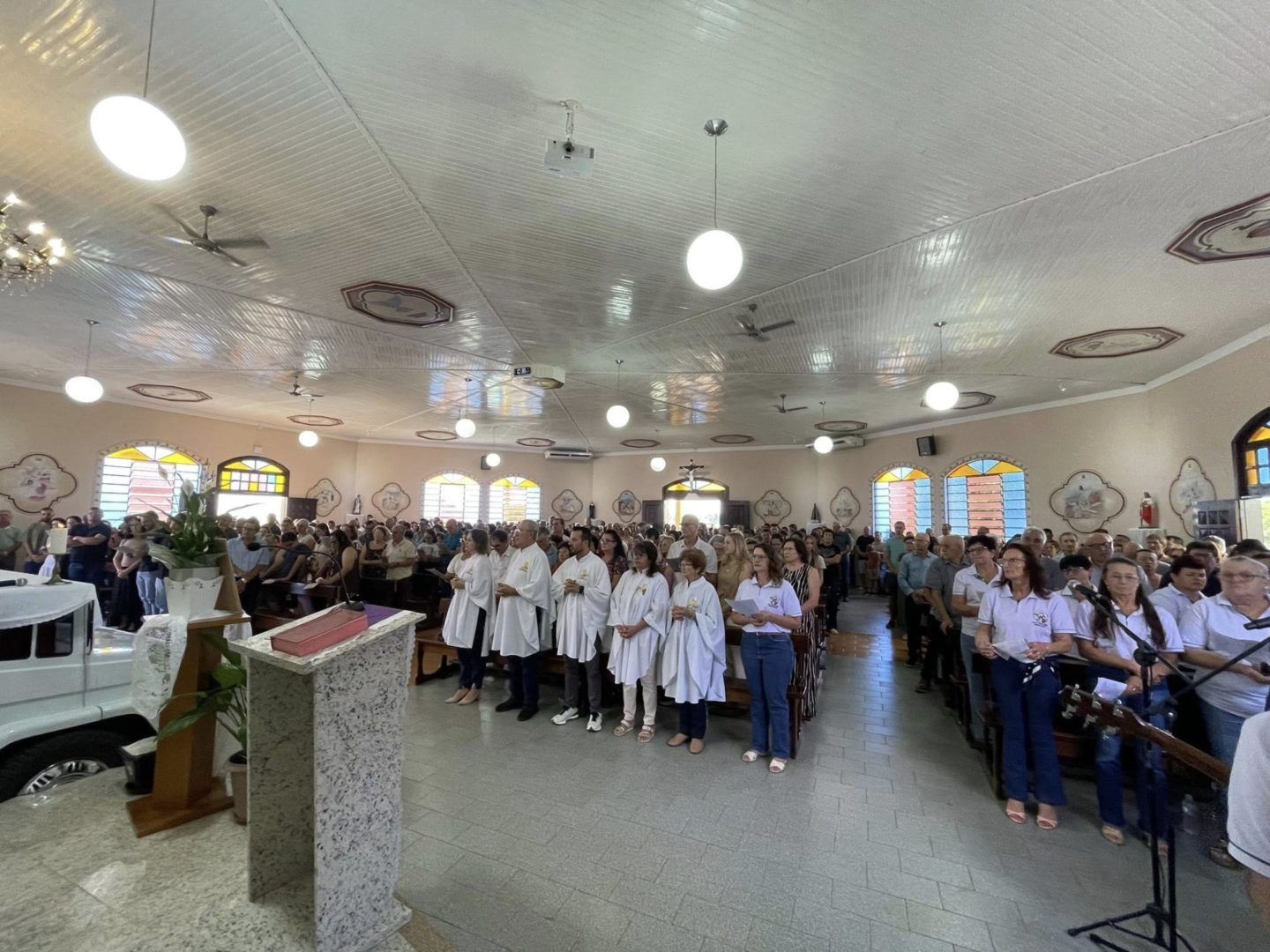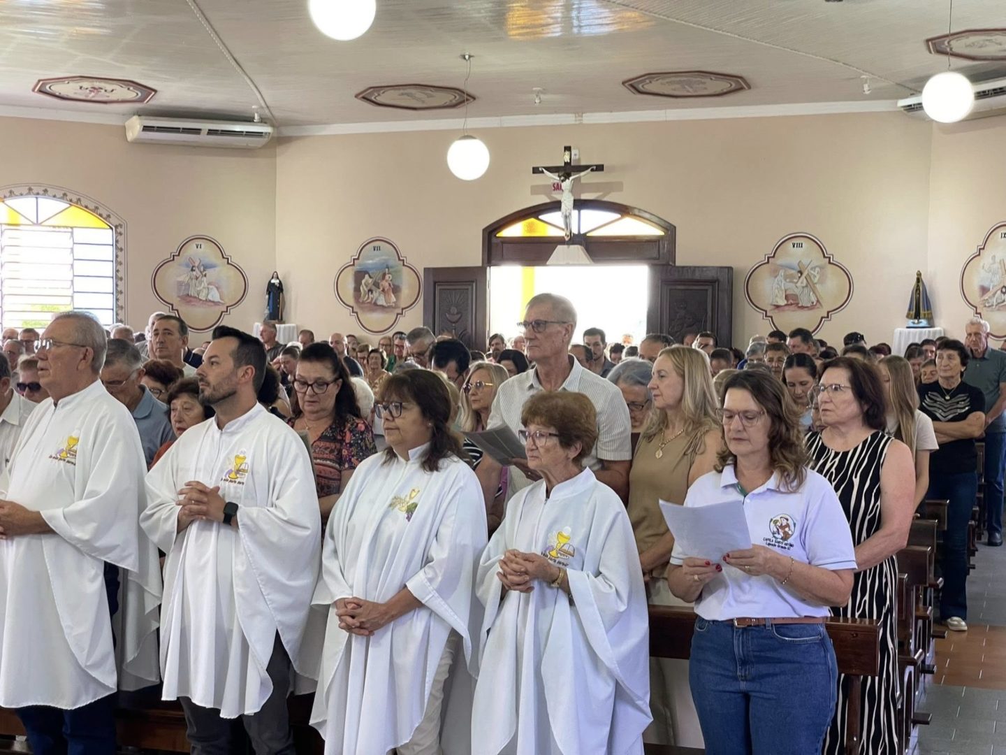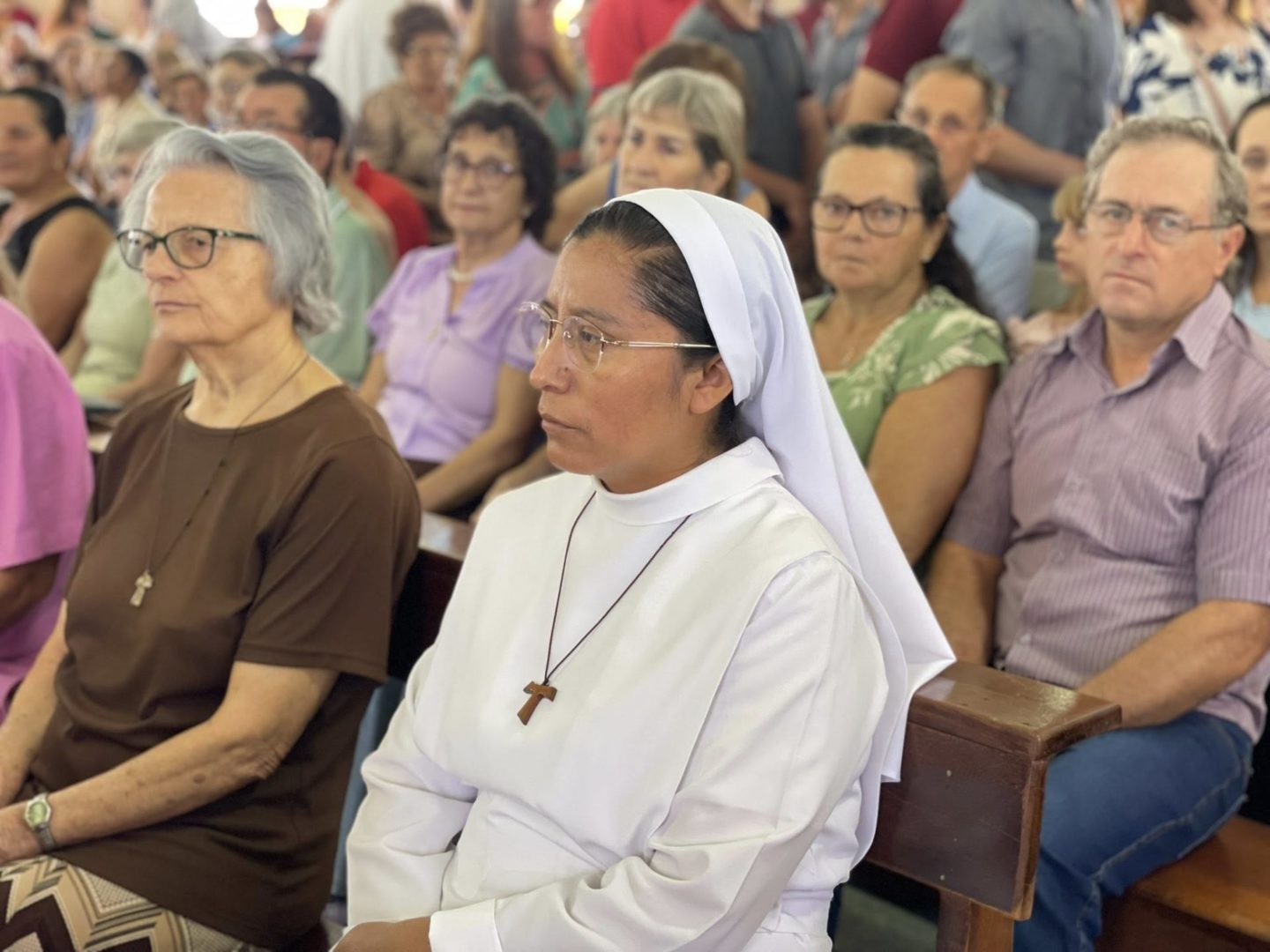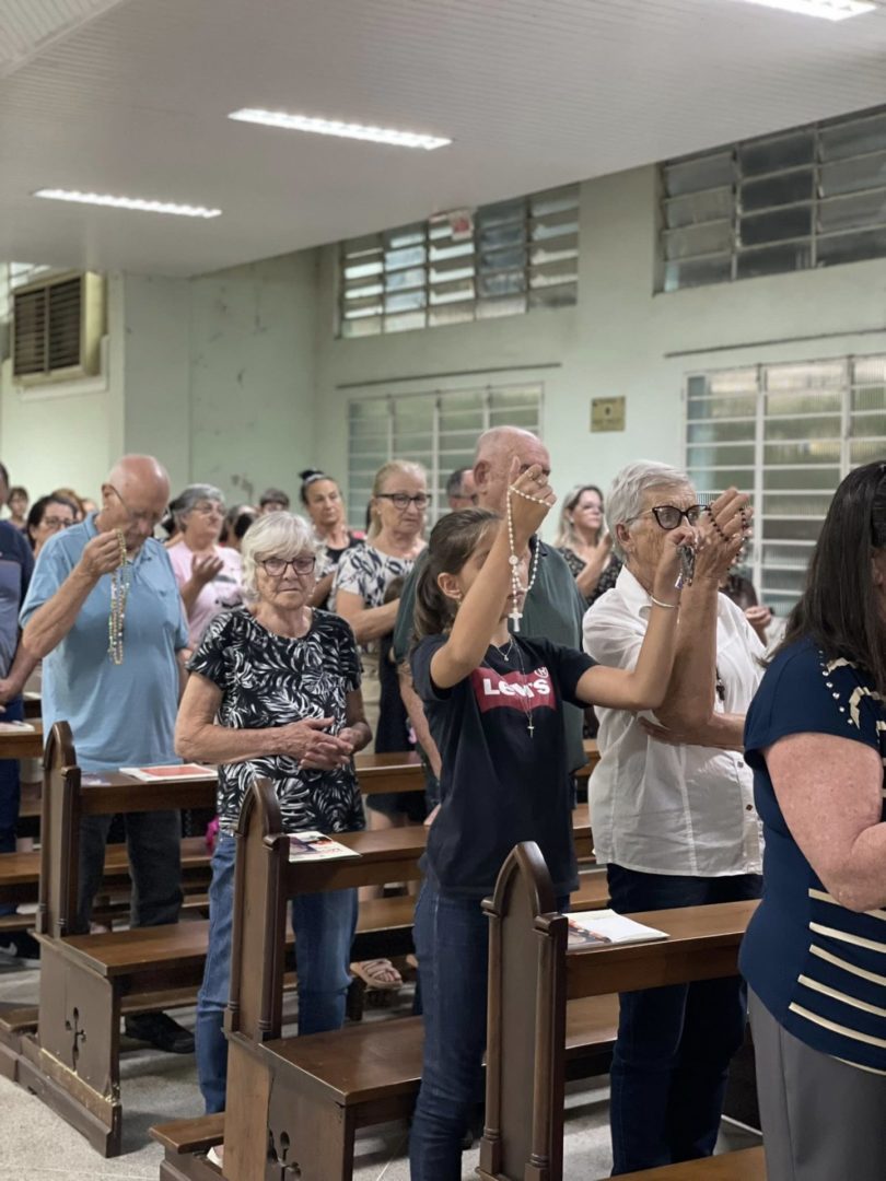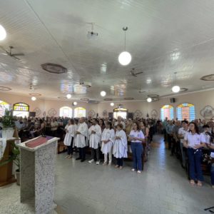 No momento do ofertório, foram recordadas as celebrações da semana. Pelo corredor central, a equipe levou alguns símbolos significativos: o guarda-chuva, o terço, o livro da catequese, além do pão e do vinho, como gesto de oferta e de súplica pela graça do Servo de Deus.