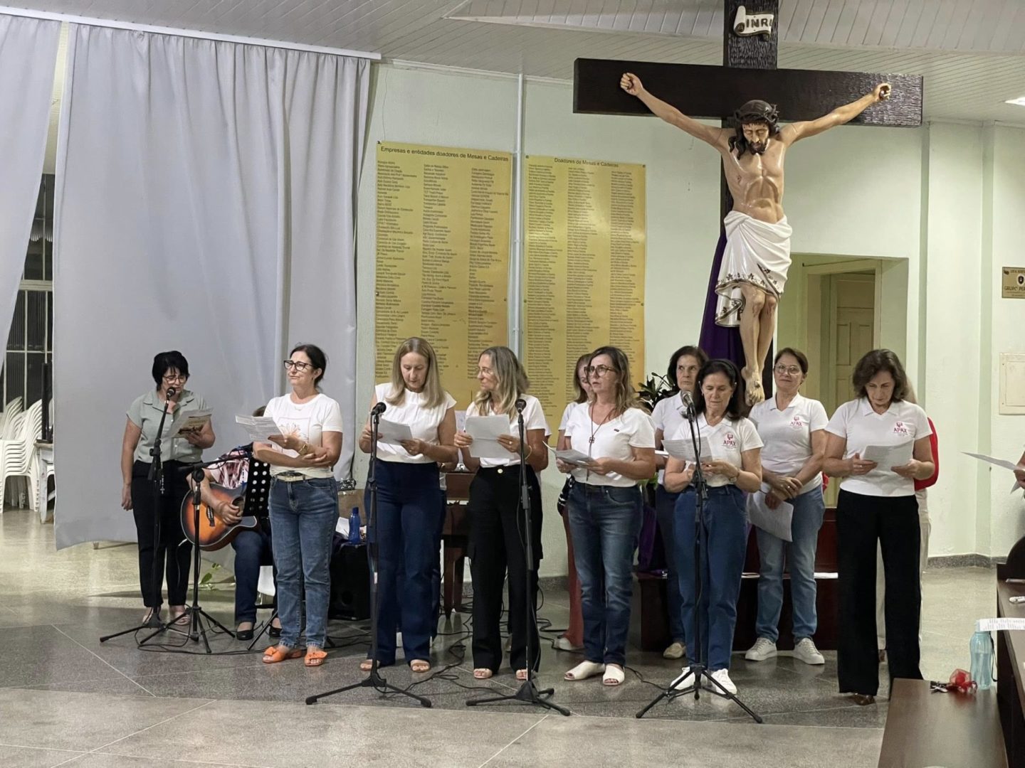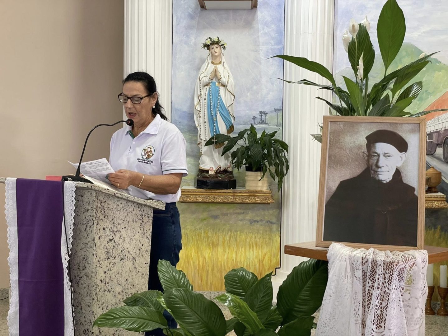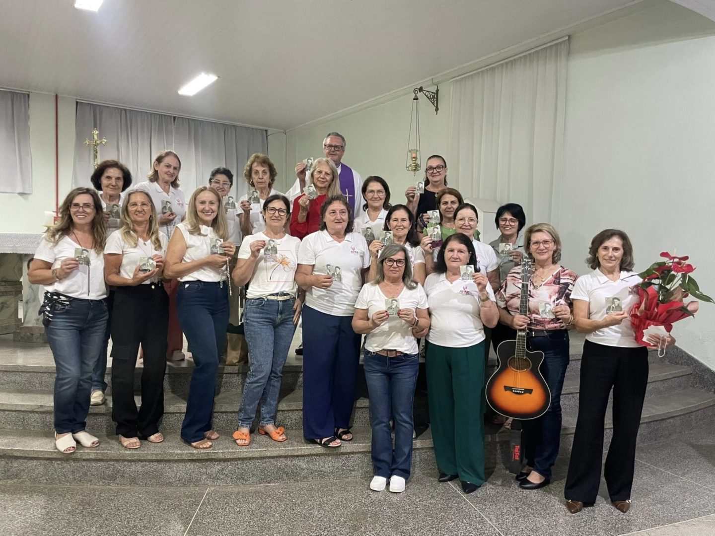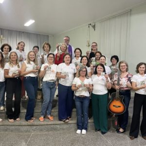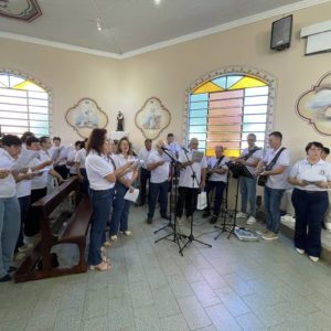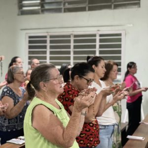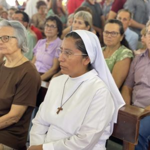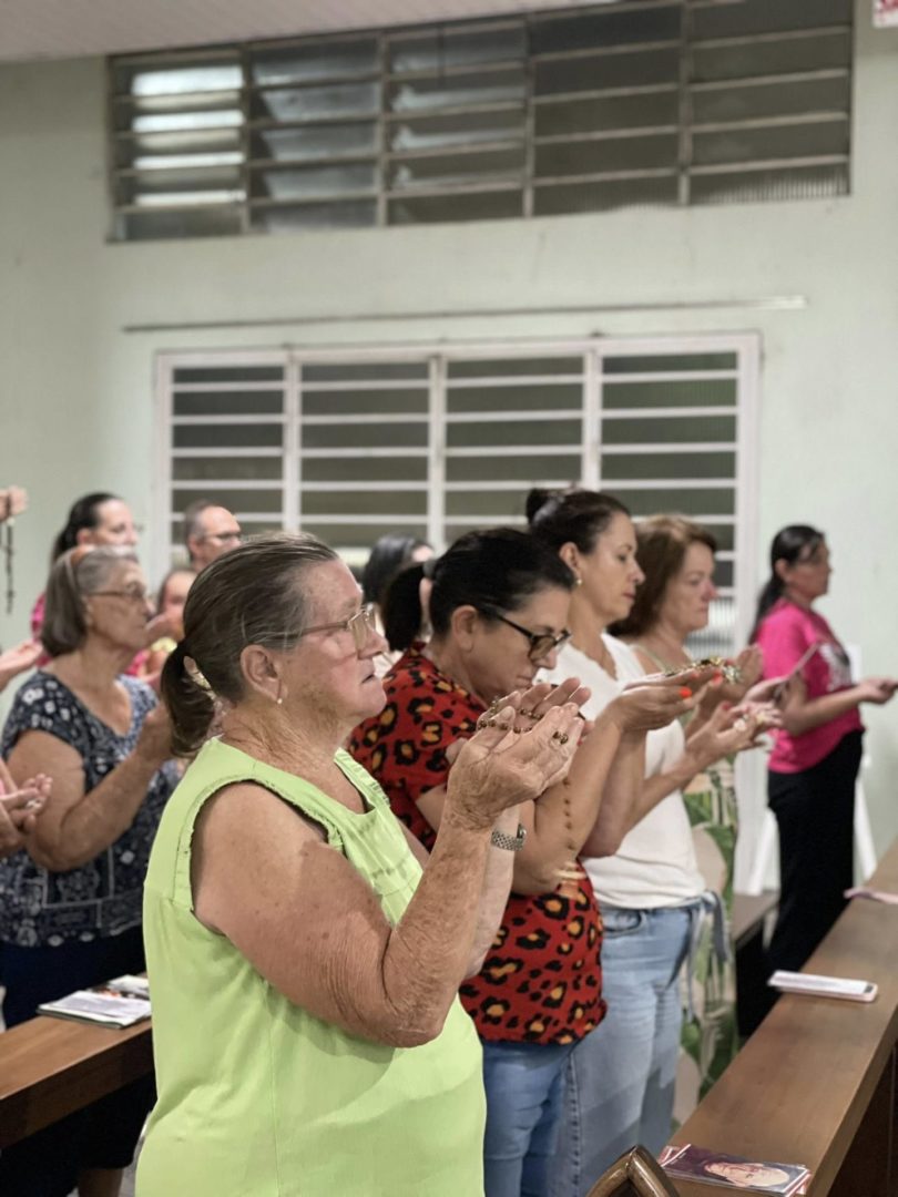 Recordando o Dia das Mulheres, Frei Gilson convidou todos a se colocarem de pé e, juntos, louvar Nossa Senhora com um belo canto, como forma simples, mas significativa, de homenagear cada mulher ali presente.