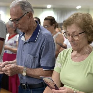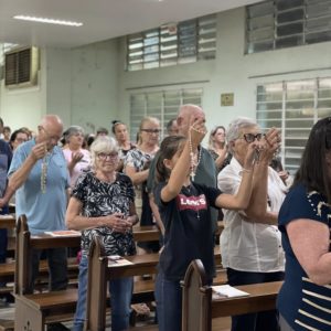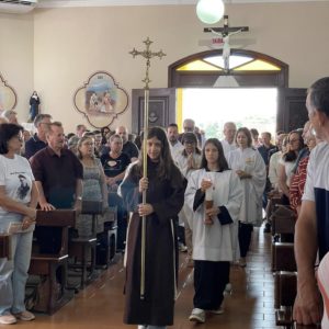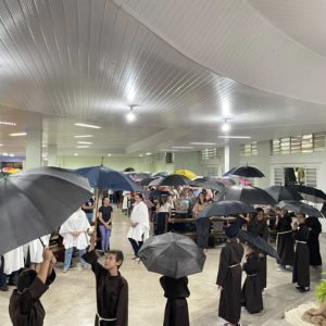 Por fim, Frei Jacir convidou todos os presentes para que segurassem os terços e os objetos de devoção para receber a bênção com a aspersão da água benta.