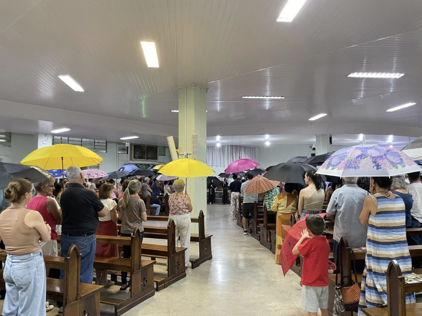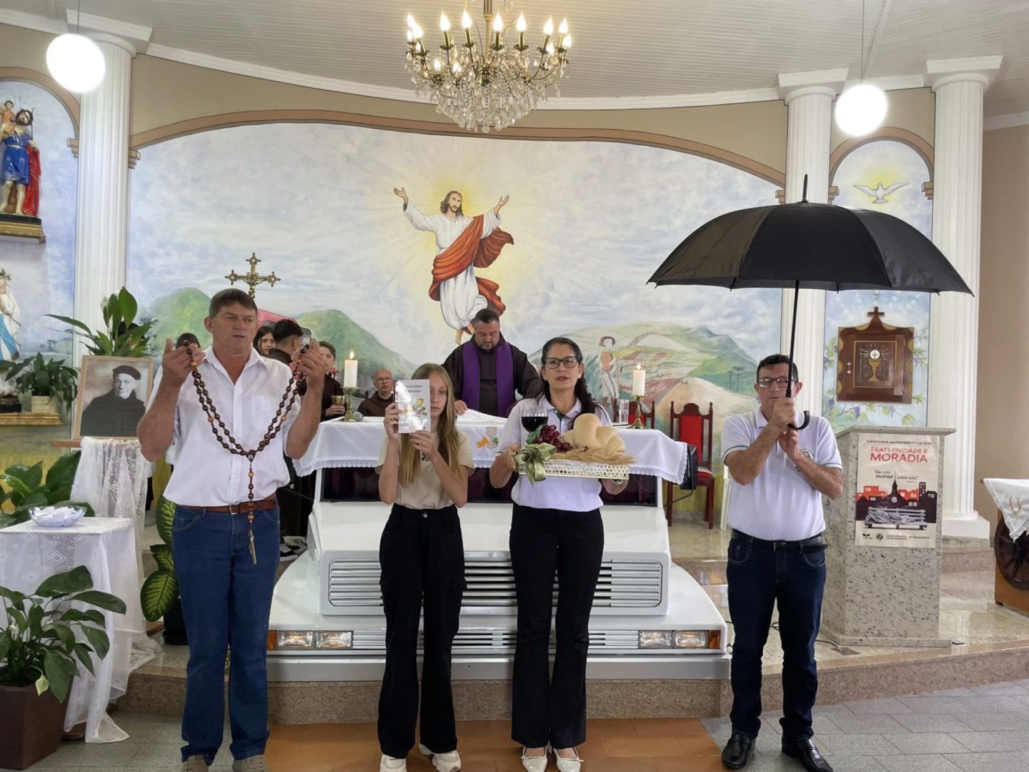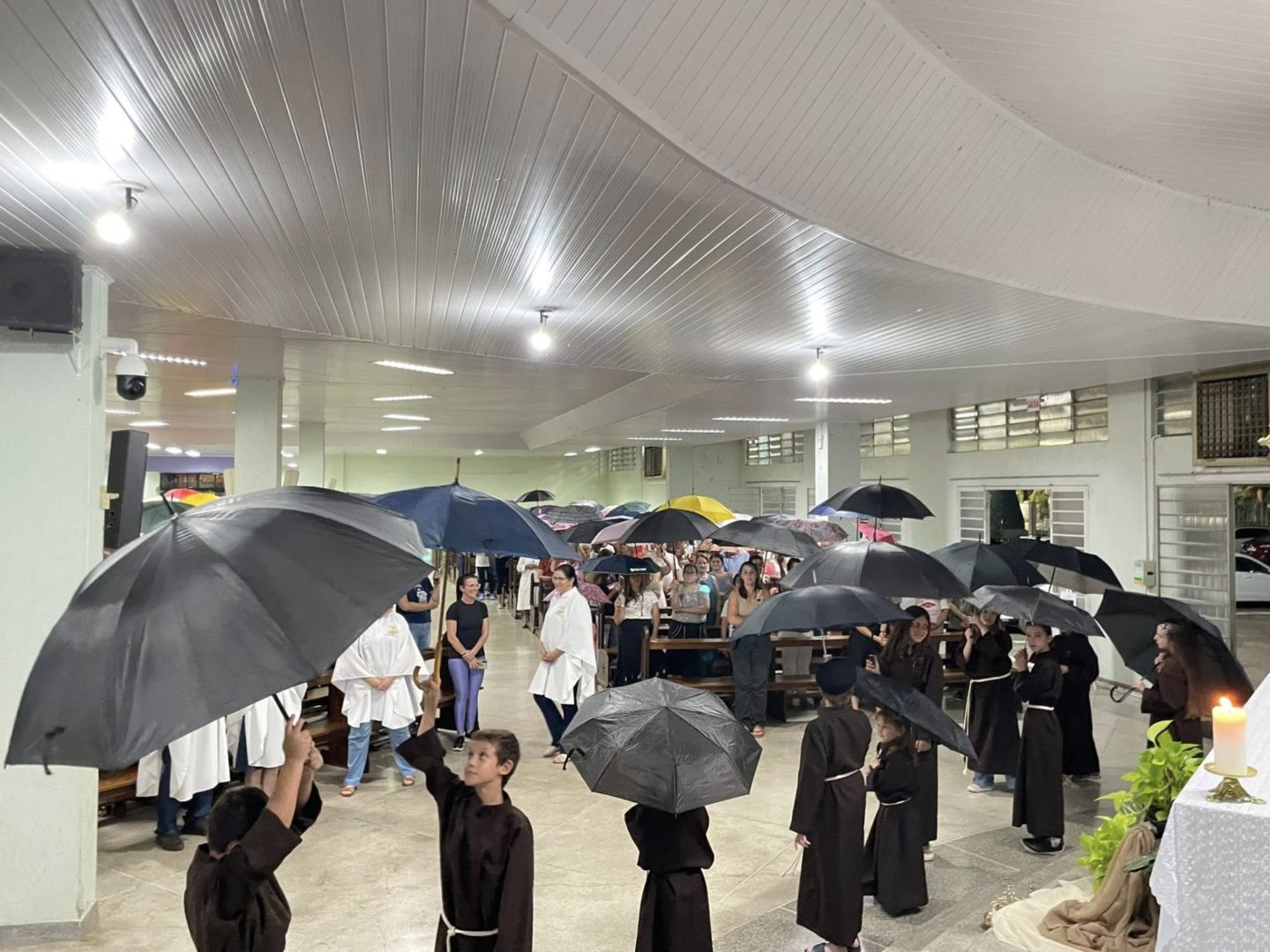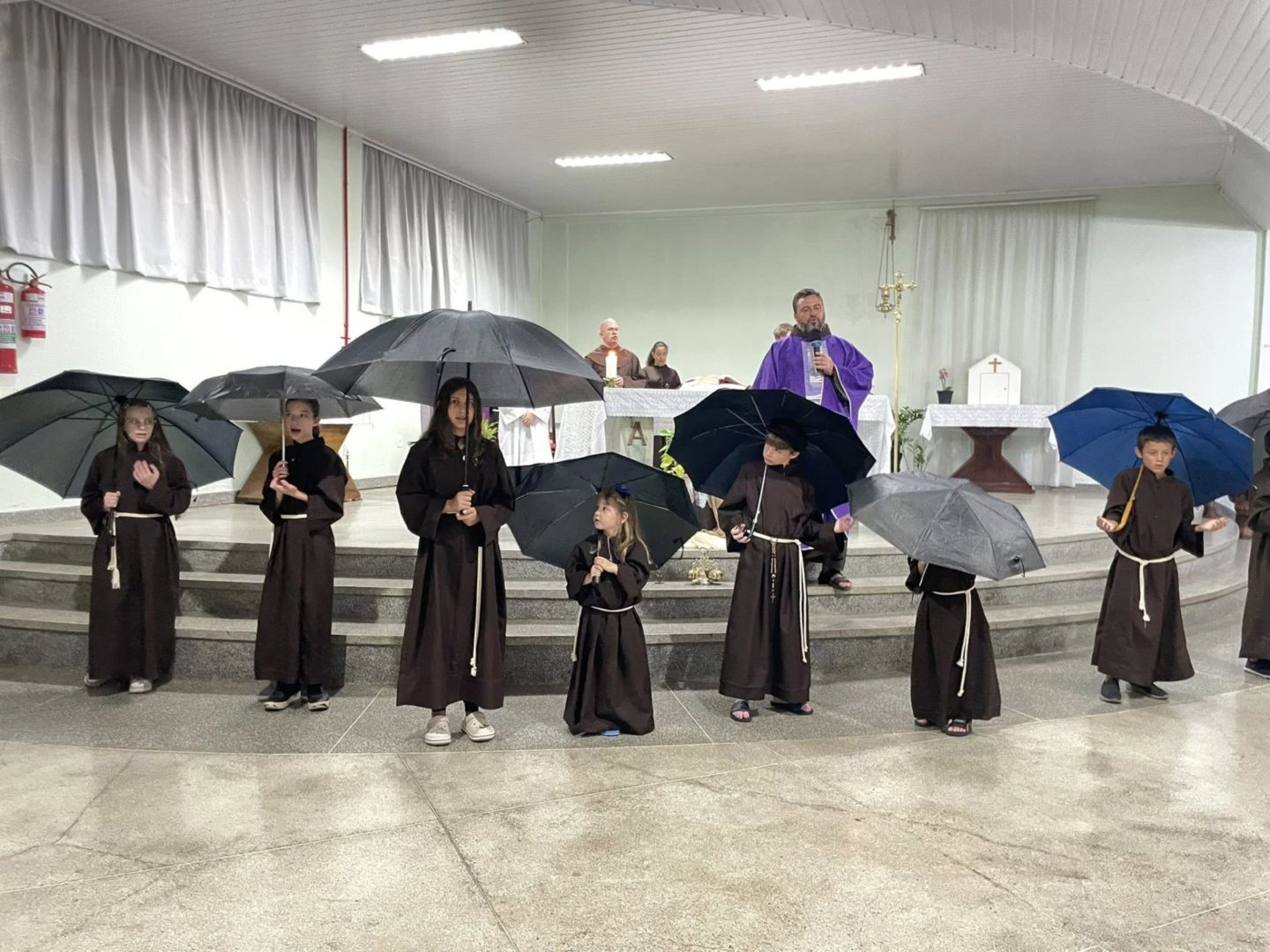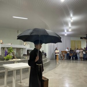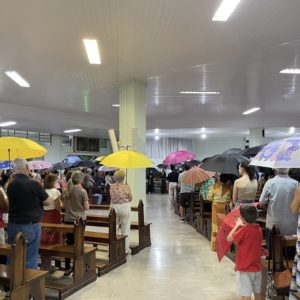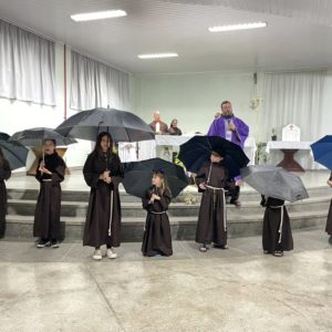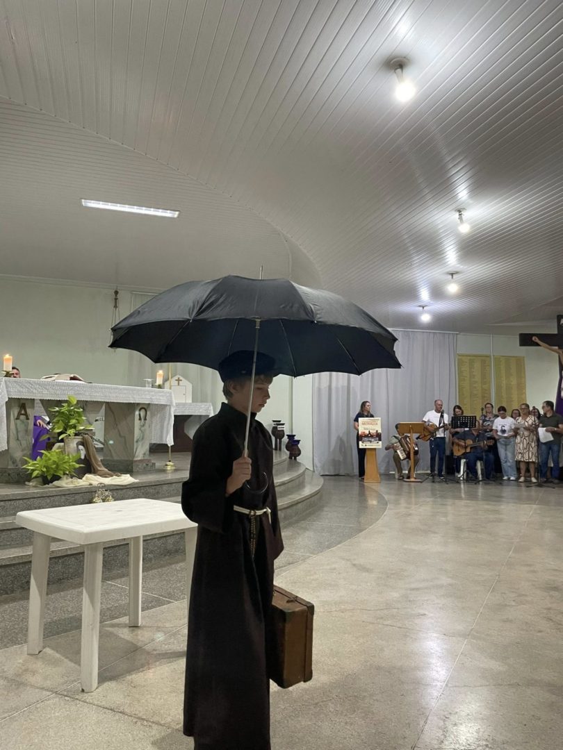 A Comunidade São Cristóvão apresentou, com os coroinhas, um pouco da história de Frei Bruno e sua missão no oeste catarinense. O encerramento ocorreu com a abertura dos guarda-chuvas, gesto também realizado pelos fiéis para receber a bênção.