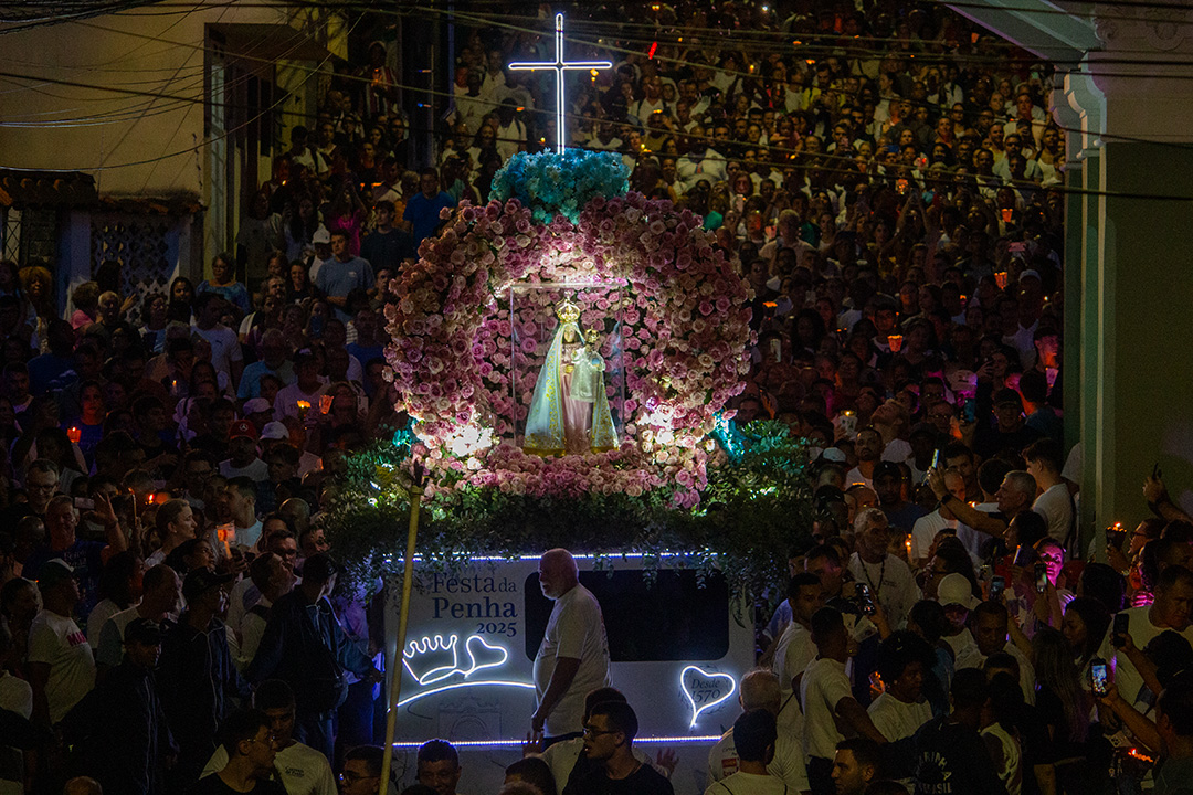 A Imagem de Nossa Senhora da Penha vem entronizada sobre o célebre “Penhamóvel”, modelo único e exclusivo, marca registrada da Festa da Penha. Sempre muito enfeitada com muitas flores e iluminada, destaca-se no meio da multidão, mas não fica parada. Caminha junto com o imenso número de filhos e filhas que vêm homenageá-la neste percurso de 14 quilômetros. A multidão pode chegar a um milhão de fiéis e devotos. As pessoas são extensão das flores que enfeitam o belíssimo andor. Cada caminhante é uma flor única e bela no Jardim de Nossa Senhora, que nunca se furtou em caminhar na companhia de seu povo. Na condução segura da Virgem, também conduzidos por Ela, os muitos voluntários da Corrente da Penha, incansáveis guardiães de Nossa Senhora neste percurso e em toda a movimentação da Imagem Peregrina durante a Festa da Penha.