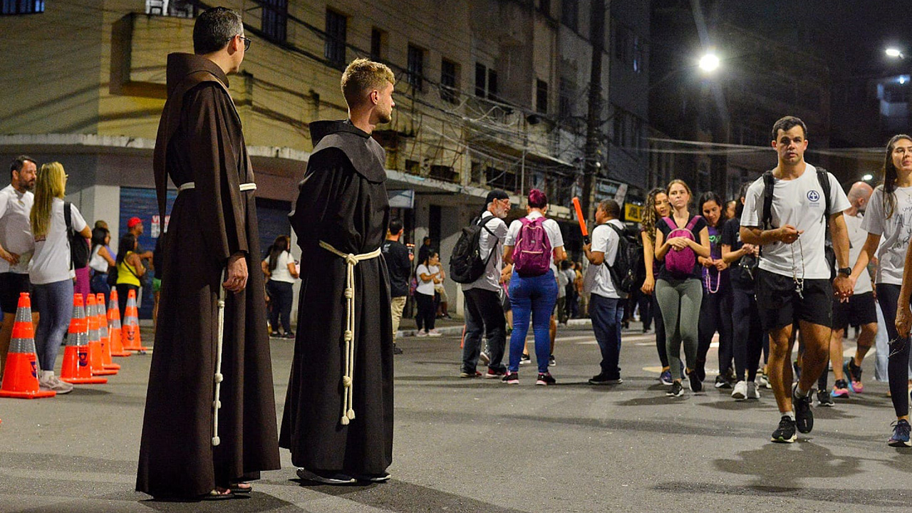 Vila Velha (ES) – A Romaria dos Homens teve início às 18h deste sábado, 26 de abril, na Catedral de Vitória, com Missa de envio presidida pelo Bispo Auxiliar da Arquidiocese de Vitória, Dom Andherson Franklin Lustosa de Souza, concelebrada pelo Guardião do Convento da Penha, Frei Gabriel Dellandrea, além de outros sacerdotes e diáconos. Logo após a celebração e a bênção de envio, a multidão partiu em caminhada. Dom Andherson e Frei Gabriel fizeram questão de caminhar juntos, lado a lado, com sinal da unidade entre a Arquidiocese de Vitória e a Província Franciscana da Imaculada Conceição do Brasil no cuidado desta imensa manifestação de amor e carinho a Mãe de Deus presente na história e no coração do povo Capixaba. Chegando à sua 70ª edição em 2025, a Romaria é tradição que passa de pai para filho, atravessando gerações. Também já se tornou com o passar dos anos, a “Romaria da Família. Neste ano, traz como proposta de reflexão a temática “Com Maria, peregrinos de esperança”. Para percorrer este caminho, neste ano estamos propondo alguns marcos de referência, aos quais denominamos “15 Lições da Romaria dos Homens” e que, esperamos, possam ajudar os leitores a uma experiência de aprofundamento na fé e na esperança.