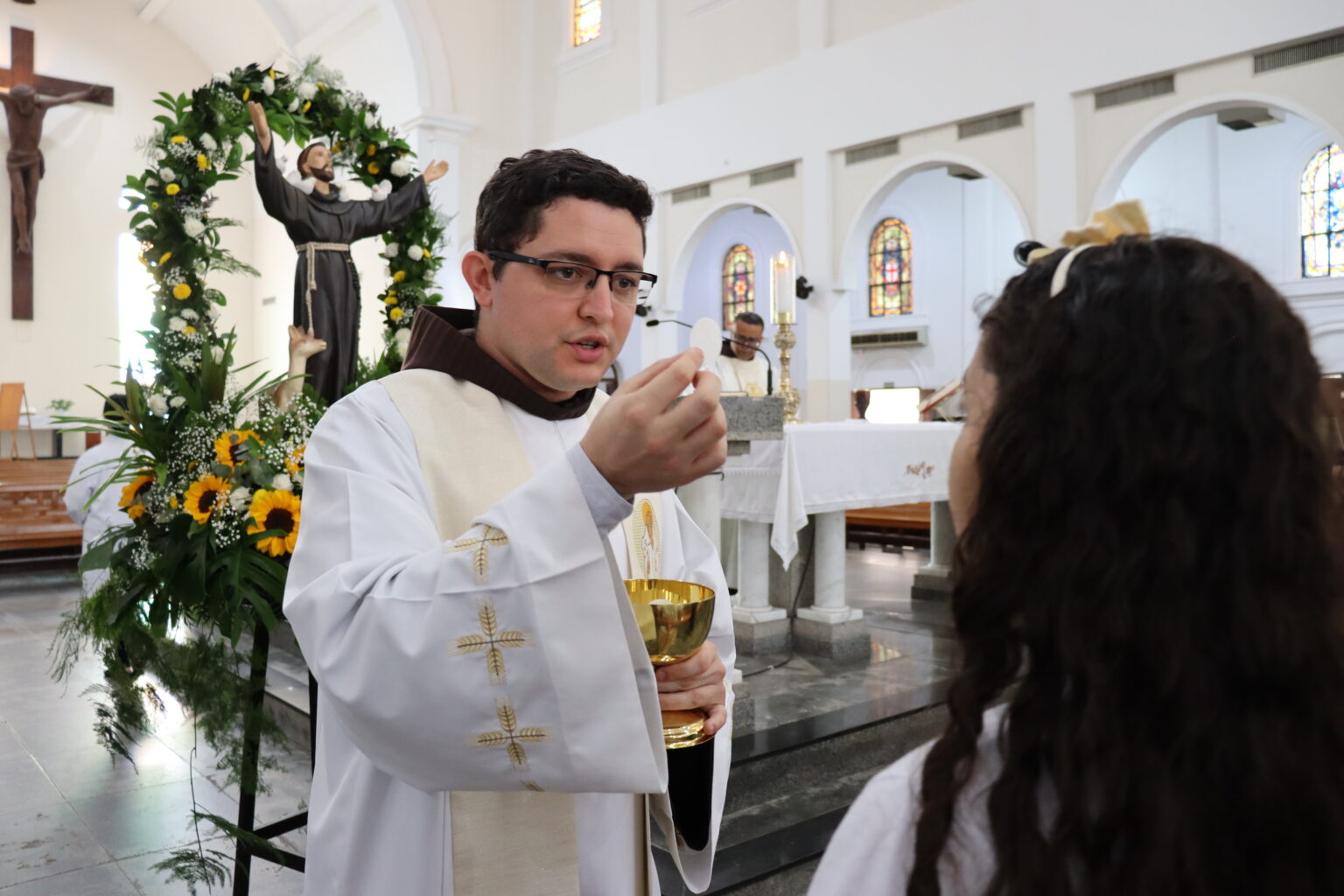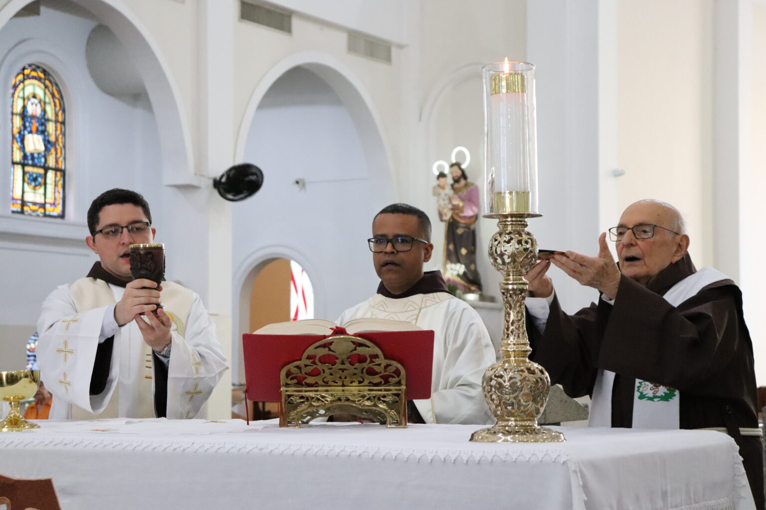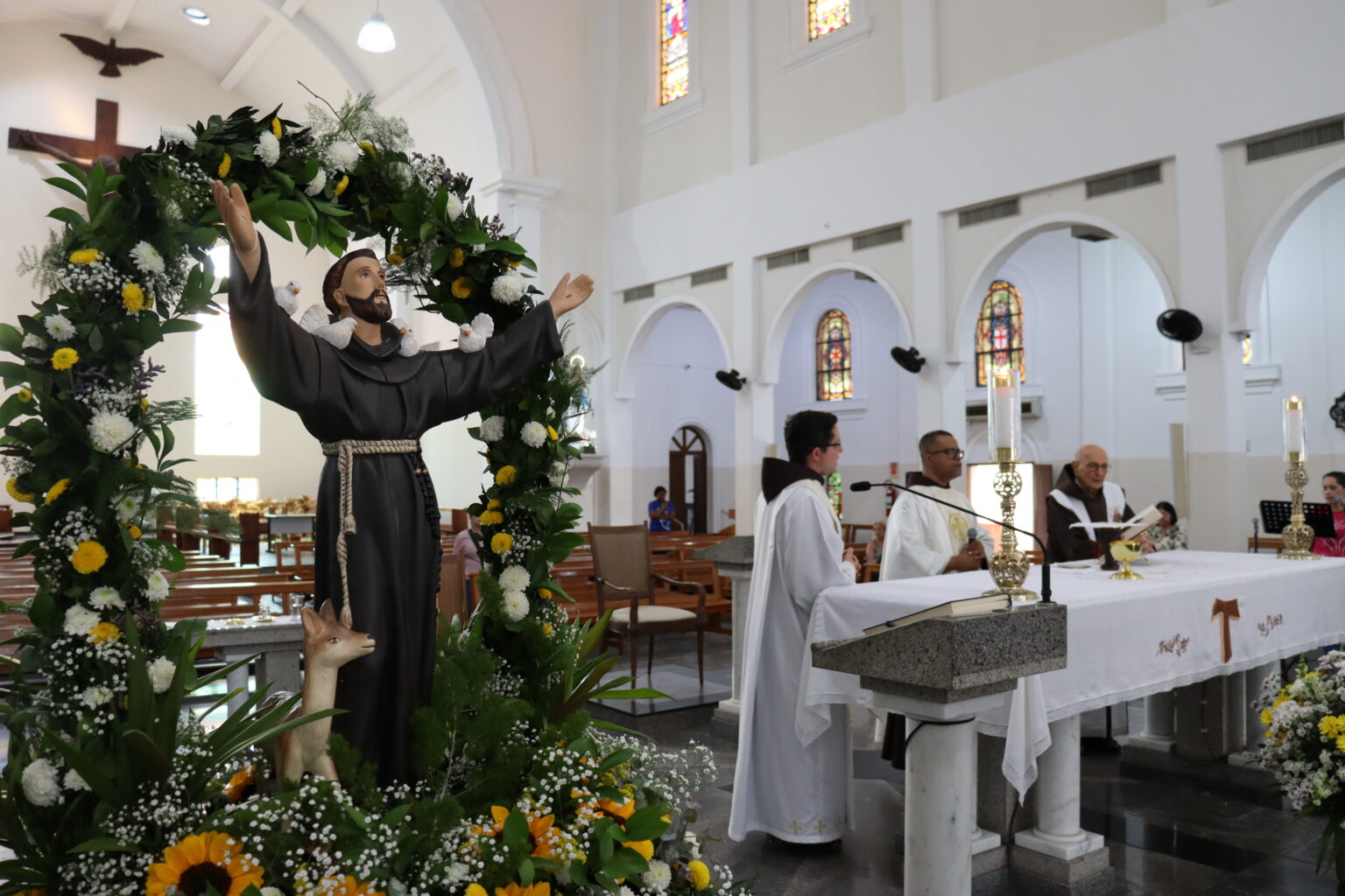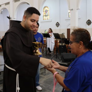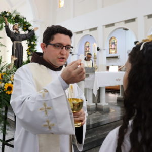 A Celebração foi presidida pelo Frei Paulo César Ferreira, Vigário do Convento. “O Santo de Assis, que inspirou e continua a inspirar os artistas, escultores, pintores, os músicos, escritores, também os vocacionados, tantos vocacionados, jovens, homens e mulheres, casados ou solteiros. São Francisco, de fato, inspira a todos nós que encontramos em Jesus esse poço de água viva e queremos beber dessa fonte como bebeu São Francisco. Então Francisco nos conduz a Jesus”, iniciou.