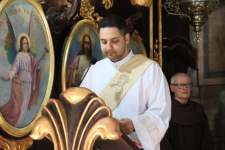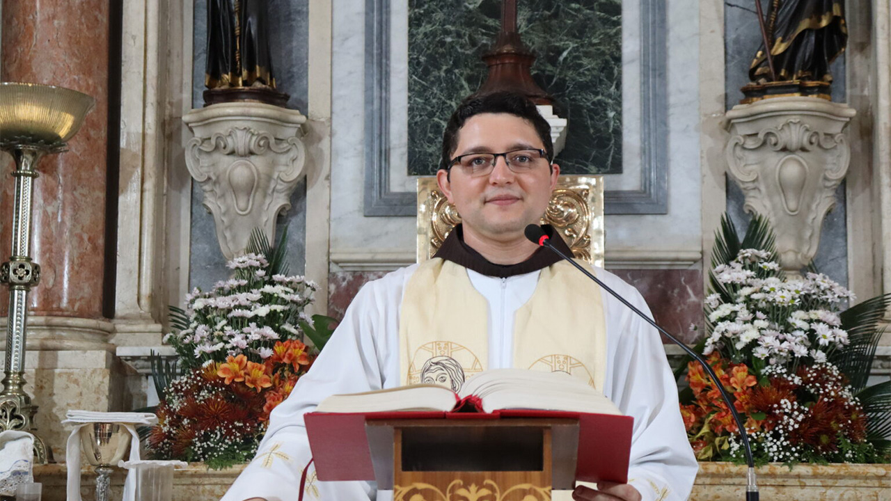Frei Felipe –  “Paz e Bem! É uma alegria estar hoje aqui iniciando os preparativos, iniciando a semana missionária para a ordenação presbiteral. A ordenação não é minha, mas a ordenação é da Igreja, da nossa província. Eu me coloco na disposição de melhor servir a nossa província, a nossa igreja, e também para bem servir, e melhor servir o nosso povo de Deus. Eu acredito que a presença de Maria, de Nossa Senhora, ela é fundamental nesta minha história de vida, e neste meu servir. Eu espelho este meu servir no sim que Maria deu. O Evangelho de hoje já nos diz sobre este ‘sim’ que Maria deu, gratuito, alegre, de servir, de servir a Deus. E é nesta disposição e disponibilidade deste sim de Maria que eu também me coloco. Eu sou natural aqui de Vila Velha, da paróquia Nossa Senhora do Rosário, uma paróquia que é atendida pelos frades da nossa província.