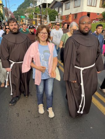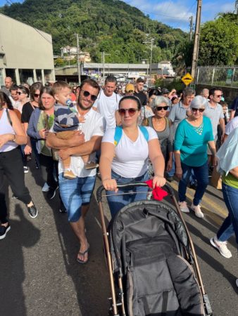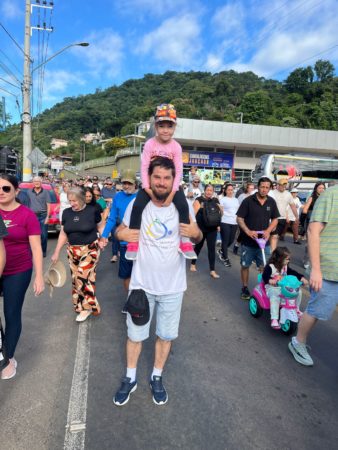 Outra motivação para esta edição da Caminhada nasceu das datas jubilares que convergem neste ano de 2025: 50 anos da Diocese de Joaçaba, 350 anos da Província Franciscana da Imaculada Conceição do Brasil, 800 anos do Cântico das Criaturas e 2025 anos da Encarnação de Jesus Cristo, com o Jubileu da Esperança. Impulsionados por eventos tão significativos, os romeiros tiveram ainda mais razão para se sentirem, de fato, “Peregrinos da Esperança”. Era o caso, por exemplo, da devota Teresinha Vettori, de Herval do Oeste, presente, sem interrupções, em todas as edições da Caminhada. Para ela, a participação nesta homenagem a Frei Bruno é um gesto de gratidão pelas tantas bênçãos recebidas a partir da intercessão deste Homem de Deus. Emocionada, Teresinha se recorda de momentos difíceis, como a complicação por conta da rubéola na gestação da primeira filha e também de uma delicada cirurgia dos olhos pela qual seu marido passou: “Sempre que pedi a Frei Bruno que intercedesse por mim, Deus me atendeu”, relata.