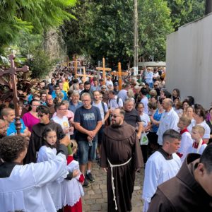 foi e continua sendo importante para que os discípulos compreendam a missão de Jesus: “O Evangelho nos mostra a Transfiguração de Jesus como um sinal da ressurreição e uma catequese para nossa conversão. Os discípulos que presenciaram esse momento precisavam dessa experiência para compreender melhor quem era Jesus e qual era sua missão”. Na reflexão, o bispo diocesano aproveitou ainda para contextualizar a celebração da 35ª Caminhada Frei Bruno neste tempo jubilar: “Nesta caminhada, seguimos o exemplo do Servo de Deus, Frei Bruno, que, com sua vida e missão, nos ensina a andar com Jesus pelos vales e montanhas da existência. Neste ano, em que celebramos a Campanha da Fraternidade com o tema ‘Fraternidade e Ecologia Integral’ e o lema ‘E Deus viu que tudo era bom’, somos convidados a contemplar a criação com um olhar de gratidão e responsabilidade. Também vivemos um tempo especial na Diocese de Joaçaba, que celebra seu jubileu de ouro com o tema “Diocese de Joaçaba, Terra de Vocações’ e o lema ‘Nesta terra, somos peregrinos de esperança’, em comunhão com o Jubileu da Igreja no Ano Santo, exortou.