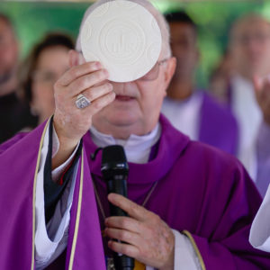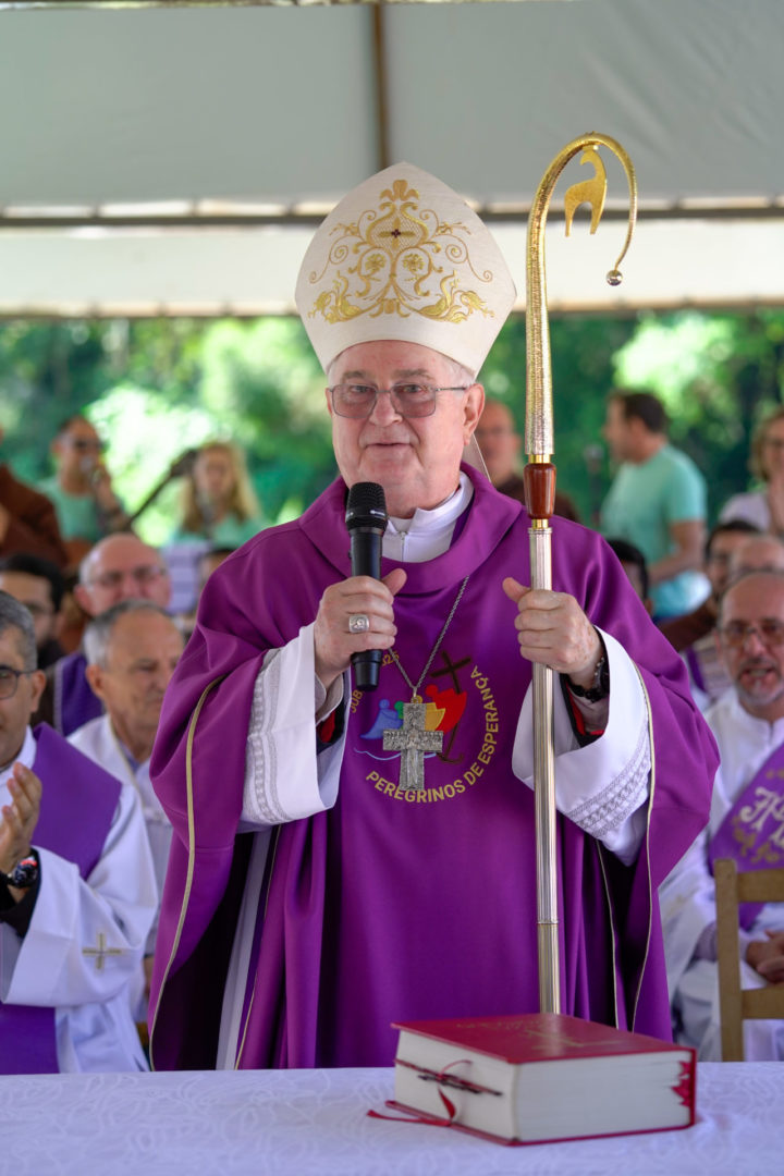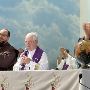 Na homilia, Dom Mário, que é frade franciscano capuchinho, fez uma ligação entre o convite de Jesus a Pedro, Tiago e João, descrito no Evangelho, e a trajetória de Frei Bruno enquanto missionário franciscano: “Ao ouvirmos Jesus convidar Pedro, Tiago e João para caminharem juntos e subirem ao Monte Tabor, lugar onde Jesus se manifesta gloriosamente para uma experiência de fé diante dos seus discípulos, podemos pensar em Frei Bruno, que deixou sua terra natal, a Alemanha, para ser missionário franciscano em terras brasileiras. Neste país, andou por vales e montanhas grande parte de sua vida, evangelizando as terras catarinenses e, por fim, a nossa querida Joaçaba, onde ele descansou, concluindo a sua trajetória entre nós”, recordou o bispo, no ambão localizado a poucos metros da sepultura de Frei Bruno.