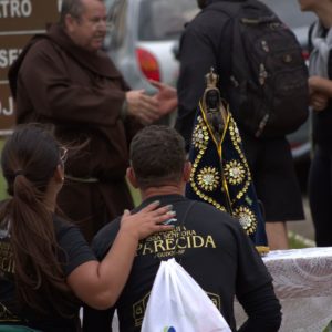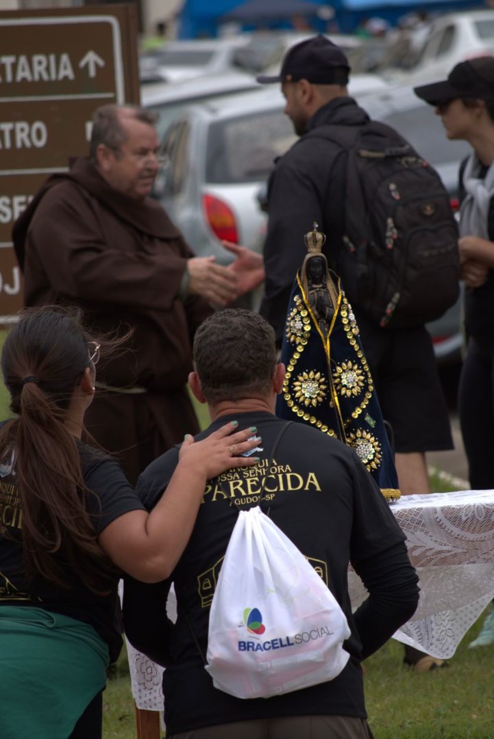 A chegada dos peregrinos ao Seminário Santo Antônio foi marcada por um profundo clima de espiritualidade e emoção. Frei Ademir acolheu os fiéis junto à imagem de Nossa Senhora Aparecida, conduzindo um momento de bênção e gratidão pela jornada concluída.