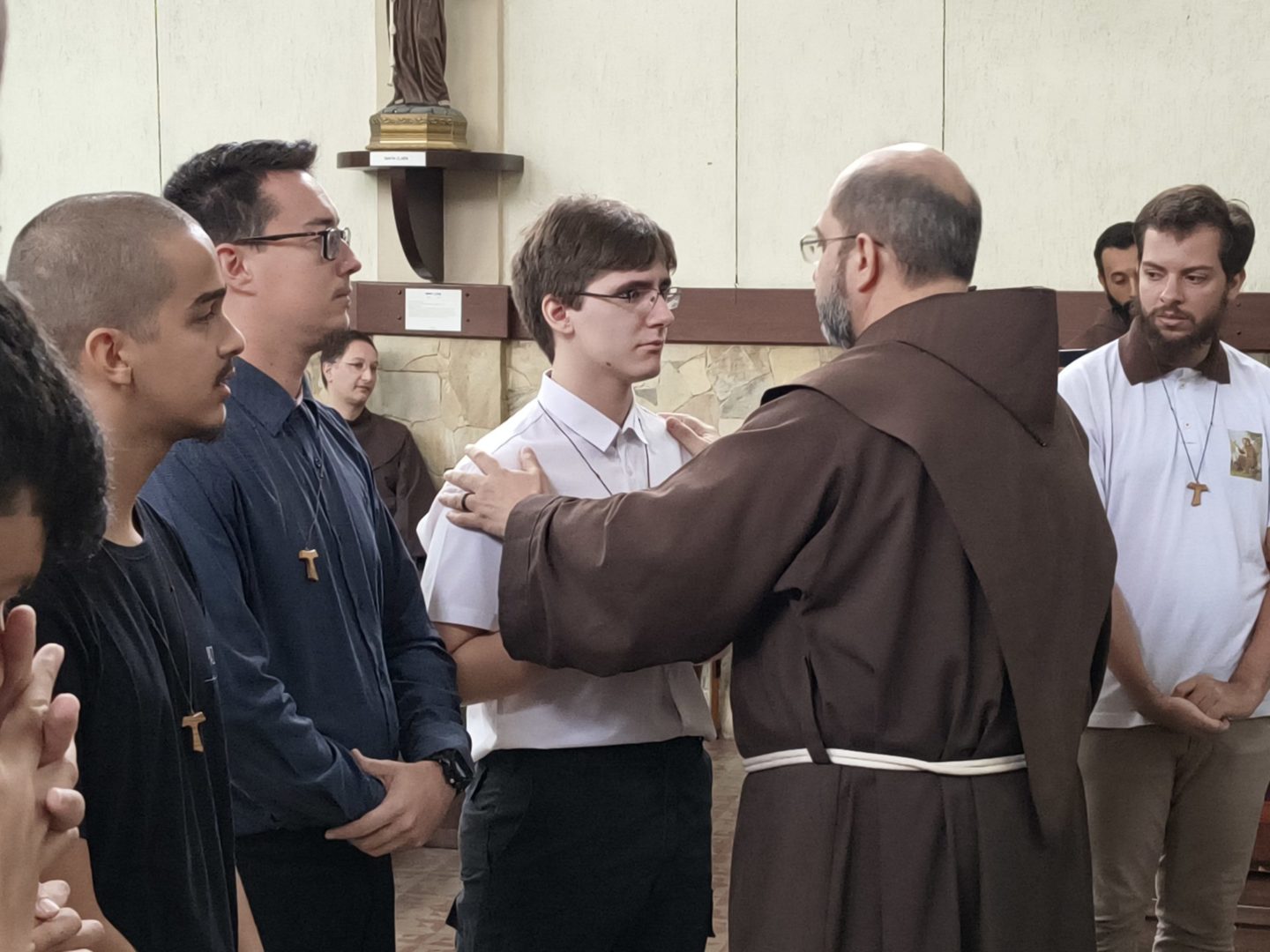 Ao final do rito, os postulantes receberam o Tau, forte símbolo franciscano, sinal da cruz e da pertença à tradição espiritual inaugurada por São Francisco de Assis. Ao confiar os novos postulantes à Fraternidade formativa, Frei Paulo recordou duas virtudes fundamentais para o caminho vocacional: a fidelidade e a perseverança. Mais do que fruto do esforço humano, afirmou, são dons de Deus que precisam ser continuamente pedidos e acolhidos com o coração aberto.