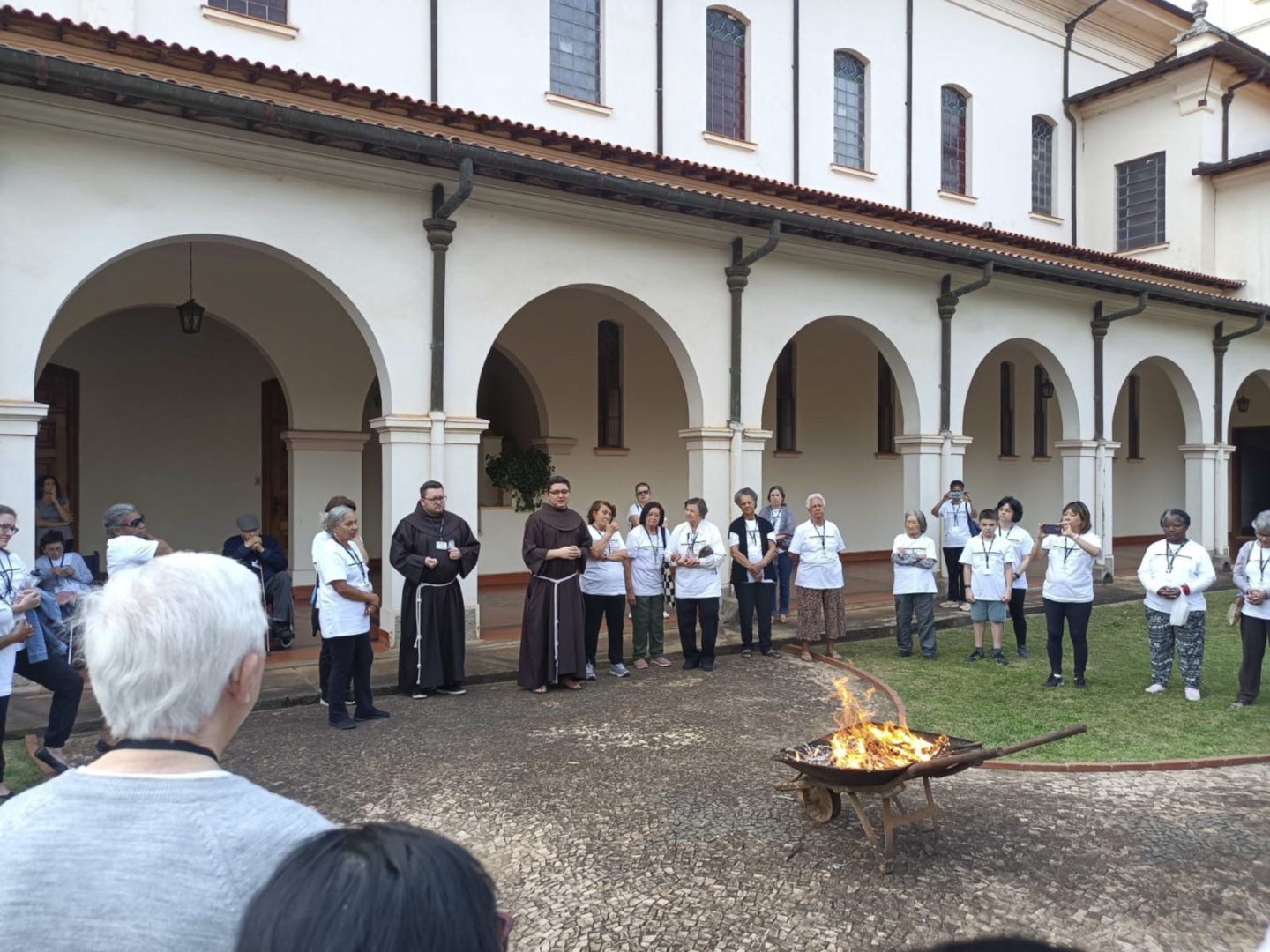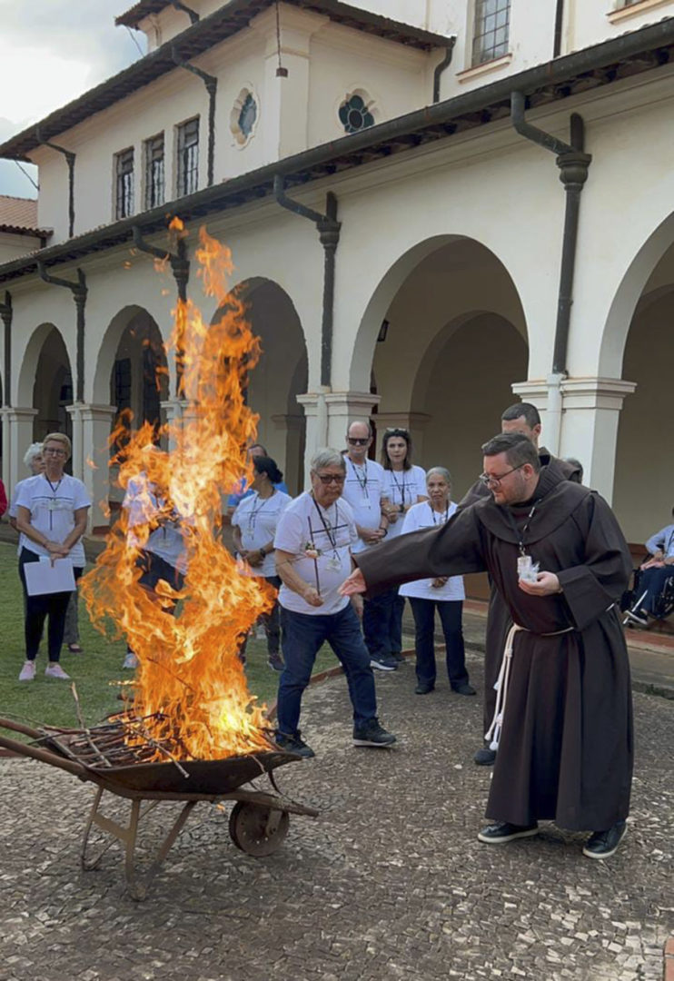 Na parte da tarde os participantes fizeram uma dinâmica. Recebendo pequenos gravetos, fizeram a experiência do Santo de Assis de transformá-los no “violino de pobre”. E enquanto ouviam a canção que tem como ponto forte a frase mencionada no início deste texto, de olhos fechados, também fizeram a sua oração espontânea, “tocando” o instrumento. Em seguida, portando consigo os mesmos gravetos, dedicaram-se a um tempo de silêncio e oração pessoal, confeccionando uma cruz com os galhos e barbante. Num gesto simbólico, coroaram a tarde com uma atividade que convidou o irmão fogo para participar: depositaram suas cruzes numa fogueira, representando assim um rompimento com as chagas, que precisavam ser curadas, que diferentes das de Cristo, são ocasião de dor, não por serem fruto de uma experiência de fé, mas por terem sido provocadas pelos sofrimentos da vida. O Espírito Santo foi invocado a fim de que na sua missão de queimar, purificar, aquecer e iluminar pudesse ajudar os participantes a terem os dons necessários para a vida sempre nova. O dia terminou com um momento de devoção mariana na linda capela do Seminário, rezando pelas vocações e um festivo bingo com vários prêmios, que garantiu a alegria de todos.