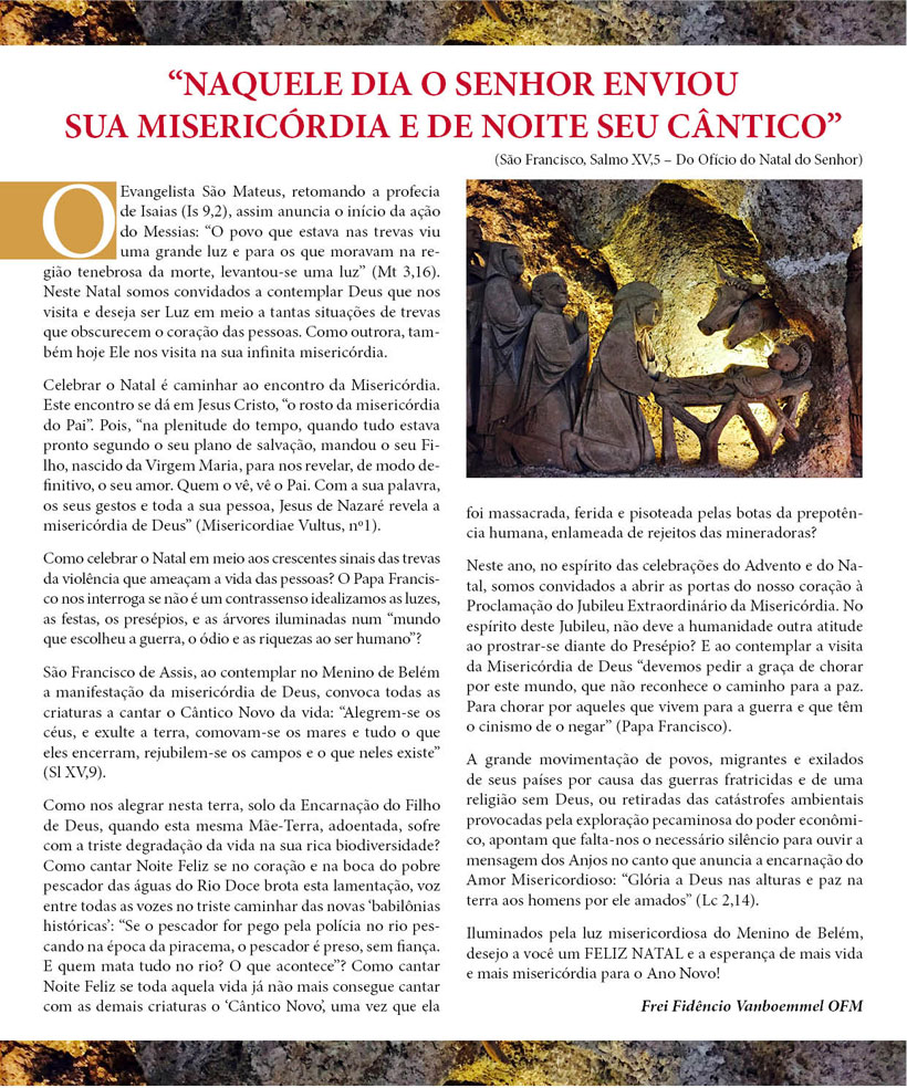 Notícias Ministro Provincial escreve carta por ocasião do Natal 21/12/2015 Notícias Conteúdo RelacionadoFrei Medella: “Apesar da minha estatura, me julgo pequeno neste serviço”Leia MaisFrei Ivair, testemunha dos novos tempos da Ordem Franciscana em AngolaLeia MaisAlunos do Colégio Bom Jesus visitam a Fraternidade Sagrado Coração de JesusLeia Mais