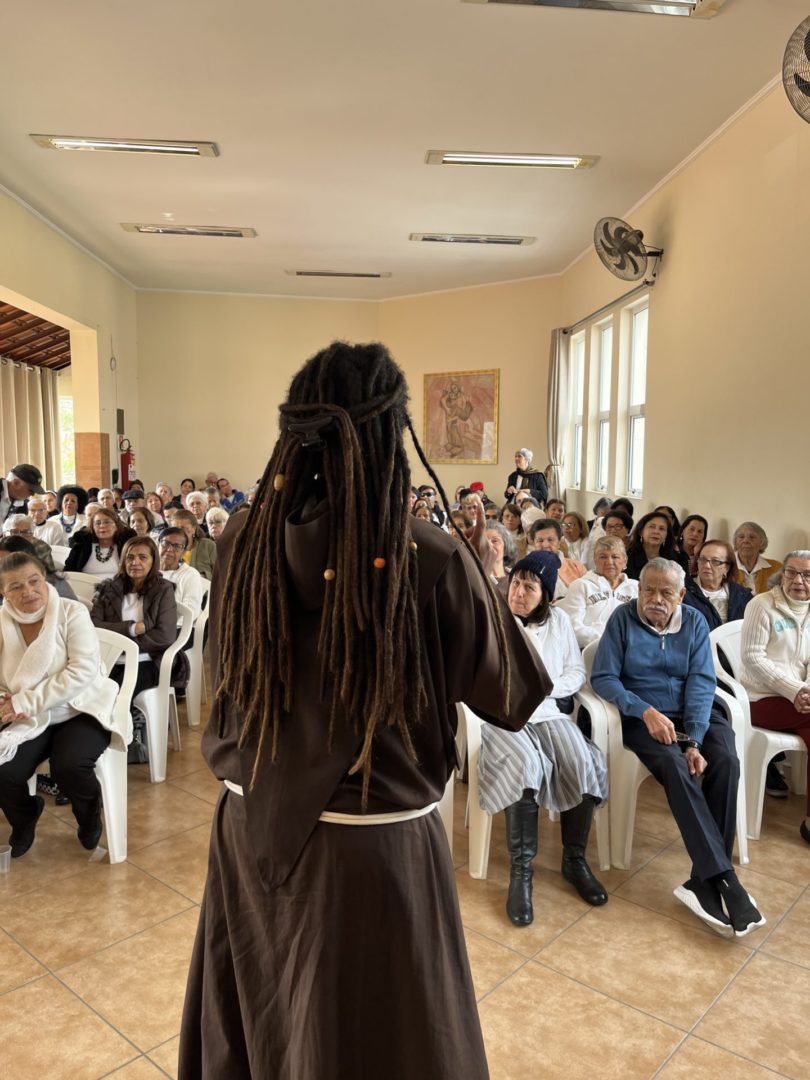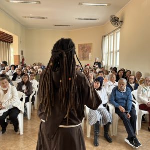 A comemoração começou com apresentações das próprias participantes: com uma dança e encantou o público, seguido pela percussão vibrante e pelo coral, que interpretou com emoção o Cântico das Criaturas. Entre as homenagens, Frei Tiago Elias, vice-presidente do Sefras, conduziu uma mística especial contando a história de Santa Clara e sua amizade com São Francisco, ressaltando que “as melhores coisas estão em tudo” e que “cuidar de si também é uma oração”. Ele também recordou como o espírito de Santa Clara chegou a São Paulo e inspirou a missão da Casa: assim como a santa defendeu suas irmãs, o projeto defende e valoriza a pessoa idosa.