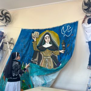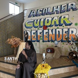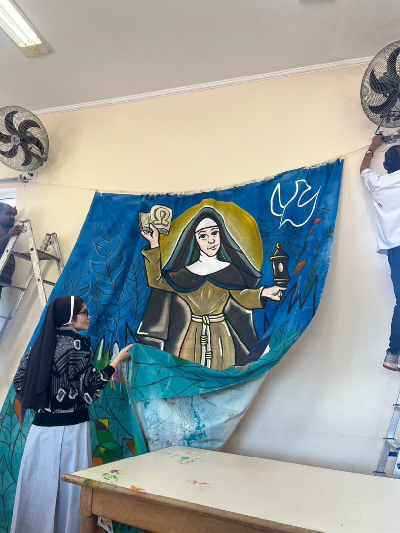 Durante a mística, houve a partilha do pão, abençoada pelo Frei Melo: “O pão sempre traz o amor, a partilha e a união.” No palco, Frei Tiago também cantou, levando música e alegria ao encontro, e um painel coletivo com a imagem de Santa Clara foi confeccionado pelos presentes como símbolo de união e gratidão.