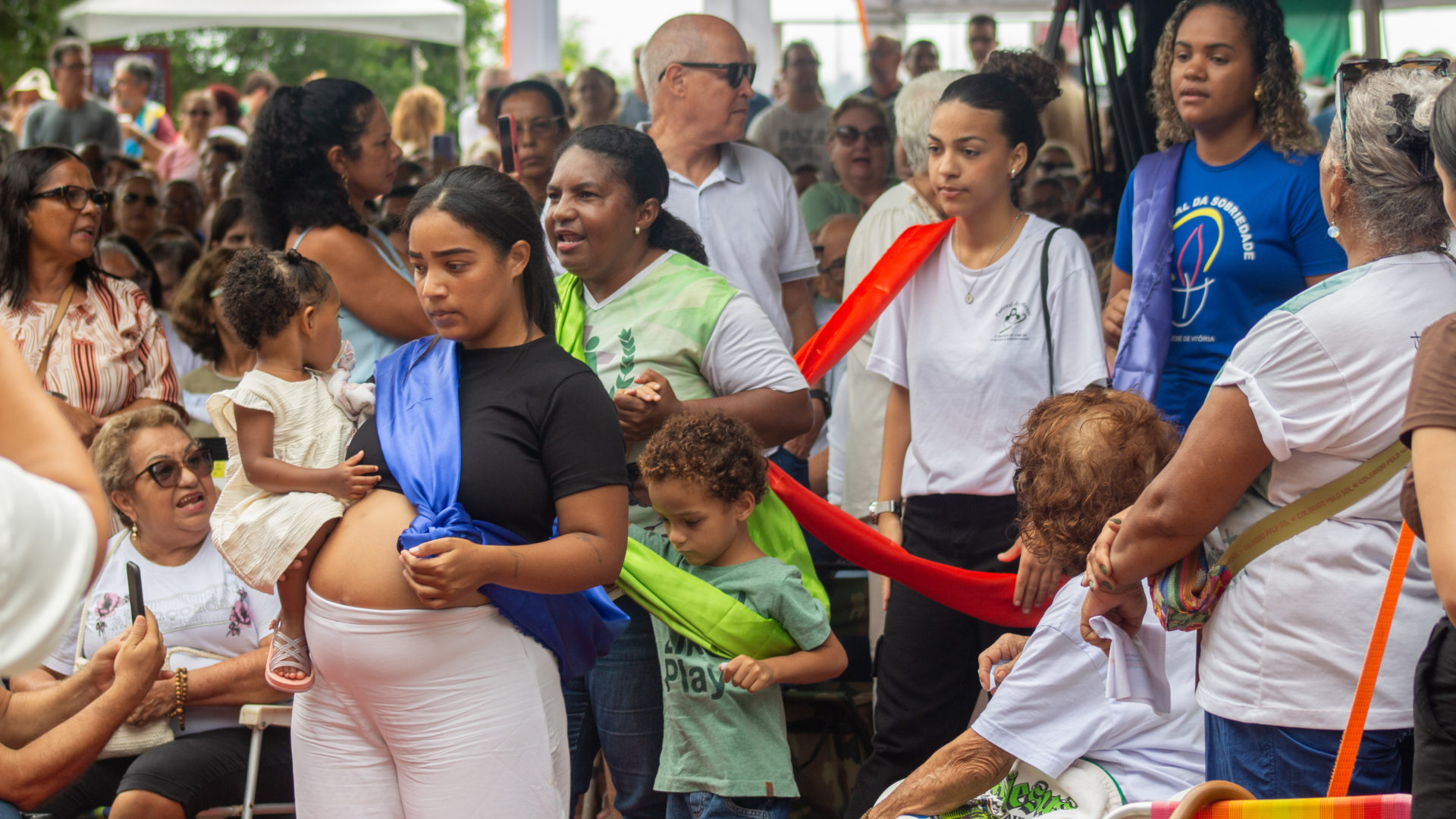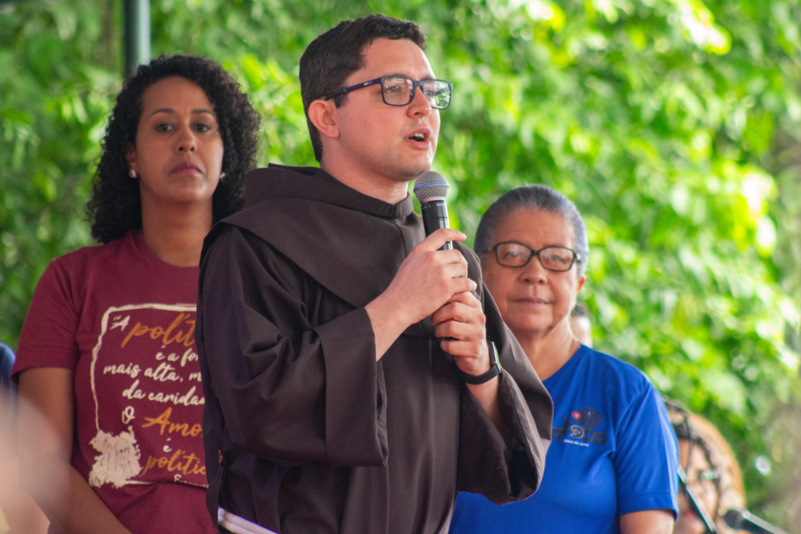 A manhã seguiu com a missa das Pastorais Sociais, às 10h, presidida pelo padre Kelder Brandão, coordenador do Vicariato para a Ação Social da Arquidiocese de Vitória. Em sua homilia, ele refletiu sobre o tema da festa: “Fazei de nós instrumentos da paz” e afirmou: “Todo cristão deve ser um instrumento da paz. Ou não será cristão?”. Ao distinguir a paz de Deus da paz do mundo, destacou: “A paz que o mundo dá é uma farsa, imposta pela violência, pelo medo e pela opressão. Essa não é paz. É silenciamento e violência disfarçada”.