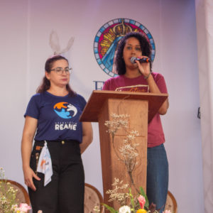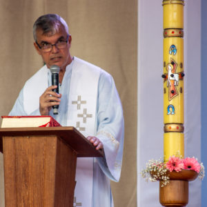Frei Evaldo Ludwig presidiu a celebração e destacou o encontro entre Maria e Isabel como ponto de partida da missão de Cristo, ressaltando também a dimensão do batismo na vida cristã. “Duas mulheres batalhadoras que possuíram e ajudaram o projeto de Deus. Maria encontra com Isabel. E nesse encontro… Jesus Cristo no peito de Maria, João Batista no peito de Isabel. E esse encontro foi tão majestoso que Maria diz: ‘eu assumi um projeto, eu sou serva do projeto de Deus’”, afirmou. Ele ainda recordou o simbolismo da água nesses encontros: “O primeiro encontro de Jesus com João Batista foi no ventre. O segundo encontro foi na água do Rio Jordão. A água é símbolo da purificação, da restauração e da nova vida”.