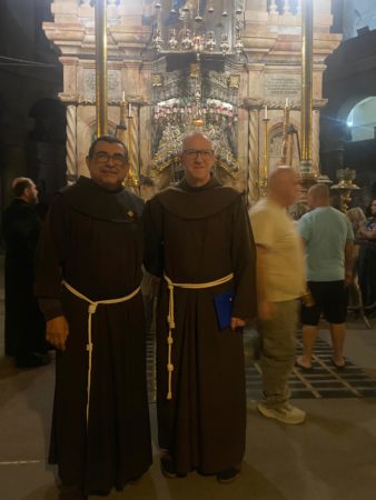 No dia 25, às 06h30, tivemos a missa de encerramento no Santo Sepulcro, presidida pelo Custódio da Terra Santa e concelebrada pelos comissários e vices. Uma experiência marcante, onde pudemos celebrar mais uma vez em frente à edícula do Sepulcro e a seguir, tocar o Túmulo vazio, depositando ali nossas orações, solicitadas pelos fiéis de nossas searas de atuação. E na parte da tarde, após algumas considerações finais, a partir dos trabalhos em grupo, tivemos o envio dos comissários e vices, com algumas diretrizes e orientações do Custódio, Frei Francesco Ielpo, que resumidamente apresento abaixo:
