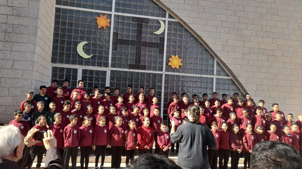 A seguir, visitamos o Colégio da Terra Santa, inclusive entrando em algumas salas de aula, em vista da saudação das crianças e adolescentes que lá estudam nas várias etapas da escola e colégio. Ao todo, são cerca de 1800 alunos, que têm desde o maternal até o final do ensino médio. Estes alunos são filhos de cristãos e de muçulmanos, que lá fazem a sua formação básica, inclusive tendo aulas em inglês, italiano e outras línguas. Também recebem formação em música, instrumentos musicais, artesanato e cursos de turismo e hotelaria.