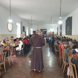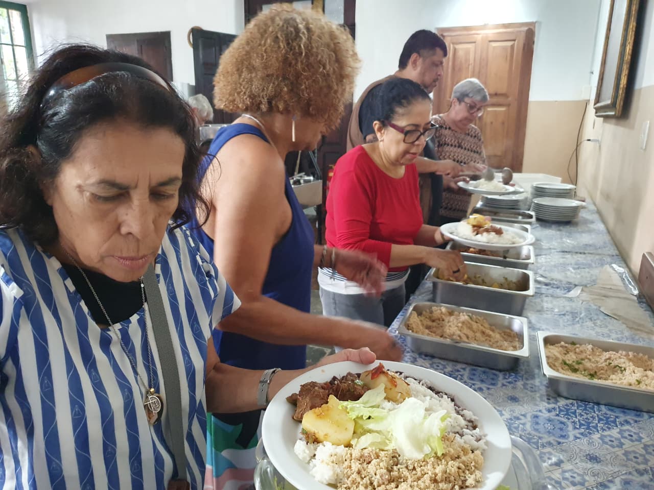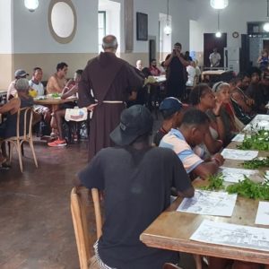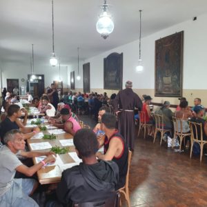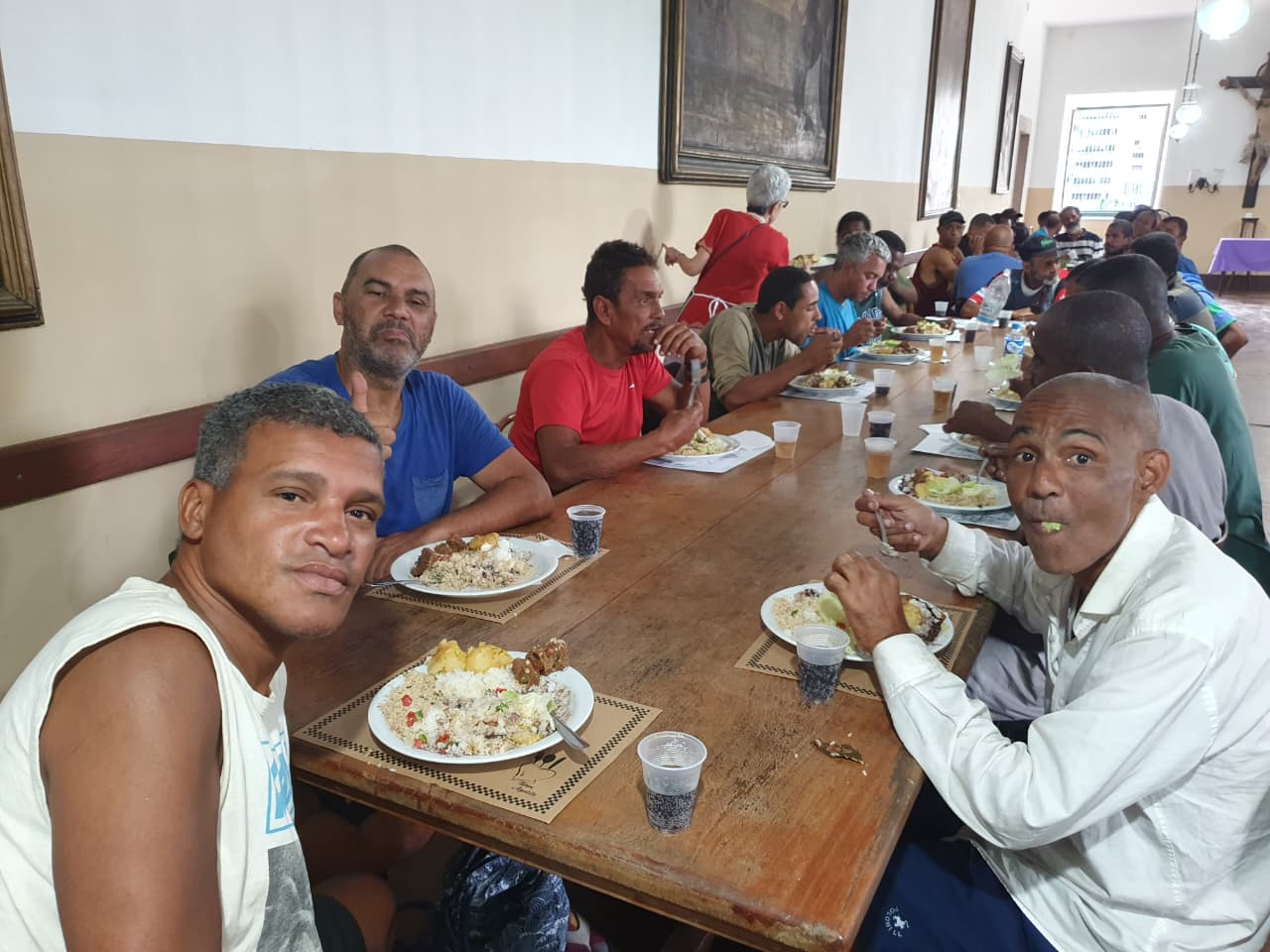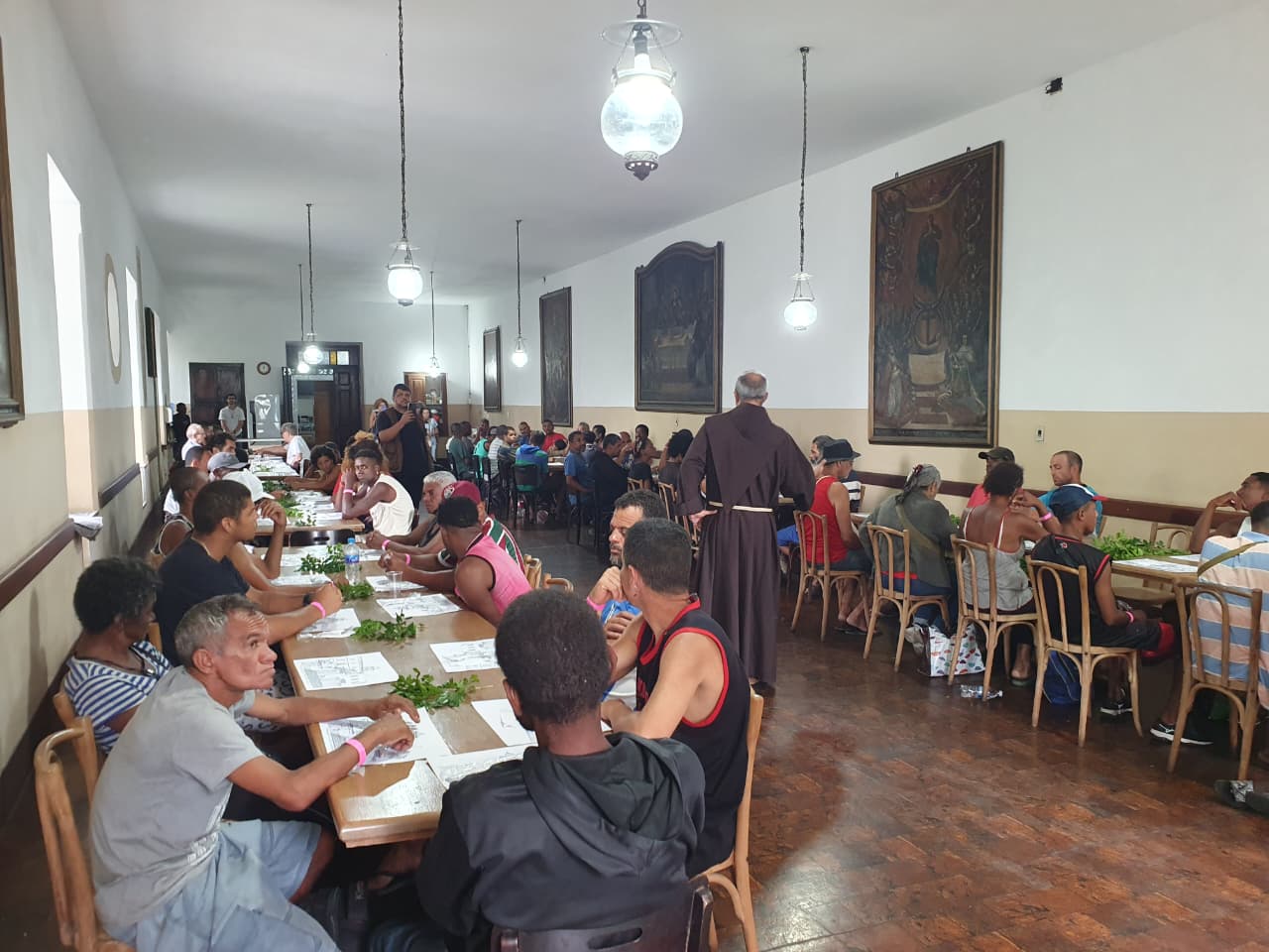 Mais uma vez a Fraternidade do Convento Santo Antônio recebeu em seu refeitório um grupo de irmãos e irmãs em situação de rua. Na ocasião, 60 pessoas participaram do almoço solidário por ocasião do Dia Mundial dos Pobres, celebrado no último domingo, 16 de novembro. O cardápio, preparado na cozinha do Convento, trouxe arroz, feijão, carne de boi ensopada, farofa, salada de alface e vinagrete, acompanhados de refrigerante e água mineral. A sobremesa foi sorvete de coco.