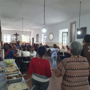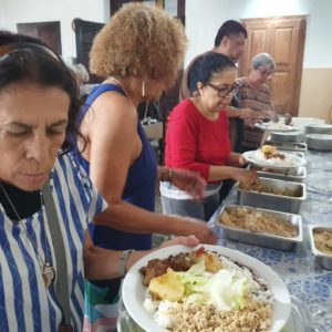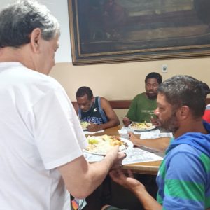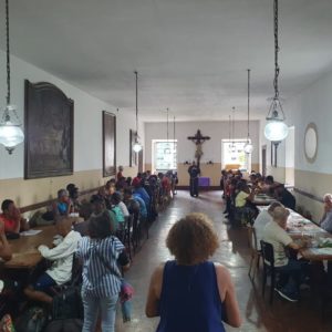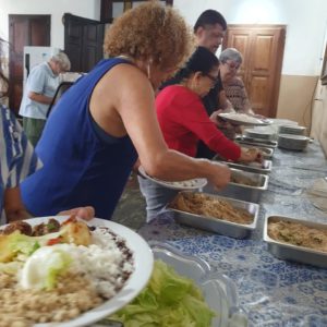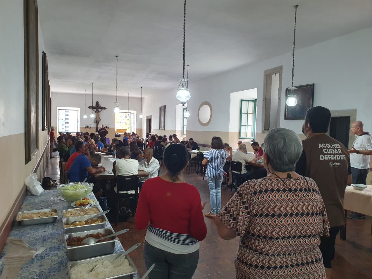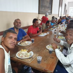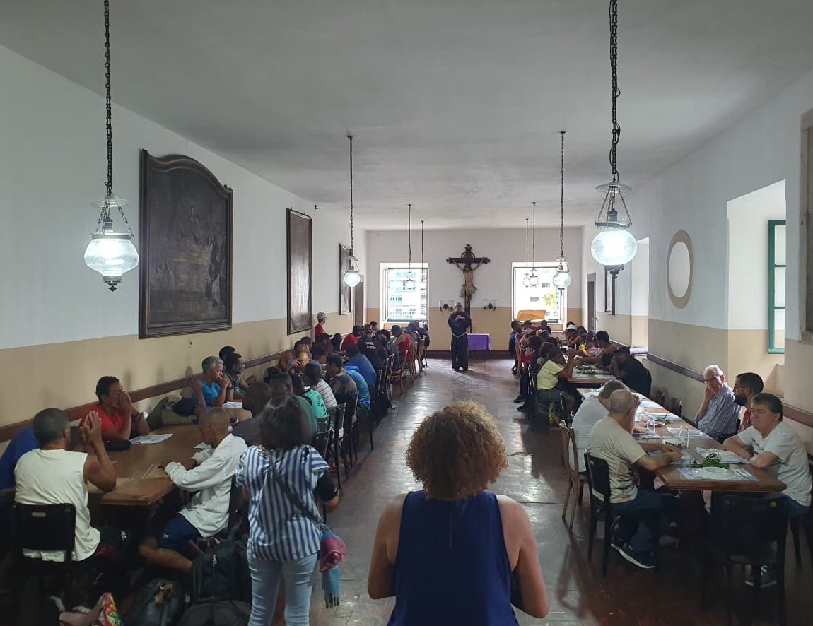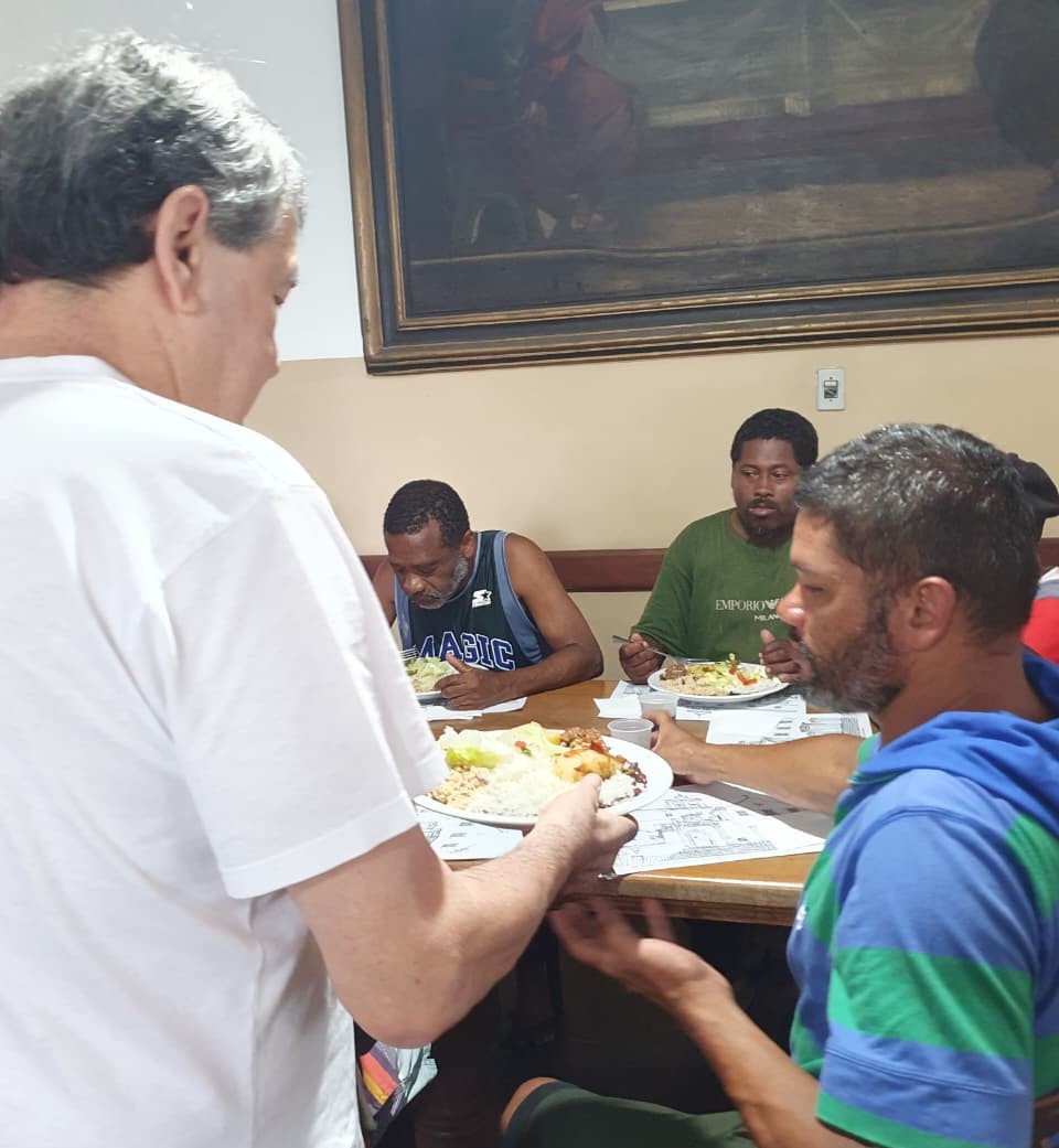 Mais uma vez a Fraternidade do Convento Santo Antônio recebeu em seu refeitório um grupo de irmãos e irmãs em situação de rua. Na ocasião, 60 pessoas participaram do almoço solidário por ocasião do Dia Mundial dos Pobres, celebrado no último domingo, 16 de novembro. O cardápio, preparado na cozinha do Convento, trouxe arroz, feijão, carne de boi ensopada, farofa, salada de alface e vinagrete, acompanhados de refrigerante e água mineral. A sobremesa foi sorvete de coco.
