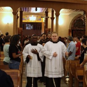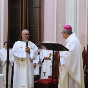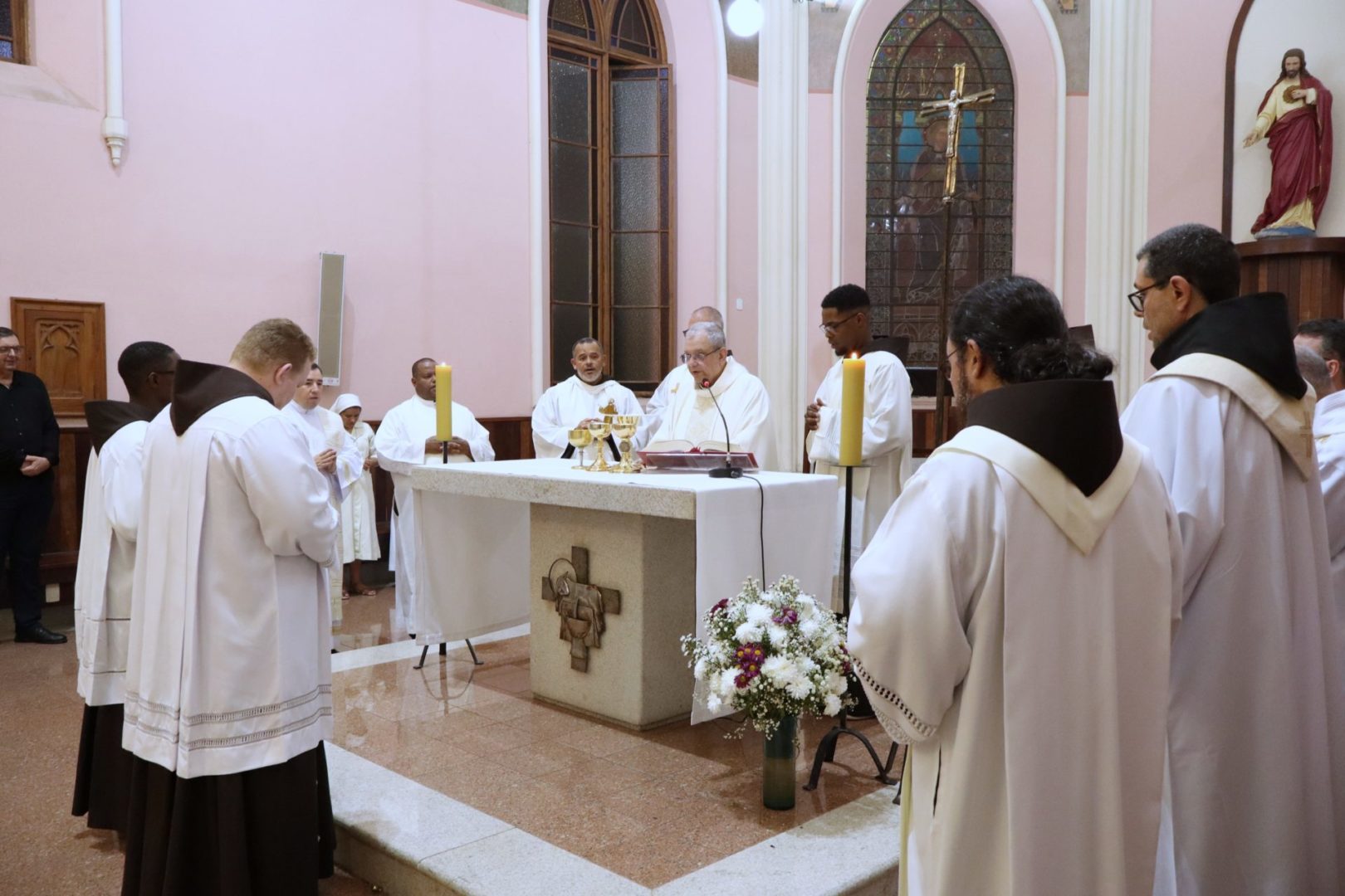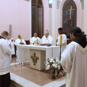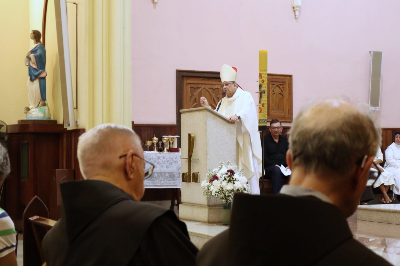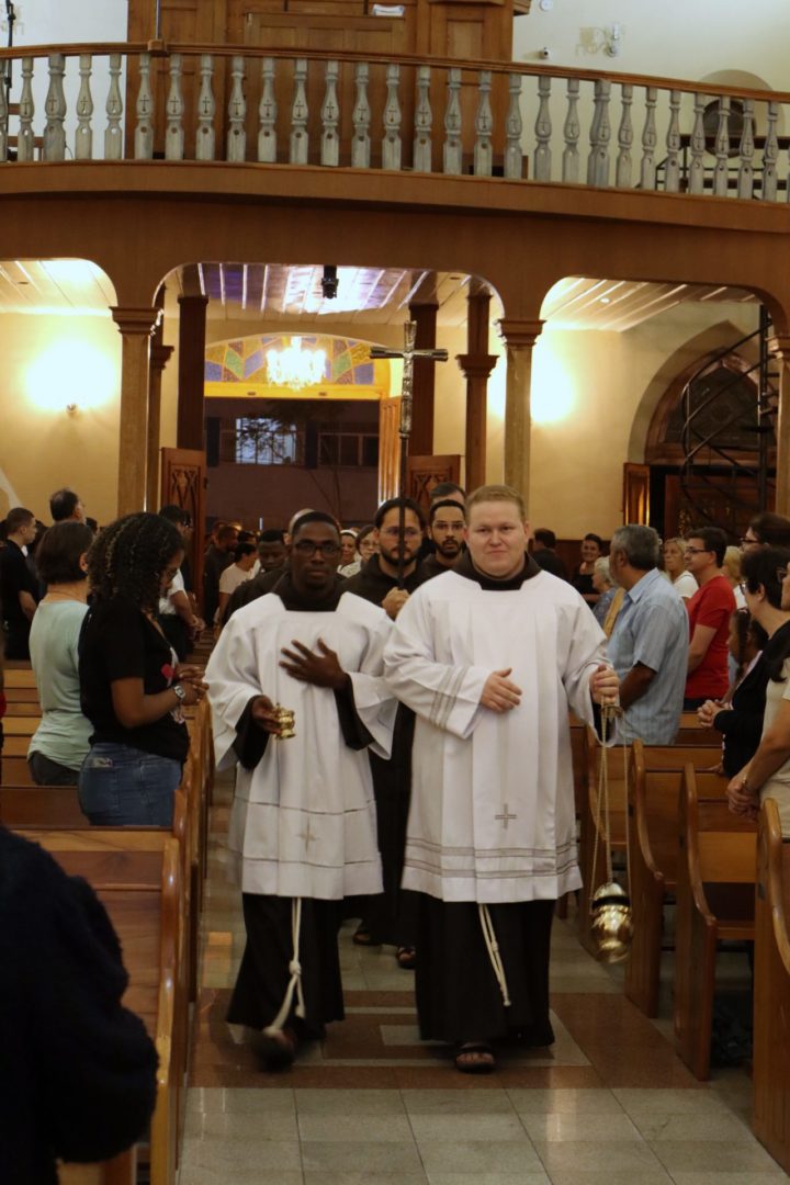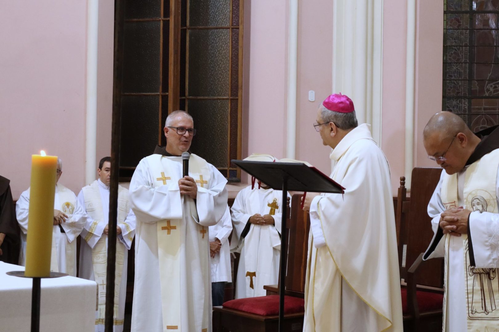 A cerimônia teve início com a saudação de Frei Marcos Antônio de Andrade, guardião da Fraternidade do Sagrado Coração de Jesus, que acolheu os fiéis e dirigiu palavras especiais de boas-vindas a Dom Joel Portella Amado.