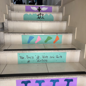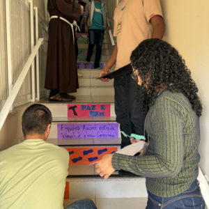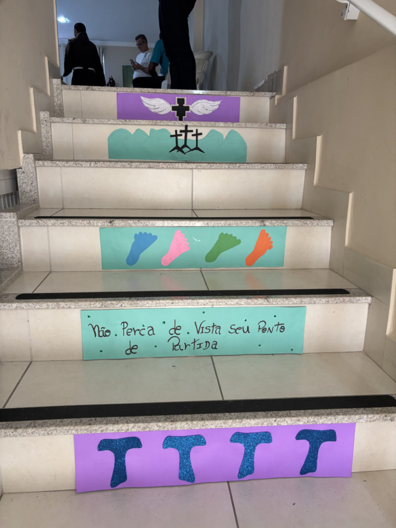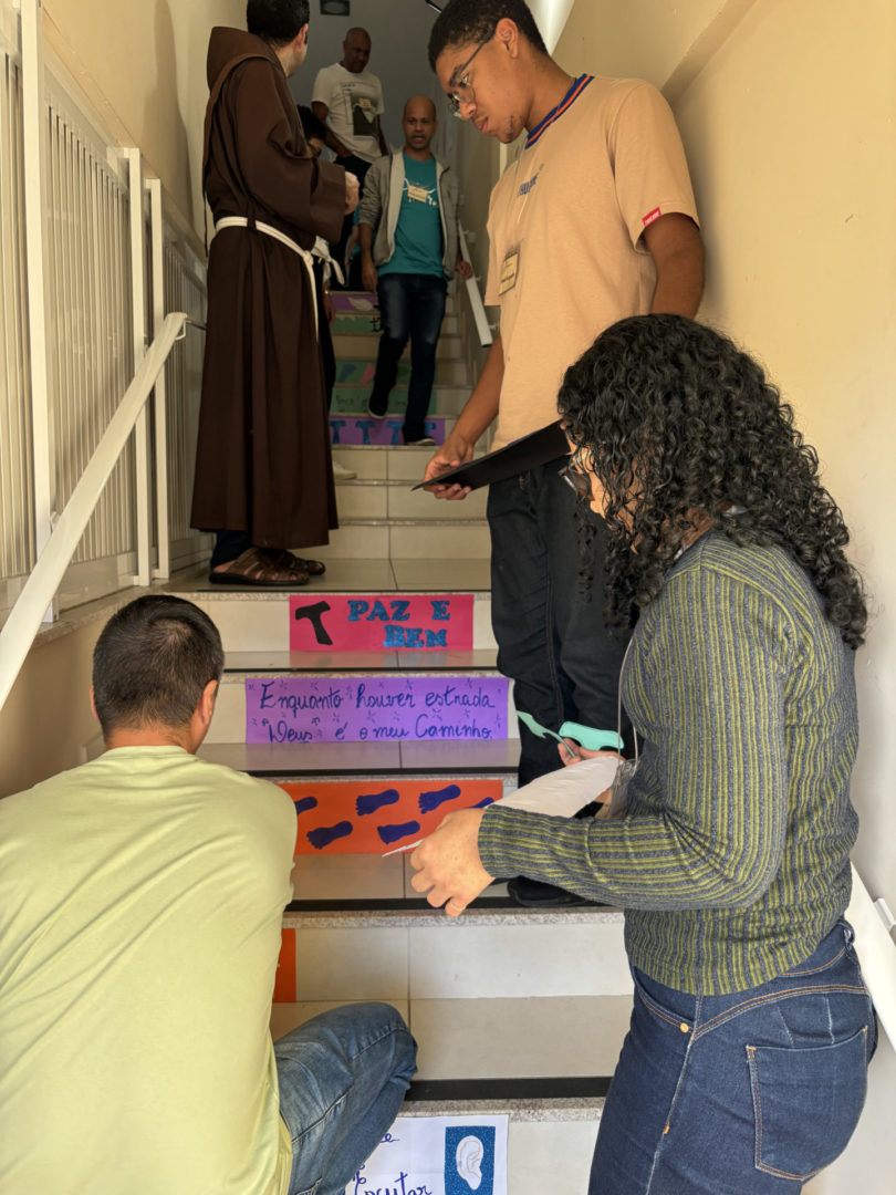 Para tornar concreto esse percurso interior, a tarde do primeiro dia do encontro foi marcada pela dinâmica da escadaria de Selarón, na qual cada jovem expressou, em palavras, desenhos ou símbolos, os “degraus” que deseja subir na própria fé. “A vida é feita de degraus. Cada vez um degrauzinho a mais”, ensinou Frei Vitório, exibindo imagens da famosa escadaria da Lapa, no Rio de Janeiro, e relacionando-a à “via espiritual” de São Francisco, a caminhada da Igreja e os 800 anos do Cântico das Criaturas. Assim, os jovens puderam fixar nos degraus do Centro Pastoral da Paróquia Santa Clara as ilustrações que produziram.