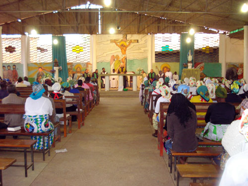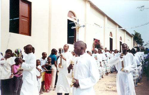 De tarde, concelebramos Missa na capela da cidade, hoje praticamente depenada. Digo, na cidade, pois Kibala, embora pequena, é de grande importância estratégica por se tratar de um entroncamento para todas as direções da parte sul de Angola. Era uma cidade de colonização portuguesa de grande futuro. Cidade também em oposição à Sede da Missão, que fica 3 km distantes dela. Isso porque os missionários da recente e nova Evangelização de Angola, encetada, sobretudo, pelos Padres Espiritanos, a partir da primeira metade do século passado, estabeleciam a Sede da Missão um tanto afastada do centro da cidade habitada pelos portugueses. Queriam assim atingir prioritariamente as populações autóctones. Já era uma forma de inculturação. Nesta celebração, com frequência não muito numerosa por causa da insegurança ainda reinante, apenas nós éramos brancos. Houve nova apresentação dos missionários.