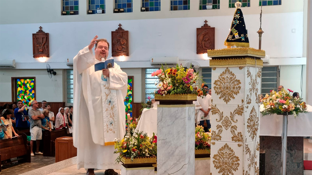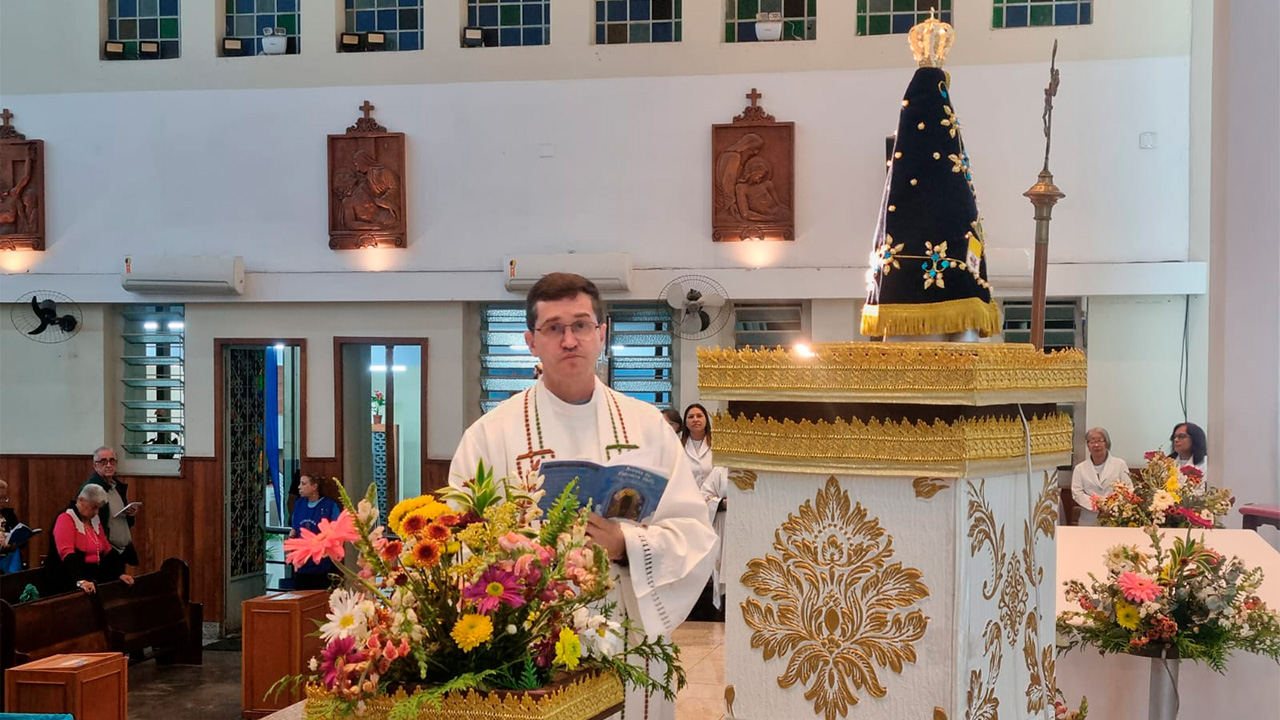 À noite, durante a novena, a alegria da celebração e o amor da Mãe Aparecida foram destacados pelo Frei Luiz Colossi que, pela primeira vez, celebrou a Novena da Padroeira como Vigário na Paróquia Nossa Senhora Aparecida, em Nilópolis. Ao ser questionado sobre o sentimento de participar desse momento, ele expressou com ternura. “Ah, igual coração de Mãe! Ainda mais hoje, dia de Festa de São Francisco… é amar aquele que muito nos amou!”