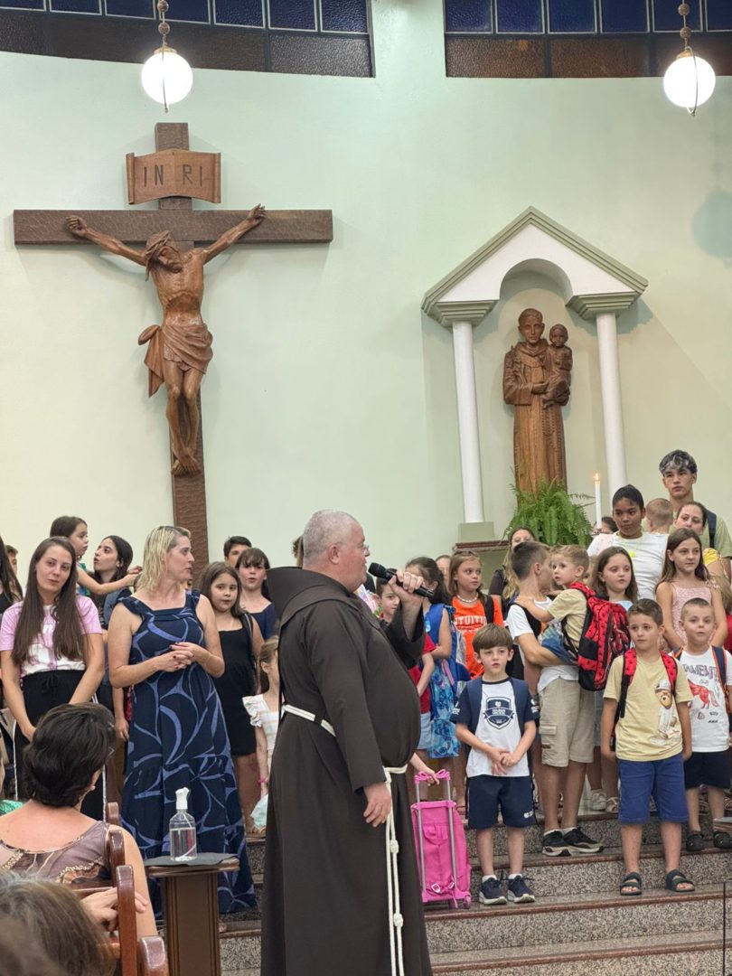 Presidida pelo pároco Frei Alex, a celebração reuniu inúmeras famílias que lotaram a igreja, levando consigo mochilas coloridas, sonhos, expectativas e orações para o novo ciclo que se inicia. A bênção das mochilas foi conduzida pelo carismático Frei Alexandre, que, de forma simples e acolhedora, destacou a importância de começar o ano escolar sob a proteção e a graça de Deus.