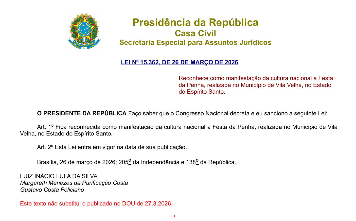 A lei marca um momento histórico para o povo capixaba, confirmando a importância da Festa da Penha no cenário cultural brasileiro. Além de uma expressão de fé e amor do povo espírito-santense. Tradicionalmente realizada no Convento da Penha, na cidade de Vila Velha, a festa reúne milhões de fiéis todos os anos e é considerada um dos maiores eventos religiosos do país.