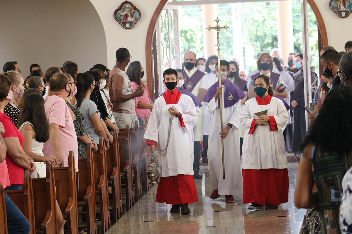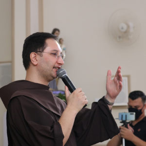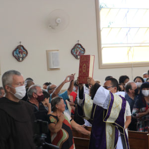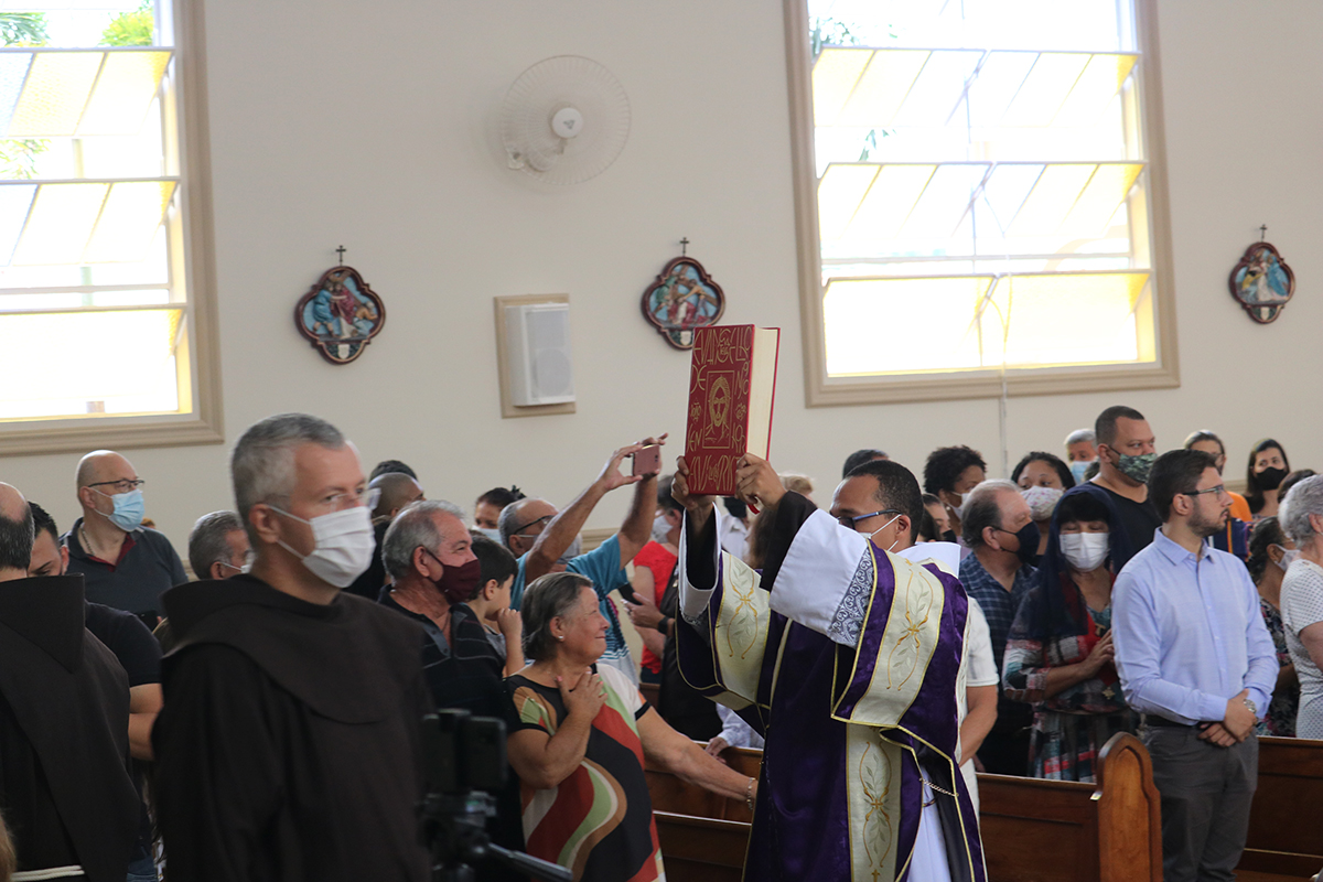 Frei Paulo também trouxe a “Carta a Toda Ordem” para enfatizar o ministério do sacerdote. “Peço ainda no Senhor a todos os meus irmãos sacerdotes, os que são, vierem a ser ou desejarem ser sacerdotes do Altíssimo (…)” – hoje fala também a você, Frei Jhones, ao celebrar a missa – “ofereça o verdadeiro sacrifício do santíssimo corpo e sangue de Nosso Senhor Jesus Cristo, com disposição sincera, com reverência e com santa e pura intenção. Considerai a vossa dignidade irmãos sacerdotes e sede santos porque Ele é santo… vós, mais que todos, amai-o, reverenciai-o, honrai-o… Portanto, nada de vós retenhais para vós mesmos, para que totalmente vos receba quem totalmente se vos dá!” (Ord 14-29)”, citou o frade.