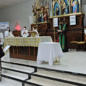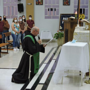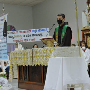 Frei Moacir tomou a leitura do Apóstolo Paulo – Se eu tivesse o dom da profecia, se conhecesse todos os mistérios e toda a ciência, se tivesse toda a fé, a ponto de transportar montanhas, mas se não tivesse caridade, eu não seria nada. Se eu gastasse todos os meus bens para sustento dos pobres, se entregasse o meu corpo às chamas, mas não tivesse caridade, isso de nada me serviria – como exemplo para sua vida: “Se não tiver amor a Deus e ao próximo, tudo perde sentido. Hoje, faço meu agradecimento por esses anos e pelos anos que eu possa ter pela frente a serviço da Igreja dentro da Família Franciscana que a gente pertence segundo o carisma do nosso fundador São Francisco de Assis”.