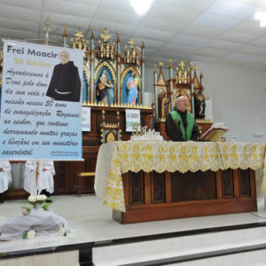 “Sua vida torna-se testemunho para todos nós. Ao olharmos para ela e para todo o seu empenho, somos levados a reconhecer entre nós um irmão que não mede esforços para levar ao bom termo a missão que lhe é confiada. Que Deus lhe conceda muitos anos de vida, pois a boa vontade para continuar ouvindo a voz de Deus e cumprir a missão que Ele lhe confia, o senhor tem em abundância. Mas, como nos ensinou o Pai Francisco ao dizer ‘irmãos, comecemos, pois até agora pouco ou nada fizemos’, convido o senhor, Frei Moacir, que, de joelhos, diante desta comunidade, renove os seus votos”, pediu Frei Robson.