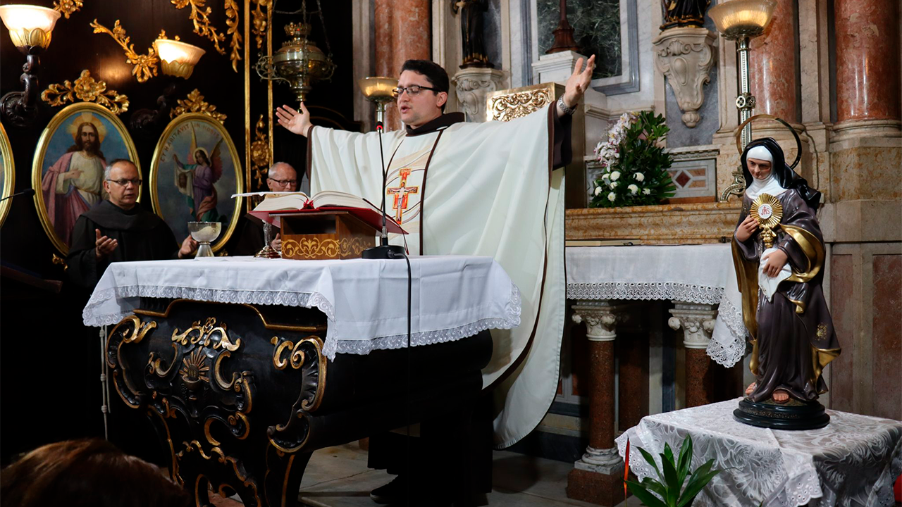 E concluiu: “Santa Clara não só visualizou a Missa, mas ela todos os dias, ao buscar o Corpo do Senhor, também foi se transformando cada vez mais nEle, a partir de sua vida, de tal modo que propõe a todas as suas filhas [Clarissas], e essa dica vale a cada um de nós, que na nossa experiência de fé, podemos rezar de um modo muito interessante, segundo Santa Clara. Devemos perceber Jesus como um espelho e considerando-o e contemplando-o, nos transformarmos naquele que vemos. O milagre dela ter assistido a Missa transmitida não foi só uma coisa qualquer, mas a demonstração de que aquele Senhor que ela em vida procurou o tempo inteiro, se espelhando nele, agora estava com ela e sempre esteve. Para nós fica esse convite: espelhemo-nos no Senhor! Tantas vezes a gente se espelha em pessoas, não é?! Lá nas redes sociais, às vezes, a gente tem alguém que faz uma receita, então a gente passa a seguir aquela pessoa porque ela faz uma receita boa, ou então, a gente se espelha numa outra pessoa para fazer o corte do cabelo, os homens para deixar a barba, ou então para usar algum tipo de roupa. É normal que nos espelhemos em alguns exemplos ou em algumas figuras, mas a partir da perspectiva cristã e inspirados em Santa Clara, espelhemo-nos no Senhor, olhando-o, considerando-o e contemplando-o. tenho certeza que assim como Santa Clara, vamos colher muitos frutos da presença Dele, porque Ele está conosco. Permanecei em mim e eu permanecerei em vós”, finalizou Frei Gabriel.
