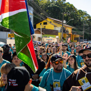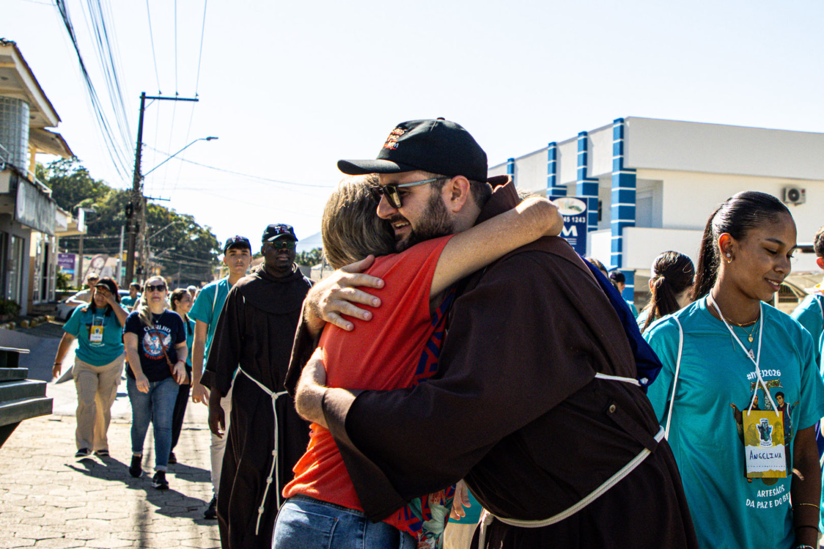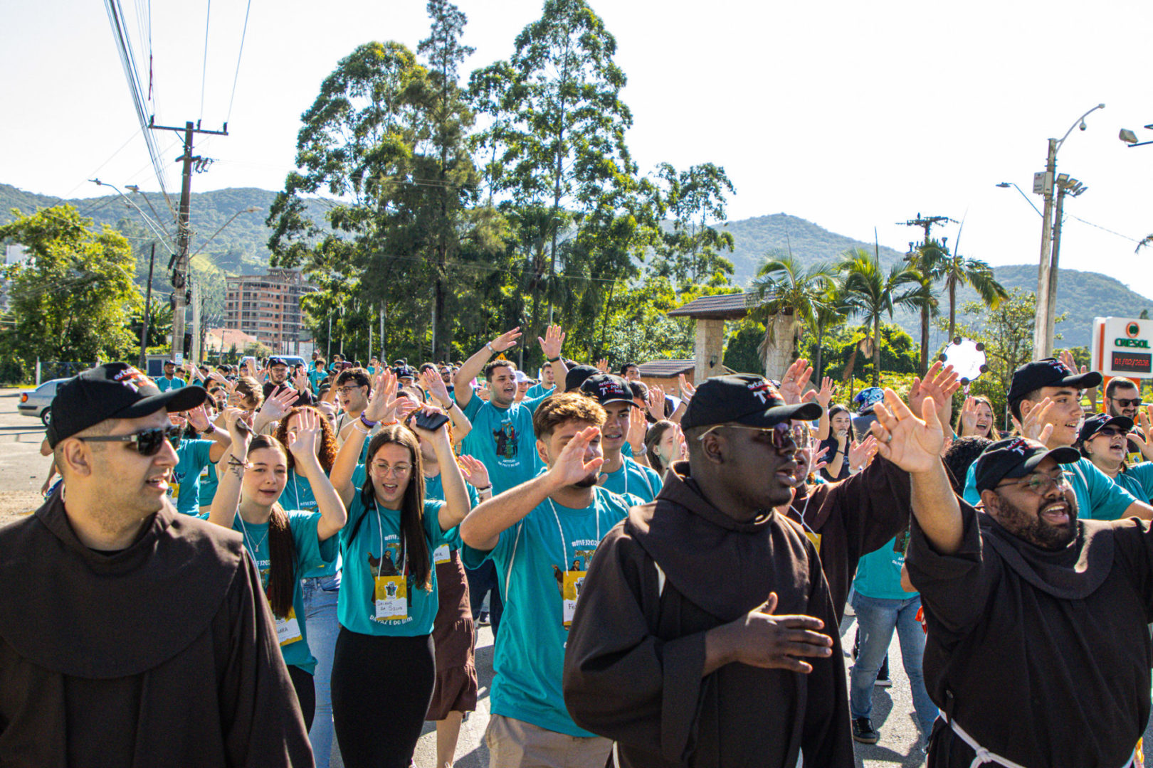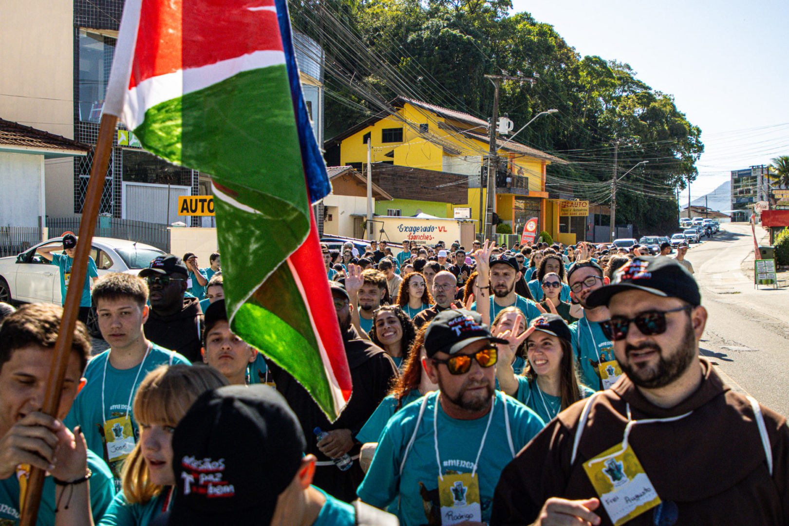 Dentro da programação do último dia da MFJ 2026, na manhã deste domingo (1º), os jovens participaram da Caminhada Franciscana até a Igreja Matriz de Santo Amaro da Imperatriz. A caminhada teve início no CTG Boca da Serra e reuniu centenas de jovens, além de familiares que acolheram os missionários durante os dias de missão.