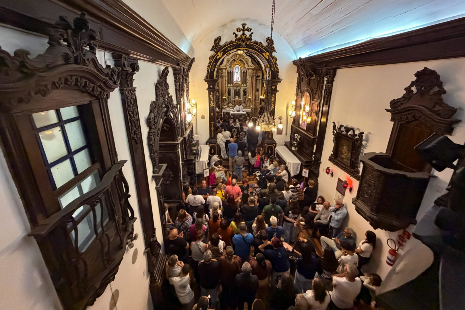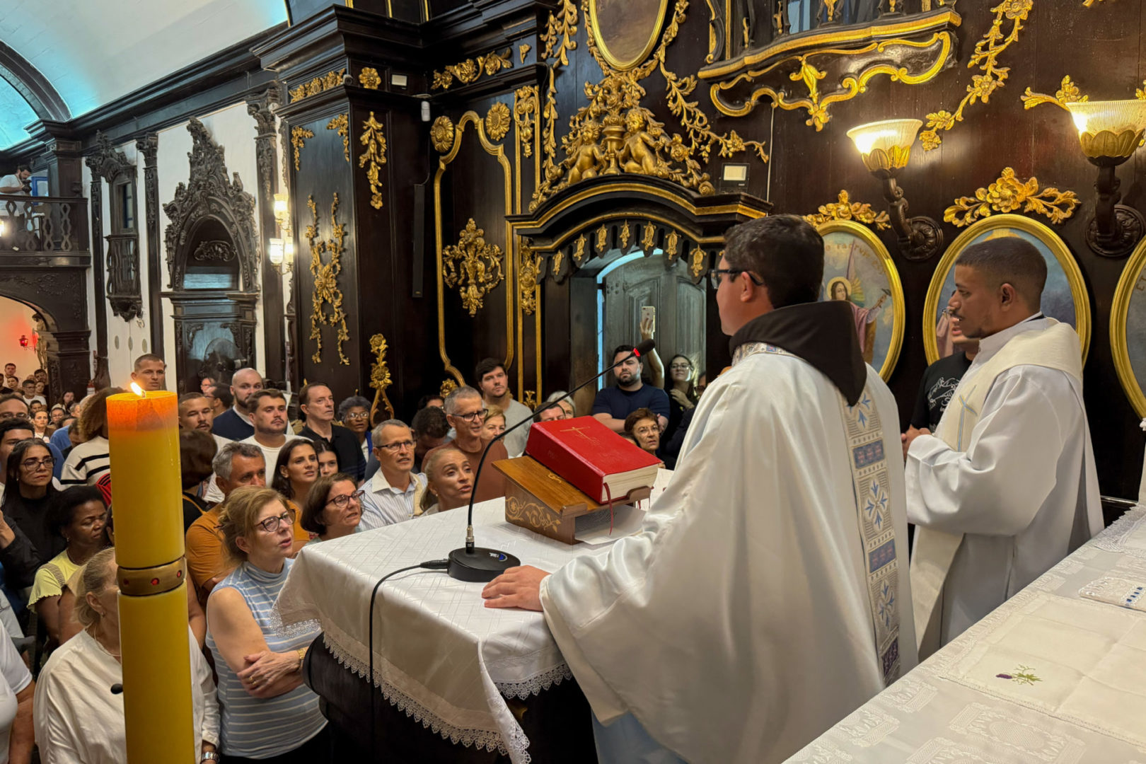 Vila Velha (ES) – Chamado de “Castelo da Paz” durante a homilia de Frei Gabriel Dellandrea, o Convento da Penha foi apresentado aos fiéis como um lugar marcado pela proteção divina e pela missão de irradiar a paz ao mundo. Ao recordar um episódio histórico do local, no qual invasores holandeses teriam recuado ao avistar um “exército vindo das nuvens” sobre o convento, o guardião destacou que, desde então, aquele espaço se tornou símbolo da presença de Deus que defende e envia seu povo. Foi neste cenário carregado de fé e significado que a primeira missa do dia, às 00h, da Padroeira do Espírito Santo, Nossa Senhora da Penha, reuniu uma multidão na madrugada desta segunda-feira, 13 de abril, na capela do convento, em Vila Velha. A celebração reuniu muitos fiéis, devotos e autoridades públicas, que lotaram não apenas o interior da capela, mas também o corredor lateral.