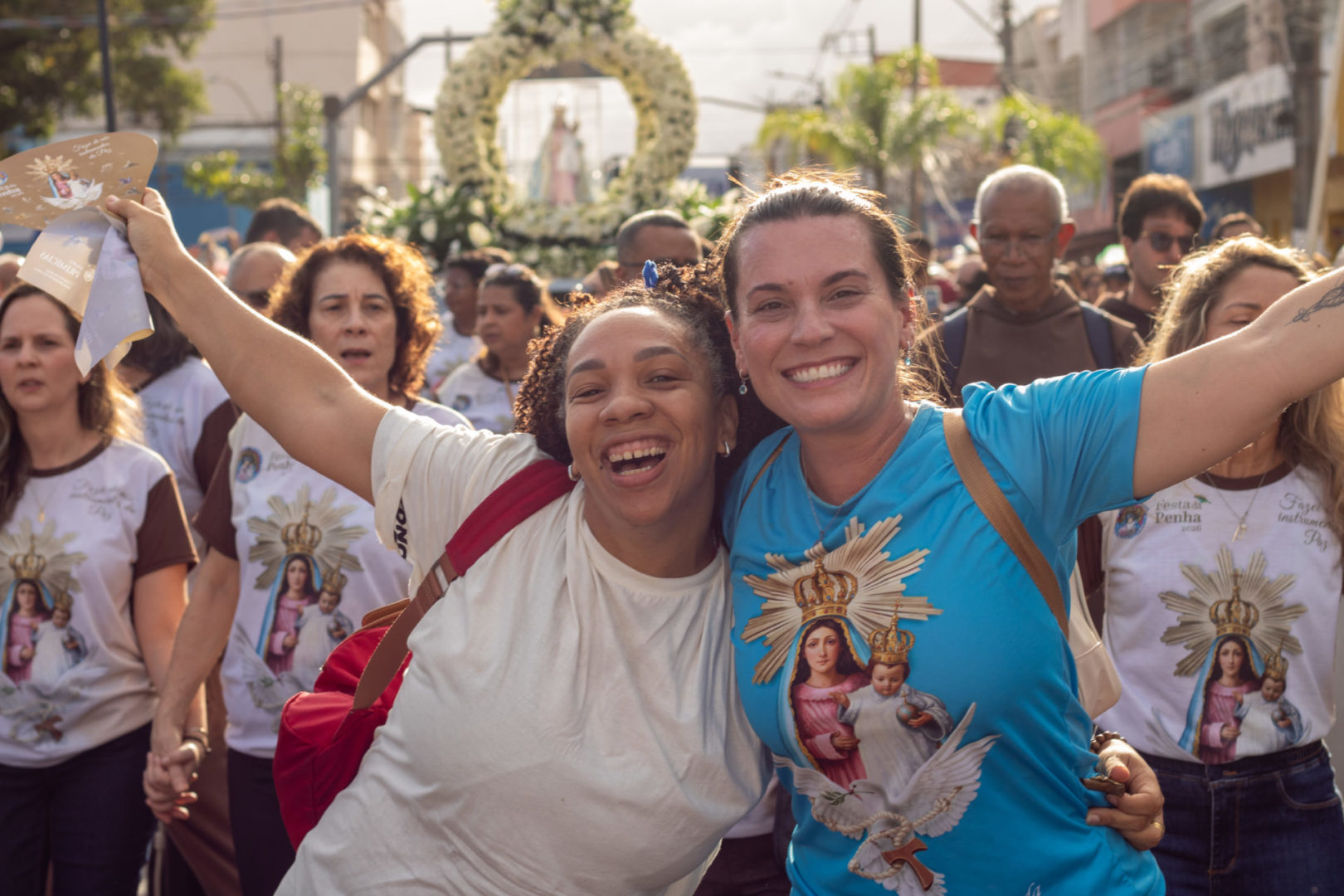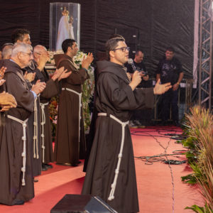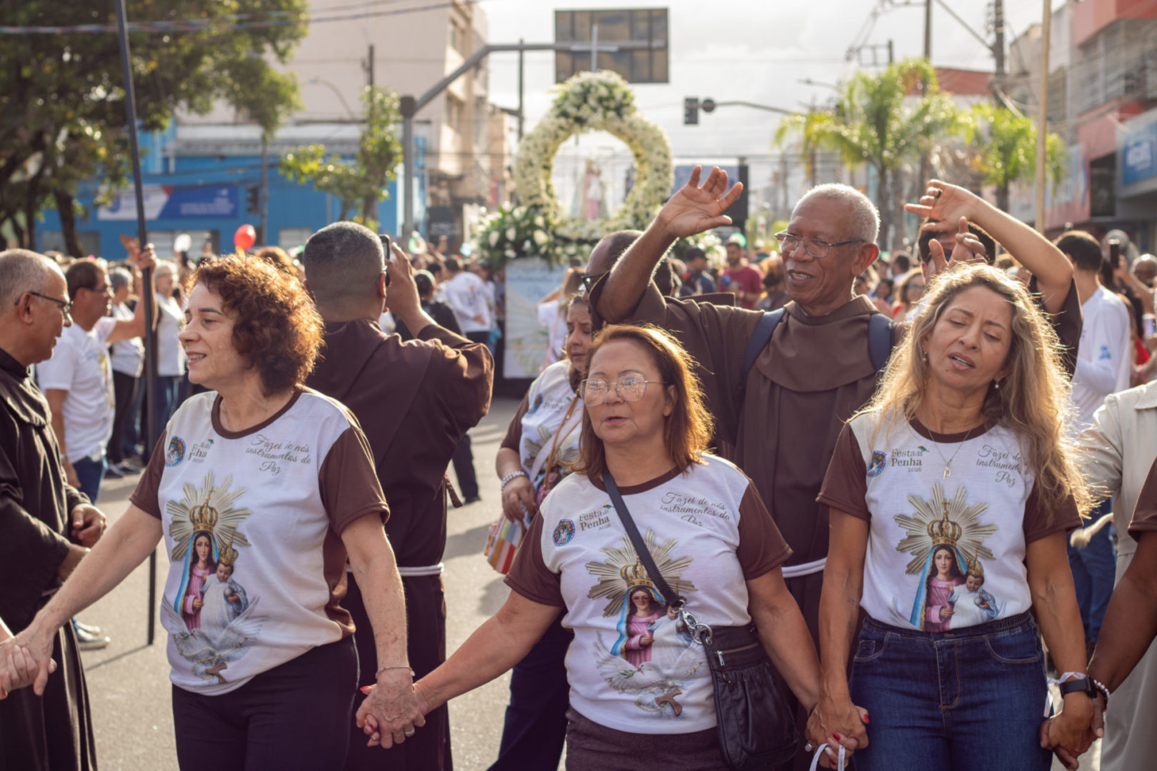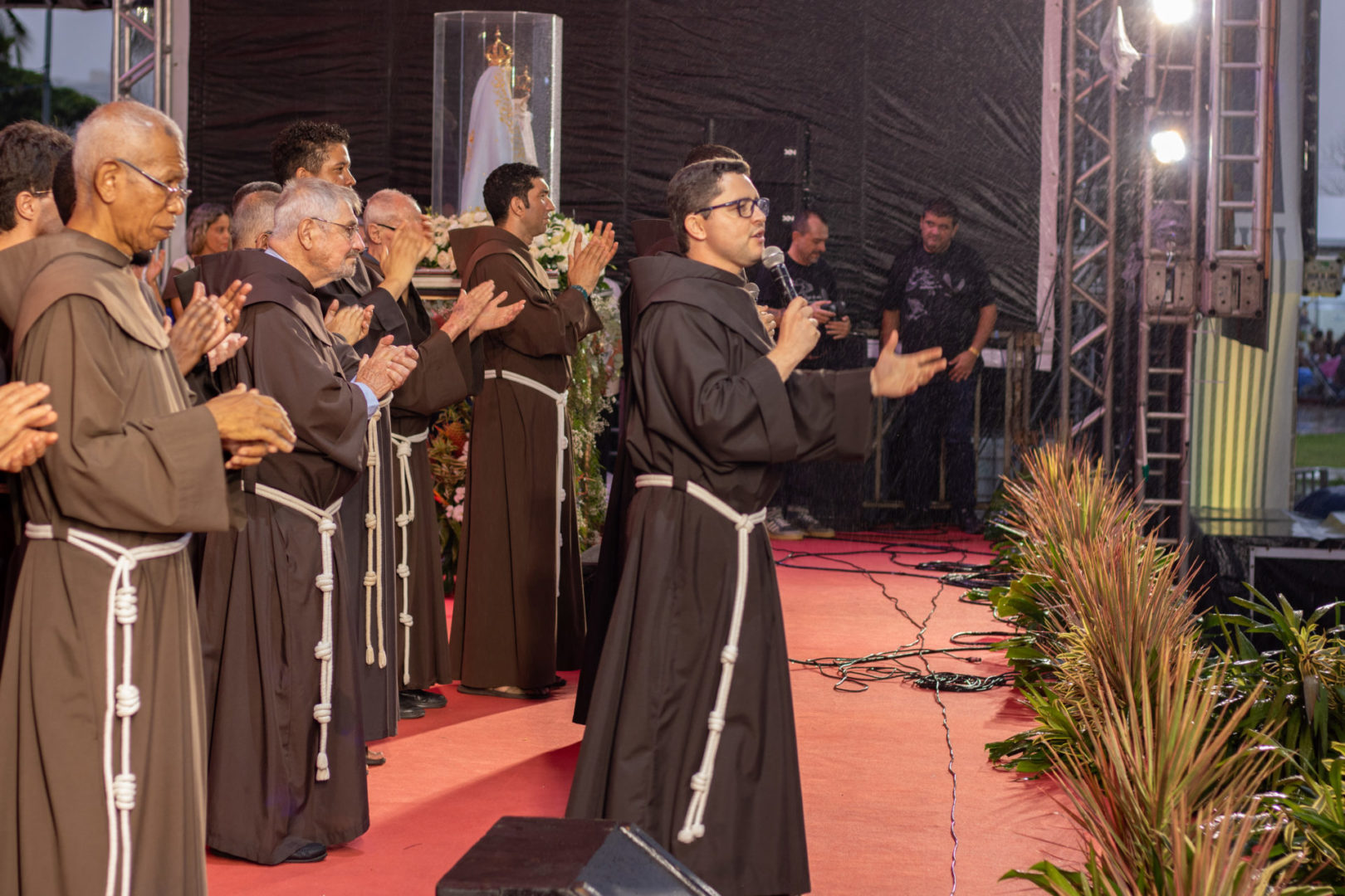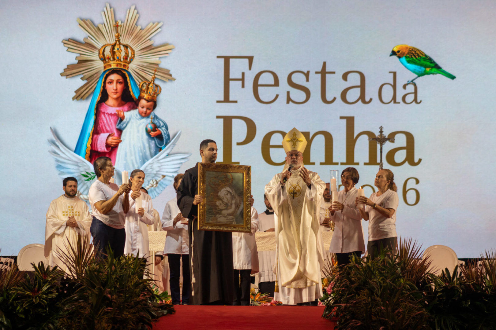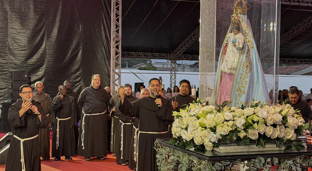 Após a comunhão, Frei Felipe Carreta, frade capixaba, em nome de todos os frades e rodeado por um grupo de sete mulheres vestidas de branco e com velas acesas, apresentou o quadro com a gravura de Nossa Senhora das Alegrias, trazido por Frei Pedro Palácios nos primórdios da história do Convento. No texto da homenagem um agradecimento e um apelo feitos por uma mulher em nome de todas as mulheres: “O sonho de tantas e tantas Marias entregamos ao Pai, na força do Filho, com a luz do Espírito e a proteção da Mãe que caminha conosco. Ela conhece nossas lágrimas, mas também nos ensina a reconhecer os sinais da vida nova. Em seu silêncio fecundo, aprendemos que o perdão é um milagre cotidiano e discreto, mas capaz de mudar destinos. Que, inspiradas por Maria, a Virgem da Penha, e fortalecidas pelo exemplo de Francisco e Clara, possamos sair daqui como quem carrega luz nas mãos: levando o perdão onde houver ofensa, a luz onde houver escuridão, a ternura onde houver dureza, a escuta onde houver gritos, e o amor onde ele ainda não é conhecido. Que a Mãe das Alegrias abençoe cada mulher, cada família, cada coração peregrino e todo o povo capixaba, hoje e sempre”. Após a missa, houve momento oracional conduzido pelo Movimento Mães que oram pelos filhos e show com a cantora Eliana Ribeiro.