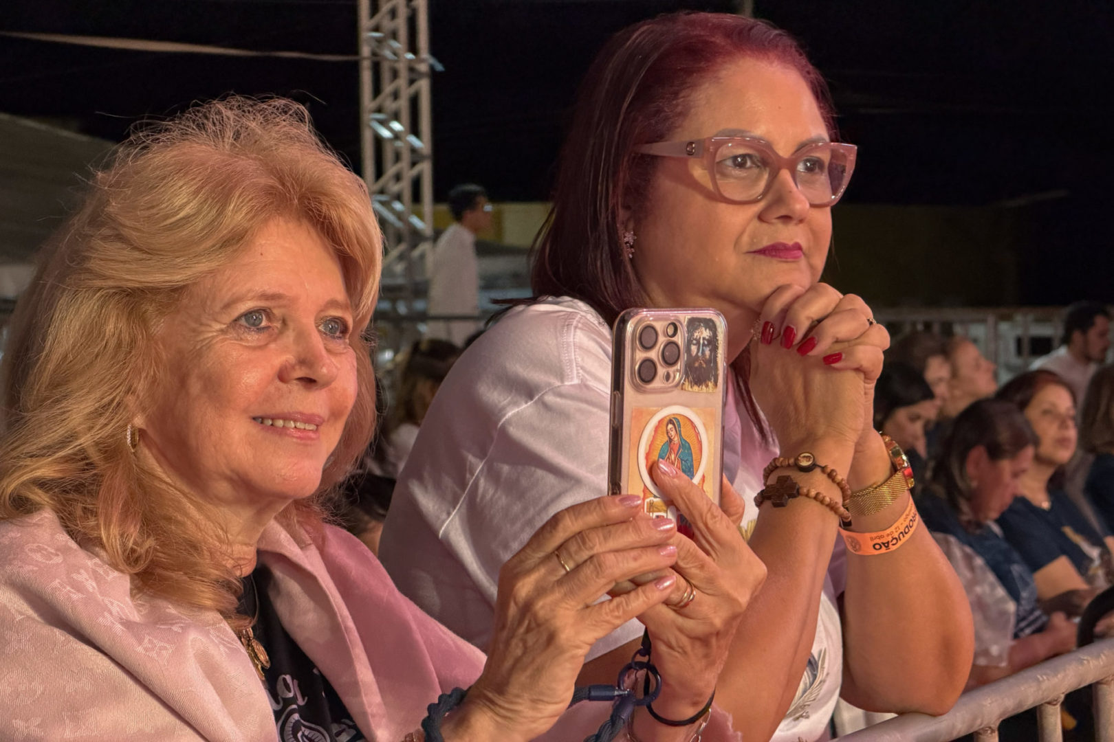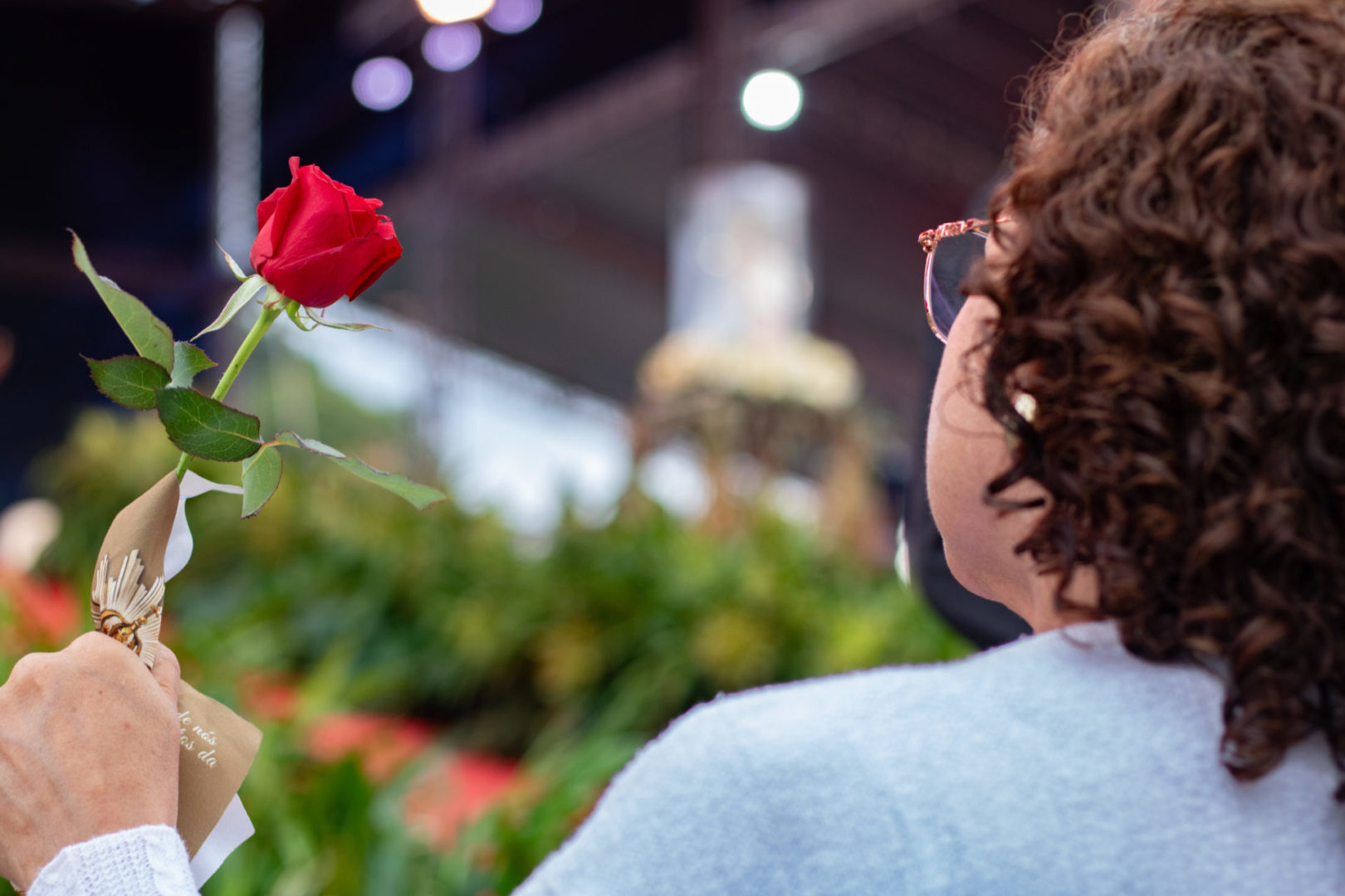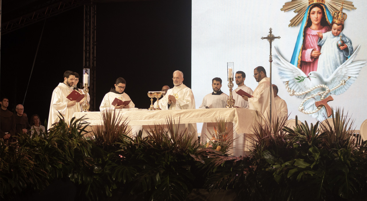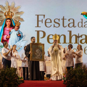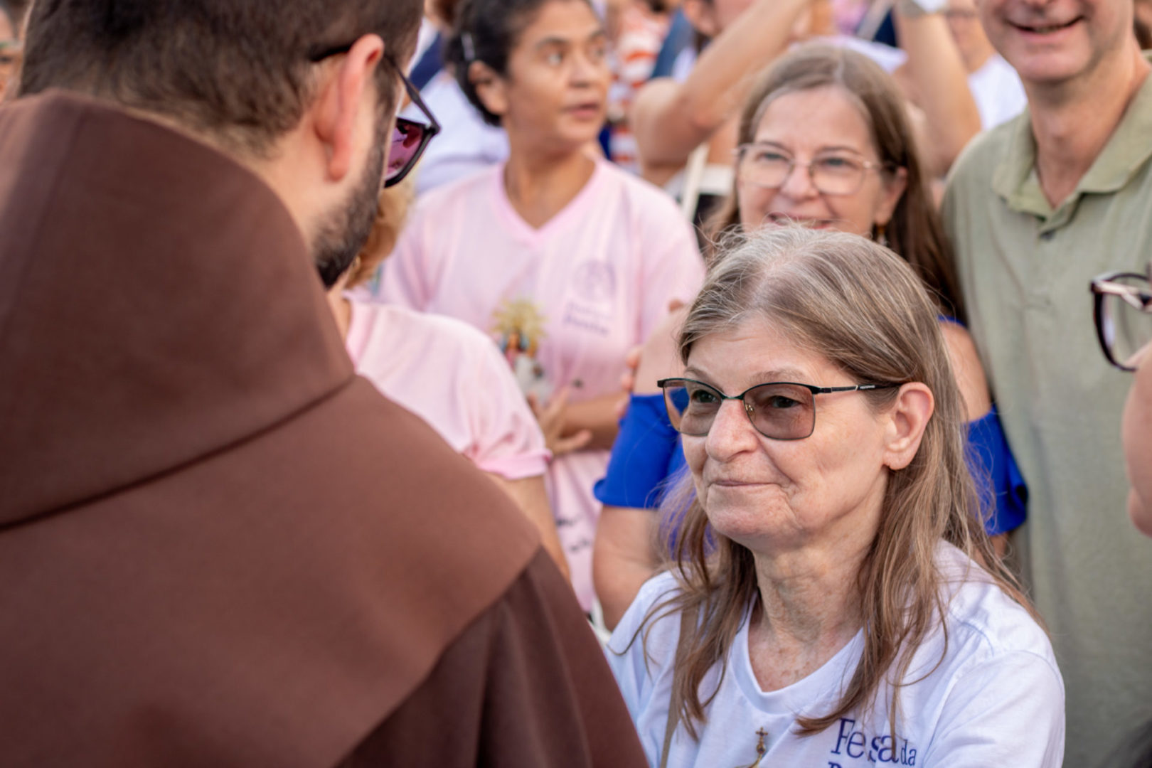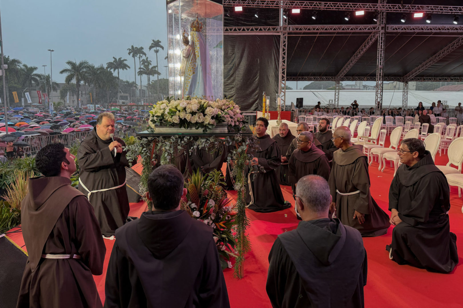 Após a comunhão, Frei Felipe Carreta, frade capixaba, em nome de todos os frades e rodeado por um grupo de sete mulheres vestidas de branco e com velas acesas, apresentou o quadro com a gravura de Nossa Senhora das Alegrias, trazido por Frei Pedro Palácios nos primórdios da história do Convento. No texto da homenagem um agradecimento e um apelo feitos por uma mulher em nome de todas as mulheres: “O sonho de tantas e tantas Marias entregamos ao Pai, na força do Filho, com a luz do Espírito e a proteção da Mãe que caminha conosco. Ela conhece nossas lágrimas, mas também nos ensina a reconhecer os sinais da vida nova. Em seu silêncio fecundo, aprendemos que o perdão é um milagre cotidiano e discreto, mas capaz de mudar destinos. Que, inspiradas por Maria, a Virgem da Penha, e fortalecidas pelo exemplo de Francisco e Clara, possamos sair daqui como quem carrega luz nas mãos: levando o perdão onde houver ofensa, a luz onde houver escuridão, a ternura onde houver dureza, a escuta onde houver gritos, e o amor onde ele ainda não é conhecido. Que a Mãe das Alegrias abençoe cada mulher, cada família, cada coração peregrino e todo o povo capixaba, hoje e sempre”. Após a missa, houve momento oracional conduzido pelo Movimento Mães que oram pelos filhos e show com a cantora Eliana Ribeiro.