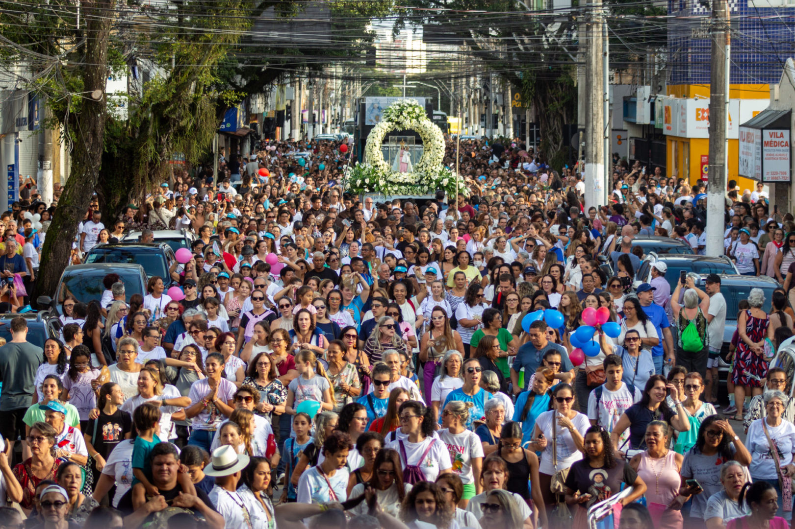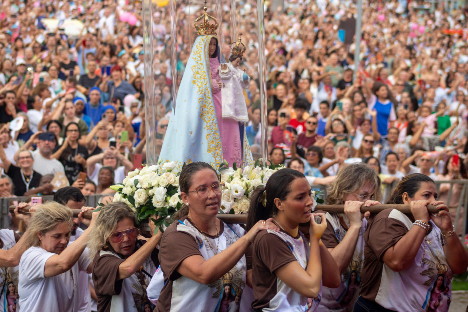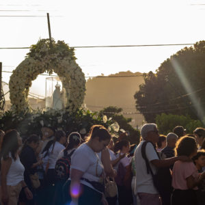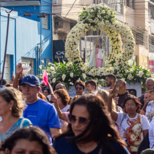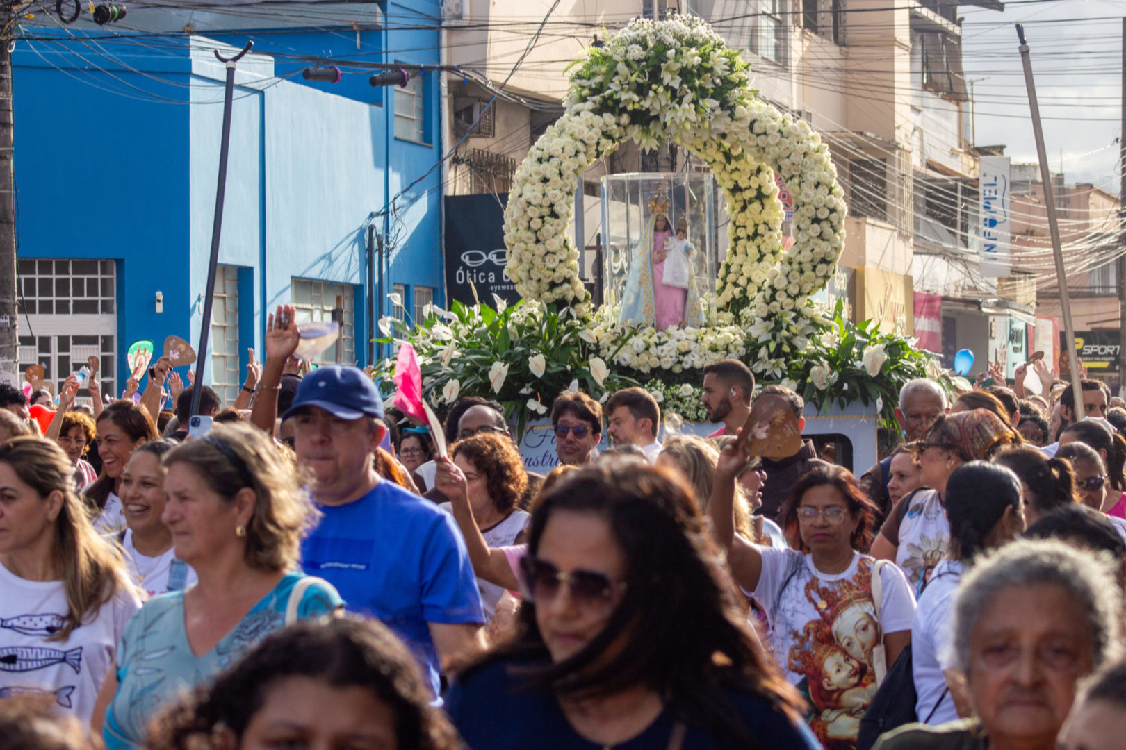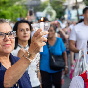 Vila Velha (ES) – Momento de destaque e muito esperado na Programação da Festa da Penha, a Romaria das Mulheres ocorreu na tarde deste domingo. A concentração foi no Santuário do Divino Espírito Santo, de onde as mulheres partiram em romaria rumo ao Parque da Prainha às 15h30. Durante o percurso, o tempo estava nublado com um leve mormaço e temperatura agradável. No entanto, pouco depois da chegada ao destino e da subida da imagem ao palco, recebida com honras reais e toques de clarins, bem no momento da reflexão do último dia do oitavário, uma chuva constante começou a cair, engrossando aos poucos, transformando o Parque da Prainha num imenso mosaico colorido de guarda-chuvas.