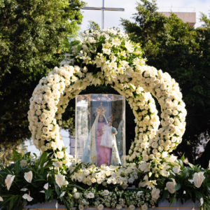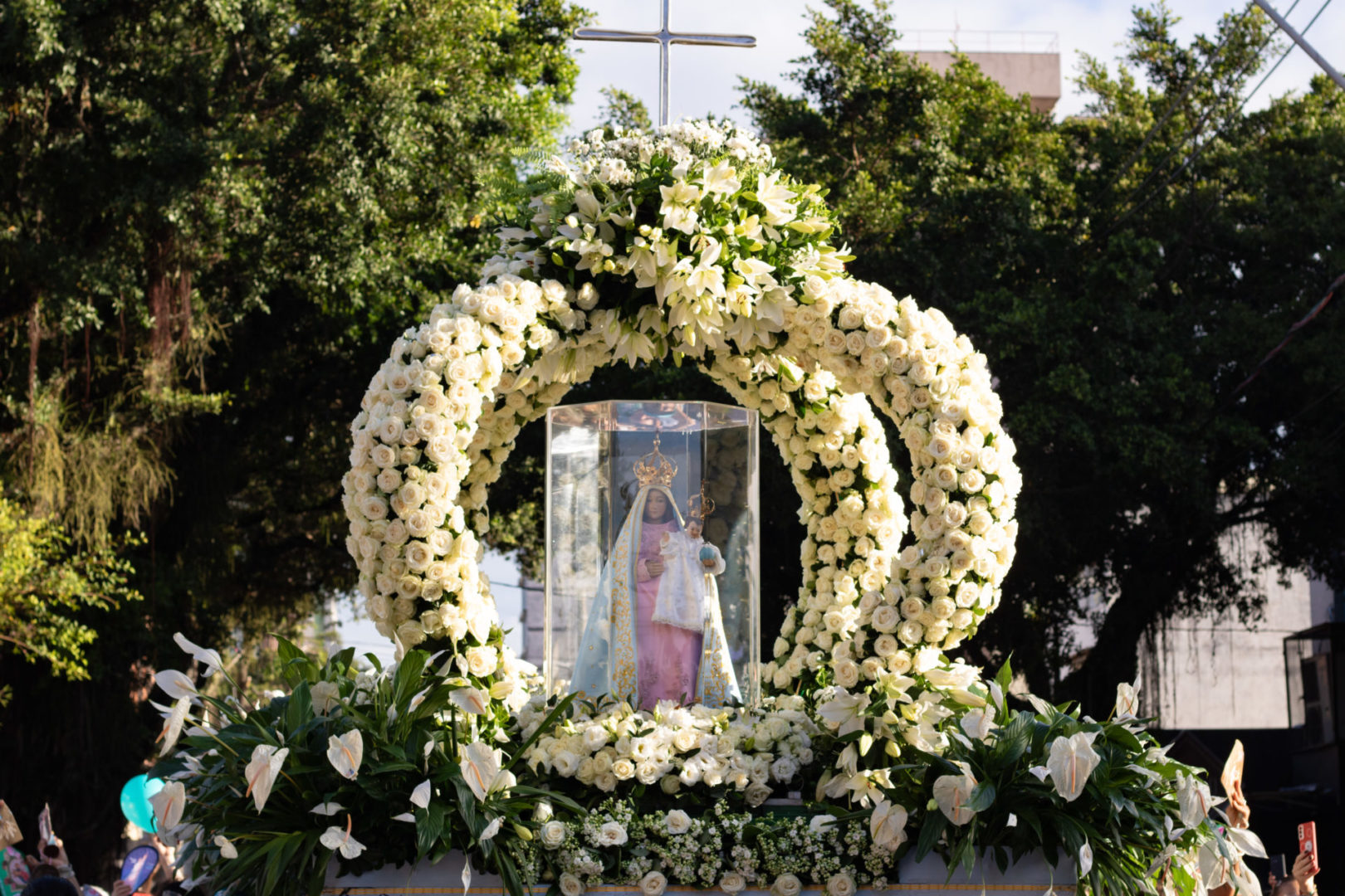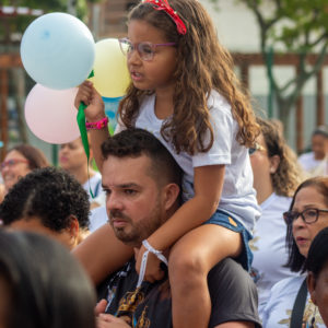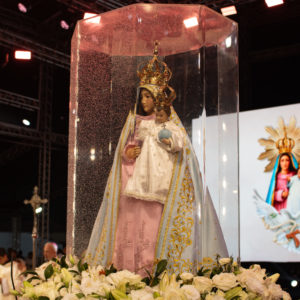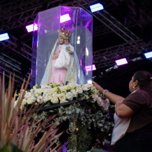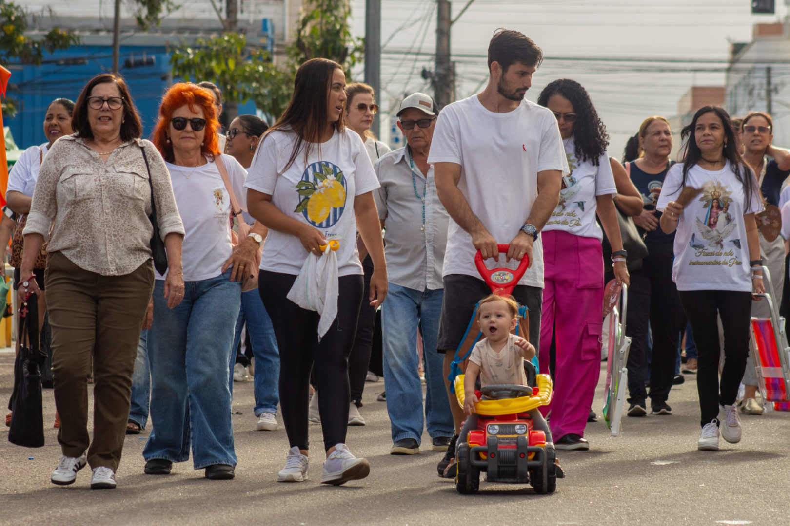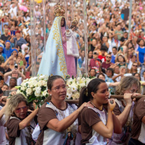 Vila Velha (ES) – Momento de destaque e muito esperado na Programação da Festa da Penha, a Romaria das Mulheres ocorreu na tarde deste domingo. A concentração foi no Santuário do Divino Espírito Santo, de onde as mulheres partiram em romaria rumo ao Parque da Prainha às 15h30. Durante o percurso, o tempo estava nublado com um leve mormaço e temperatura agradável. No entanto, pouco depois da chegada ao destino e da subida da imagem ao palco, recebida com honras reais e toques de clarins, bem no momento da reflexão do último dia do oitavário, uma chuva constante começou a cair, engrossando aos poucos, transformando o Parque da Prainha num imenso mosaico colorido de guarda-chuvas.