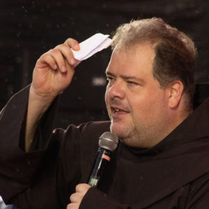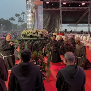 Prosseguindo a reflexão, recordou a necessidade de os homens realizarem um grande pedido de perdão às mulheres, por toda violência e injustiça praticada contra elas ainda hoje. E, para expressar simbolicamente a súplica dos homens pelo perdão de Deus, convidou todos os frades a se colocarem junto com ele de joelhos diante de Nossa Senhora. “Para vivermos bem o perdão, precisamos nos converter do individualismo para a Comunhão, da competição para a colaboração e do sentimento de posse para o Sentido de Pertença”, explicou. “Uma das frases mais escandalosas e absurdas que podemos ouvir da boca de um homem é: ‘ela e minha e, se não for minha, não será de mais ninguém!’ Esta frase deve ser abolida de todo coração e de toda boca. Todos pertencemos a Deus e ninguém é de ninguém”, concluiu. Seguindo a tradição de abençoar um objeto diferente a cada dia do oitavário, o Guardião, Frei Gabiel Dellandrea, abençoou os guarda-chuvas abertos, mencionandos como sinal da proteção de Deus na vida de seus filhos e filhas.