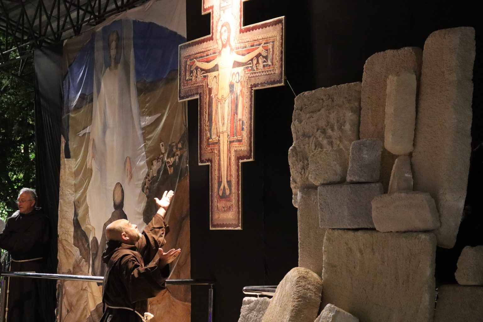 Durante a apresentação, o ator representando São Francisco de Assis se colocou ajoelhado diante do Crucifixo de São Damião, como narra a história. “O jovem Francisco encontrava-se numa crise espiritual, cheio de dúvidas e trevas. ‘Conduzido pelo Espírito’, entra na igrejinha de São Damião, onde se prostra, súplice, diante do Crucifixo. Tocado de modo extraordinário pela graça divina, encontra-se totalmente transformado. É então que a imagem de Cristo Crucificado lhe fala: ‘Francisco, vai e repara minha casa que está em ruína’.”