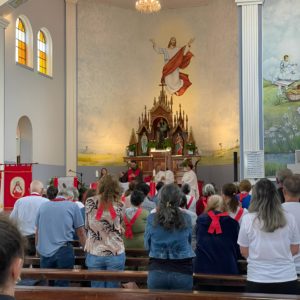 Às 15h, a Celebração Eucarística foi presidida por Frei Danilo Santos Oliveira. Na procissão de entrada, o estandarte do Sagrado Coração de Jesus. No comentário e leituras, representantes das comunidades de Marema, Lajeado e Matriz. Nos cantos, a Comunidade anfitriã de Lajeado Grande.