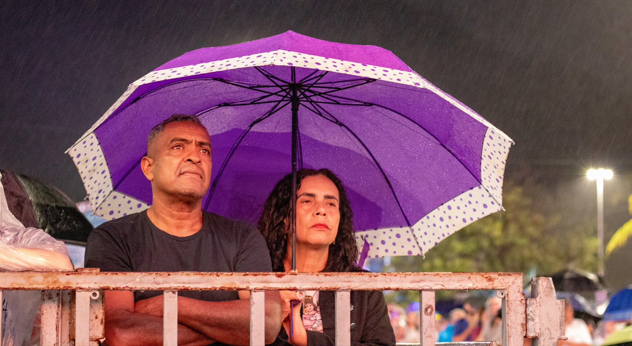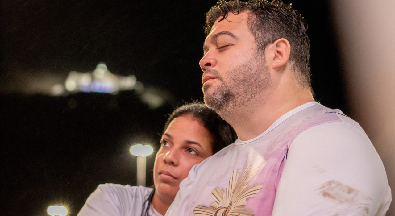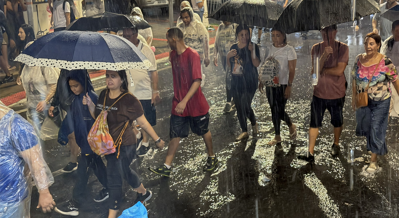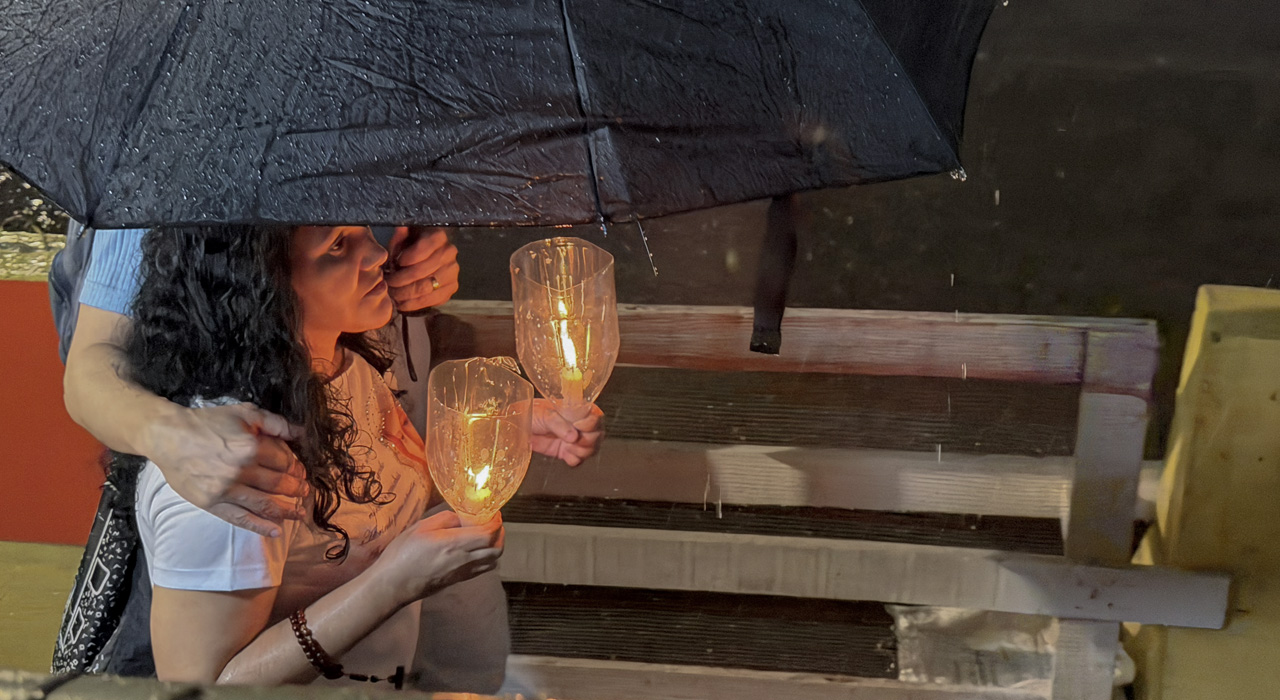 Muitas velas acesas, diversas apagadas pela chuva, que começou fraca e foi se intensificando. A chuva começou pelas 20h no Parque da Prainha, caindo sobre os peregrinos a partir do final da travessia da 2ª Ponte. As velas são sinal da luz divina, capaz de iluminar as dobras do coração humano. A escuridão é lugar do medo, da desconfiança, do receio de seguir adiante. Consolador perceber que, à semelhança das velas apagadas pela chuva, a luz pessoal de cada um pode ser sempre re-acesa. Basta aproximar-se novamente do Espírito Santo, Luz que aquece e ilumina. Bonito perceber que, nesta hora, aquele que mantém a vela interior acesa, pode se aproximar de um irmão ou irmã que esteja com ela apagada. E, neste caso, com a Luz de Cristo, apresentada e oferecida pela Mãe da Luz, cada discípulo adquire a força e o poder de levar luz onde houver trevas.